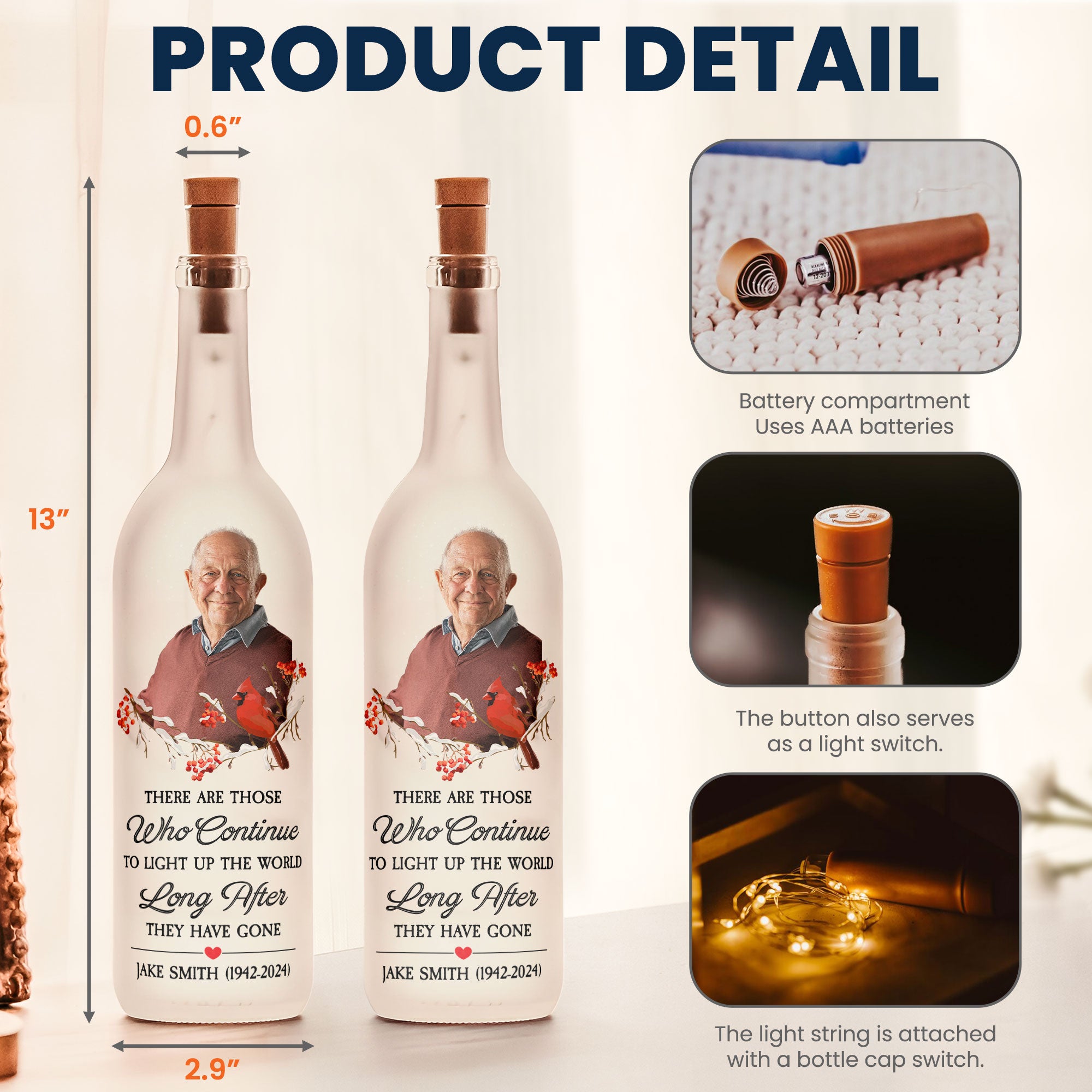 + Cork Lid: Features a realistic cork stopper on top, giving the lamp a charming vintage bottle appearance. A simple switch allows you to easily turn the lights on or off and enjoy the romantic glow of the LED fairy lights.