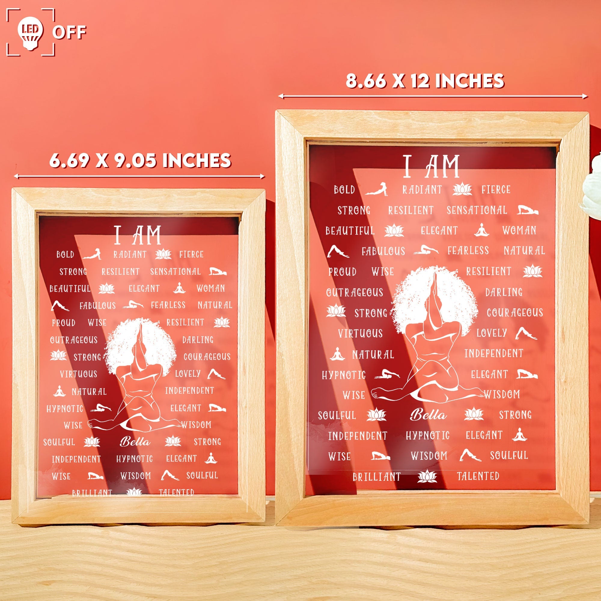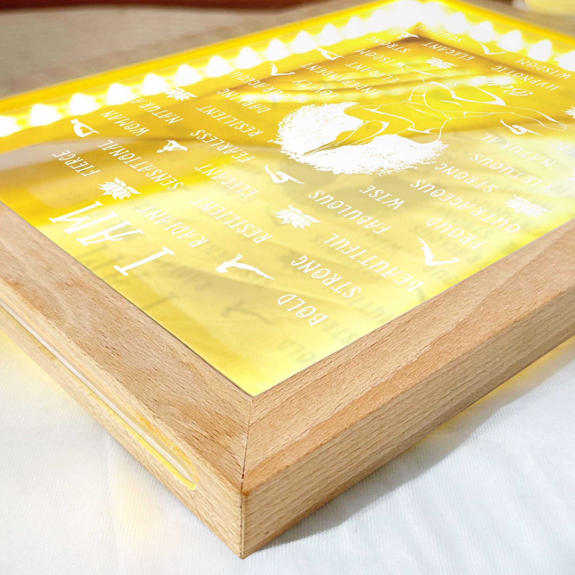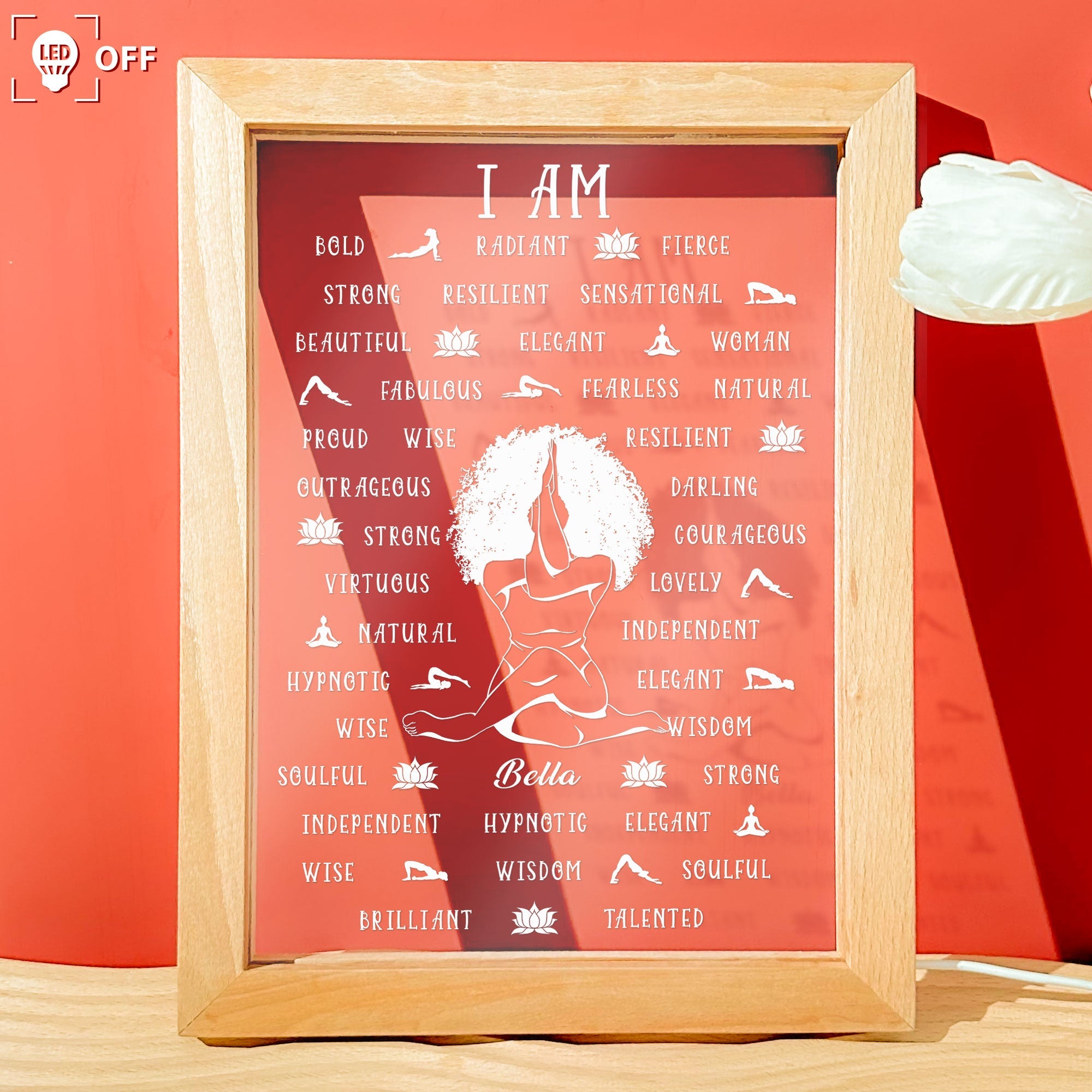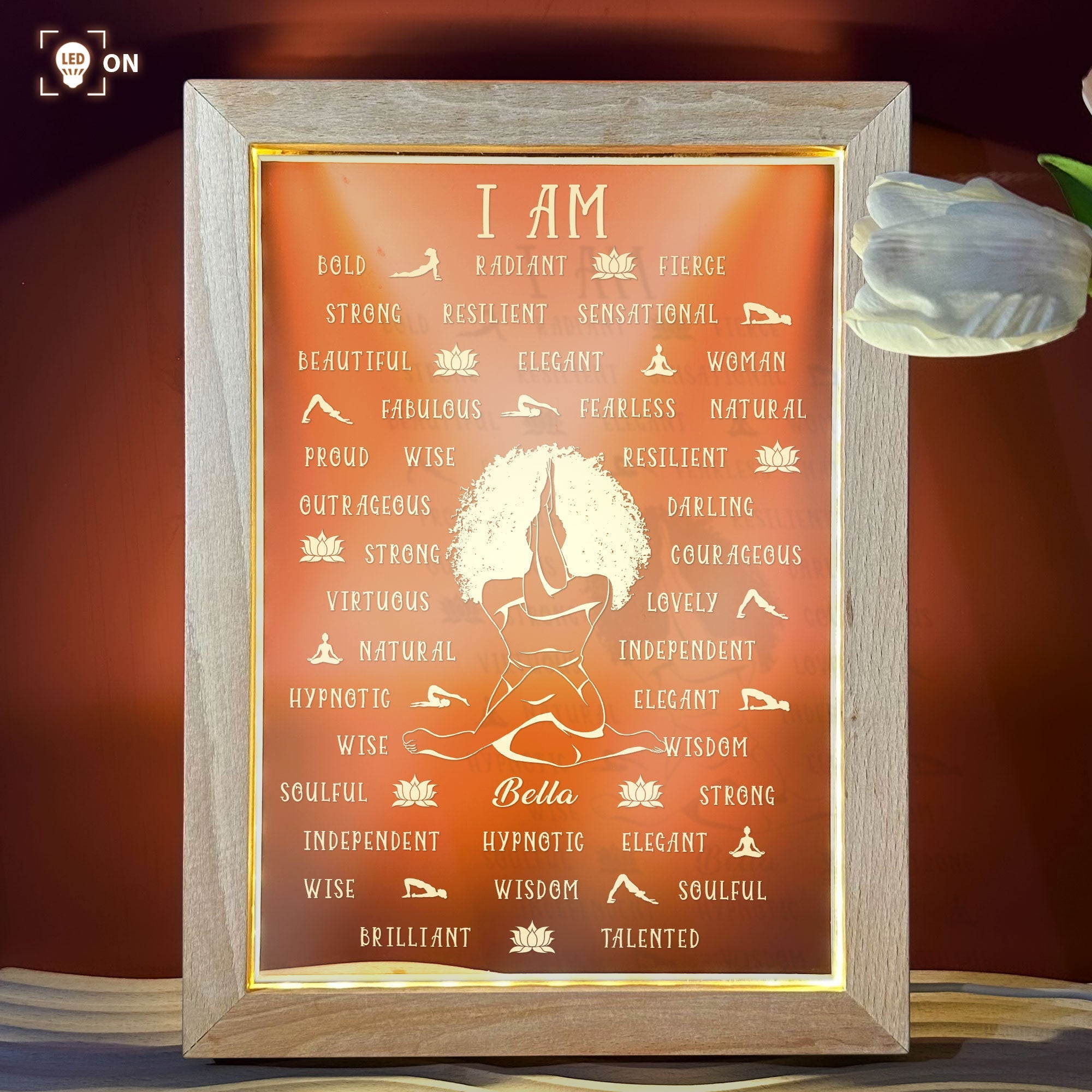 Brighten up your day and your home with this beautiful personalized frame lamp. This lamp features a design of a character that looks like you, surrounded by affirmation words that inspire and motivate you. You can customize the character to match your appearance, making this a truly unique and personal gift.
