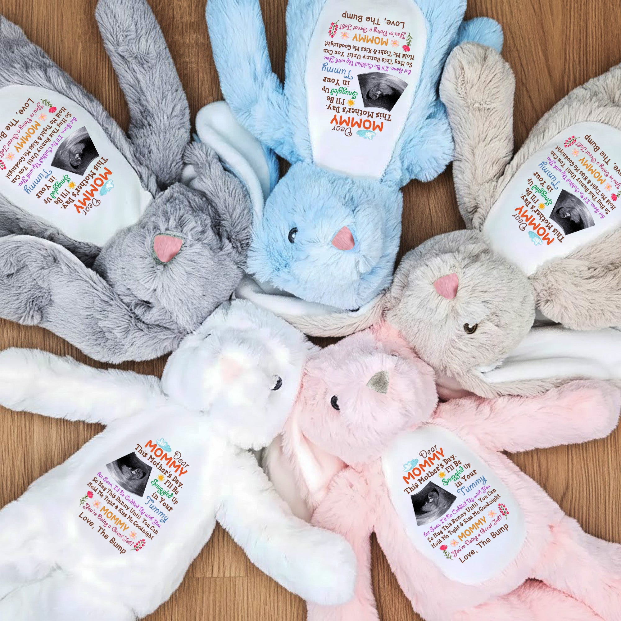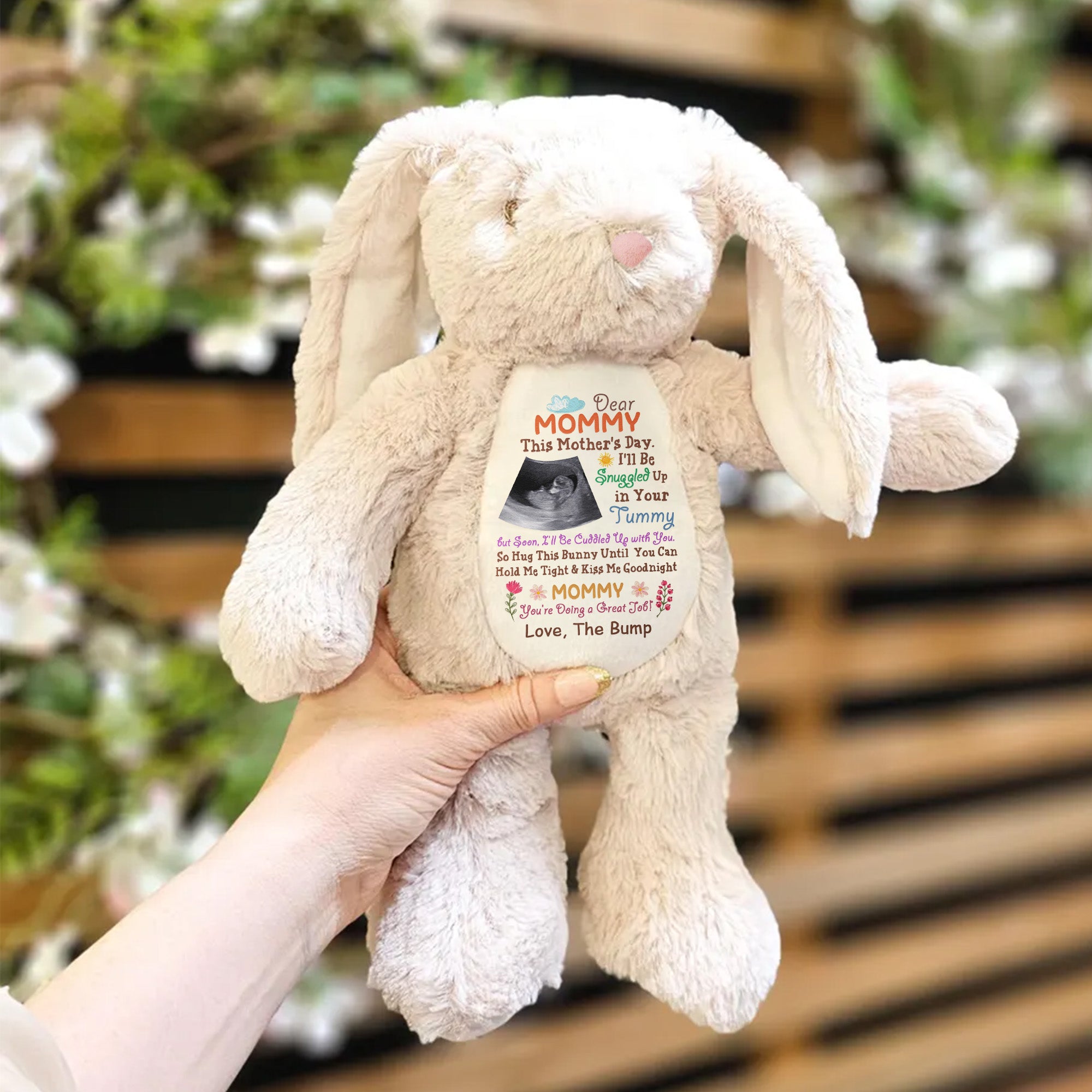 Introduce some extra warmth to Mother's Day this year with our stunning personalized plush bunny. It's a fun-filled gift idea designed to bring mom-to-be even closer to her adorable tiny bump. Secluded in mom’s womb, the little one may not yet be ready for her first cuddle, but our snug bunny plush has got that part covered. The loving message, albeit not explicit, tugs at the heartstrings, encouraging mommy to snuggle the toy, in anticipation of the tight embrace she will soon share with her yet to be born child.