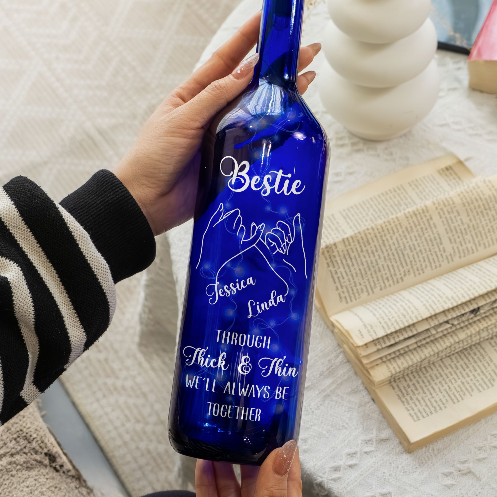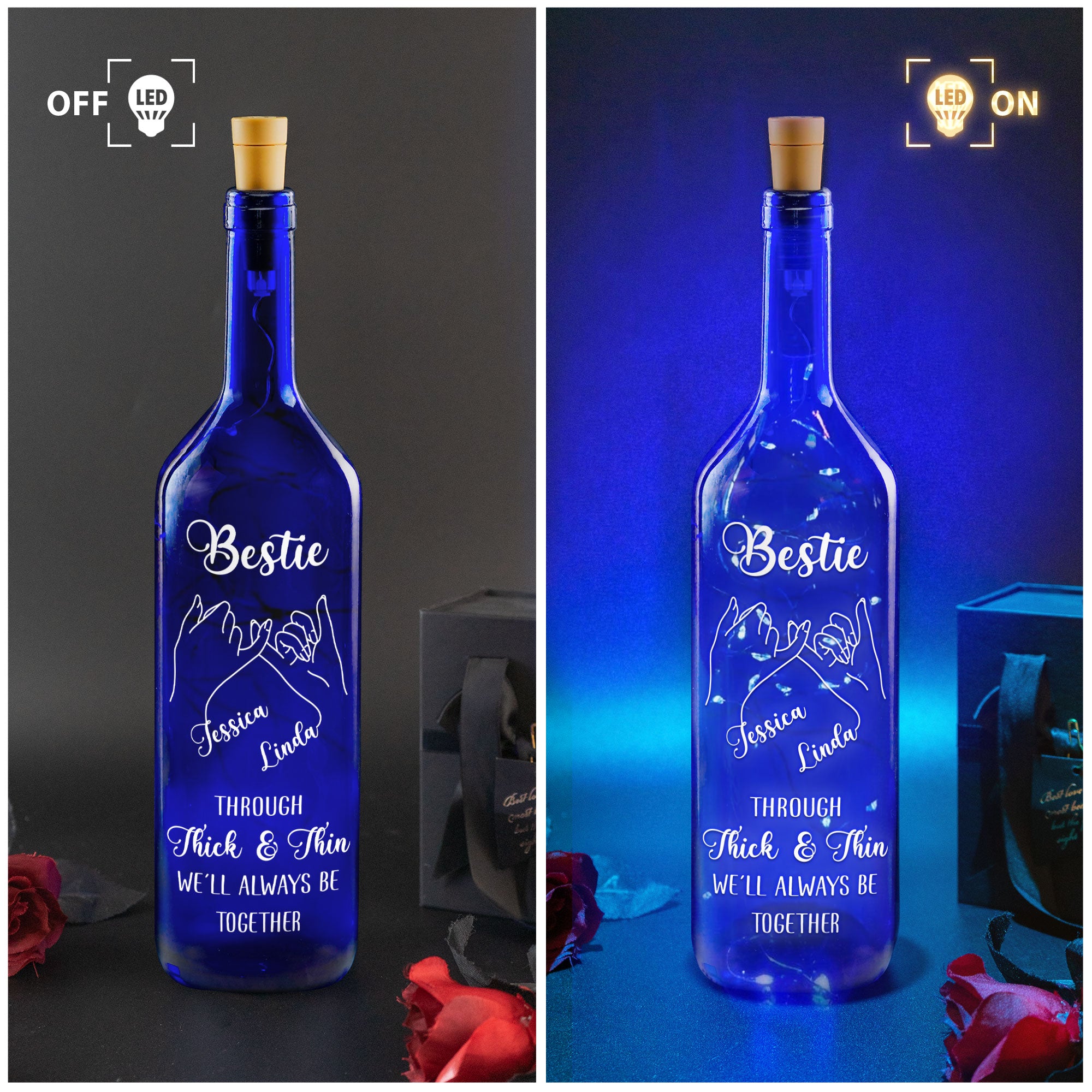 Celebrate the unbreakable bond of friendship with a stunning blue bottle lamp, featuring the heartfelt message "Through Thick And Thin, We'll Always Be Together." This beautiful lamp is a perfect gift for your bestie, symbolizing the love and support you share. Its vibrant blue design adds a touch of elegance to any room, making it a delightful addition to home decor. When lit, the lamp casts a warm glow, creating a cozy atmosphere that reflects the warmth of your friendship. Whether it’s for a birthday, a special occasion, or just because, this lamp serves as a daily reminder of the lifelong connection you have. Brighten your best friend's space and celebrate your enduring friendship with this thoughtful and meaningful gift!