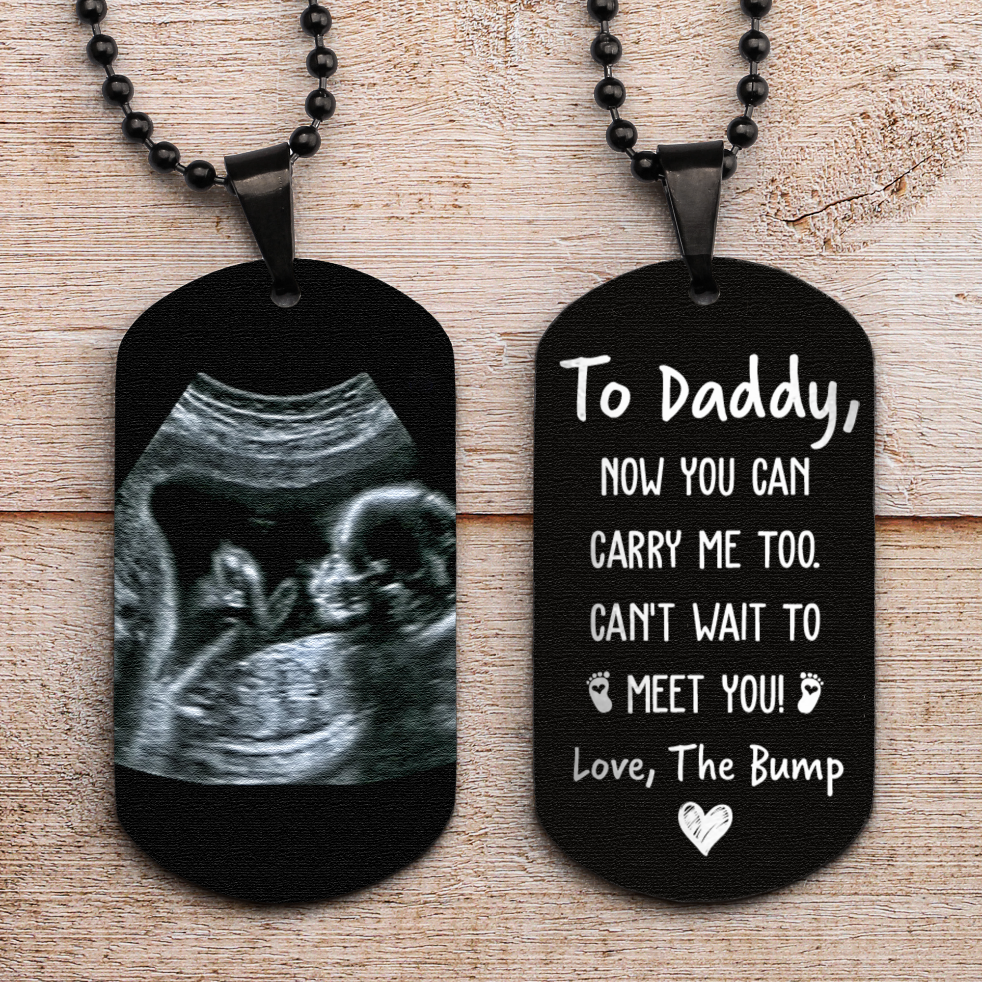 The back of the dog tag features the touching message, "To Daddy, Now You Can Carry Me Too. Can't Wait To Meet You!" This heartfelt inscription adds a personal touch and serves as a constant reminder of the joy and love that awaits him.
