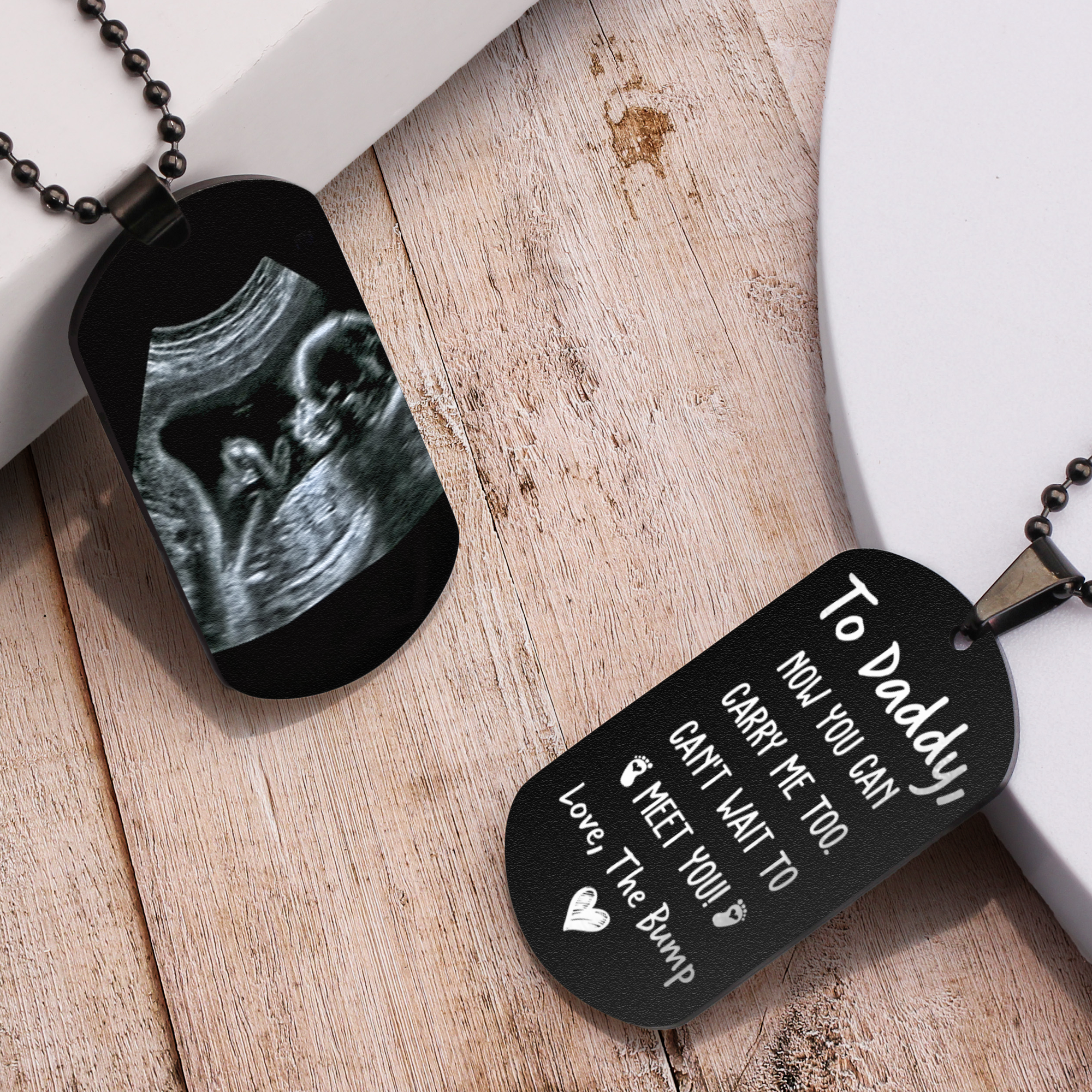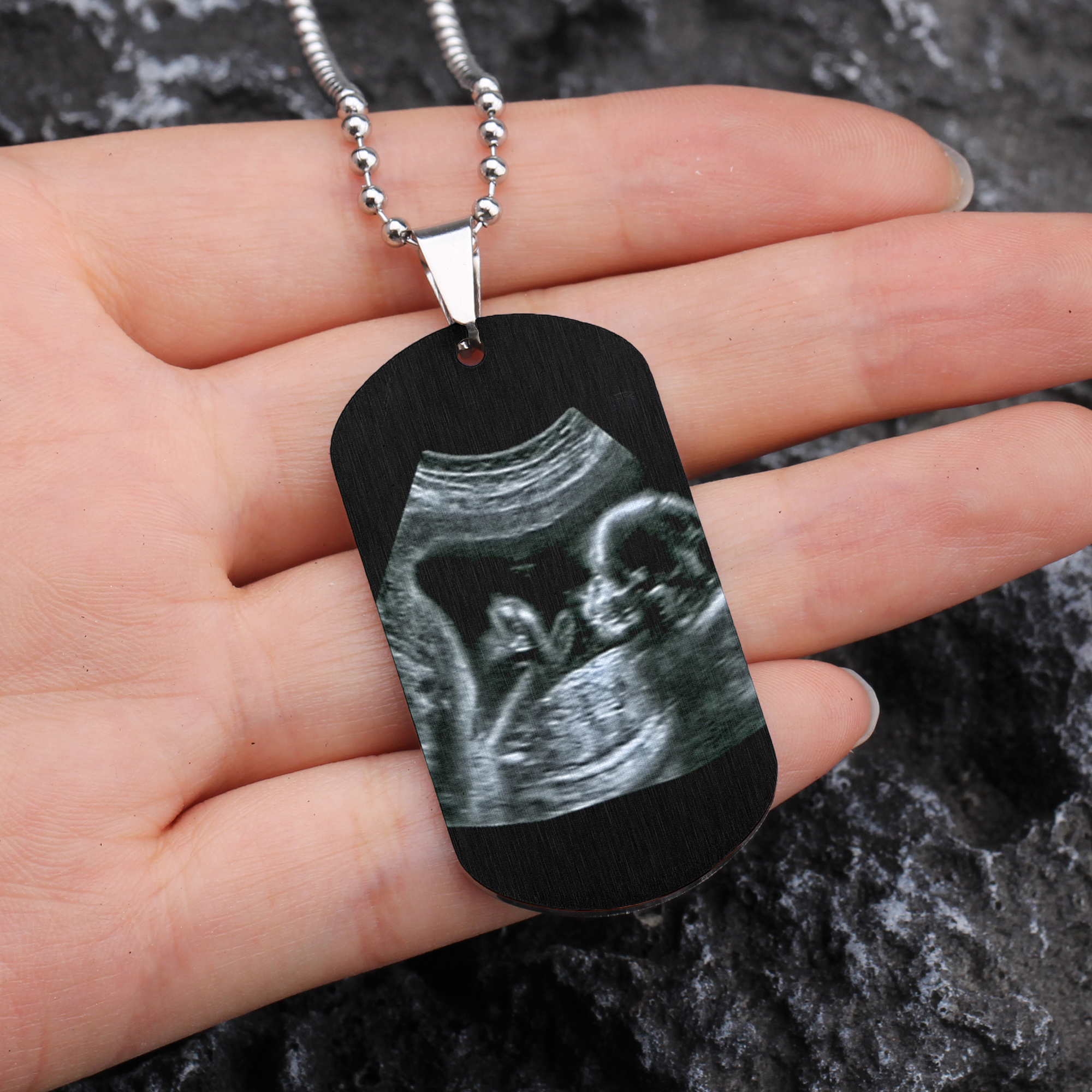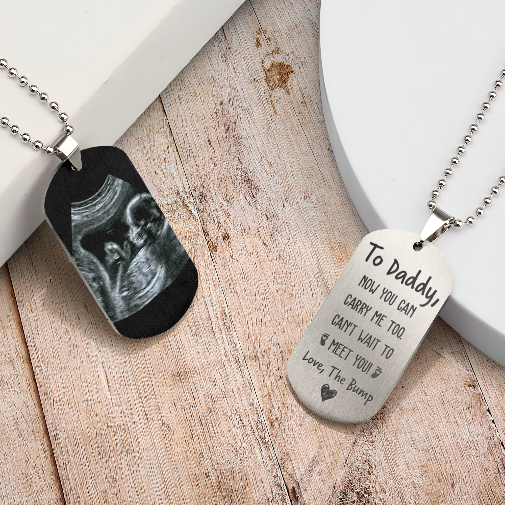 Celebrate the special journey of parenthood with our Personalized Photo Dog Tag Necklace for Dad from the Bump. This thoughtful and heartfelt gift allows him to carry the memory of his little one close to his heart even before they've met, creating a beautiful connection between father and child. The highlight of our necklace is the custom ultrasound photo printing. Personalize the dog tag with the ultrasound image of his future child, creating a bespoke keepsake that captures the anticipation and excitement of the upcoming arrival. The photo is engraved with precision, preserving the details and offering a beautiful and unique memento.