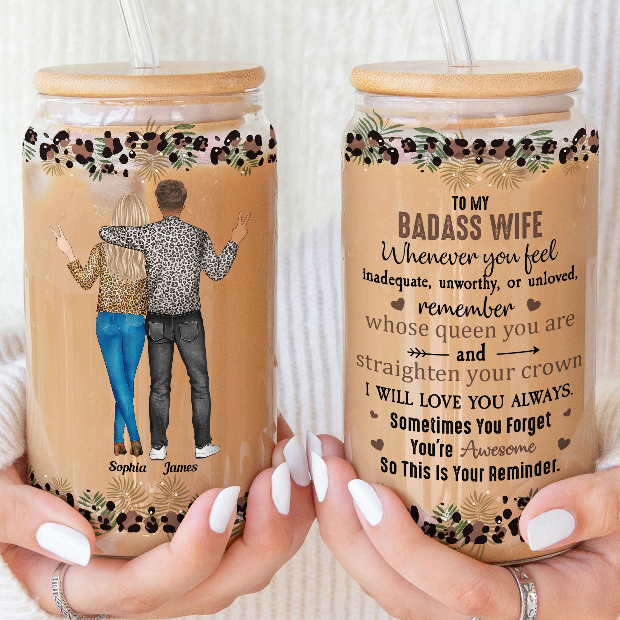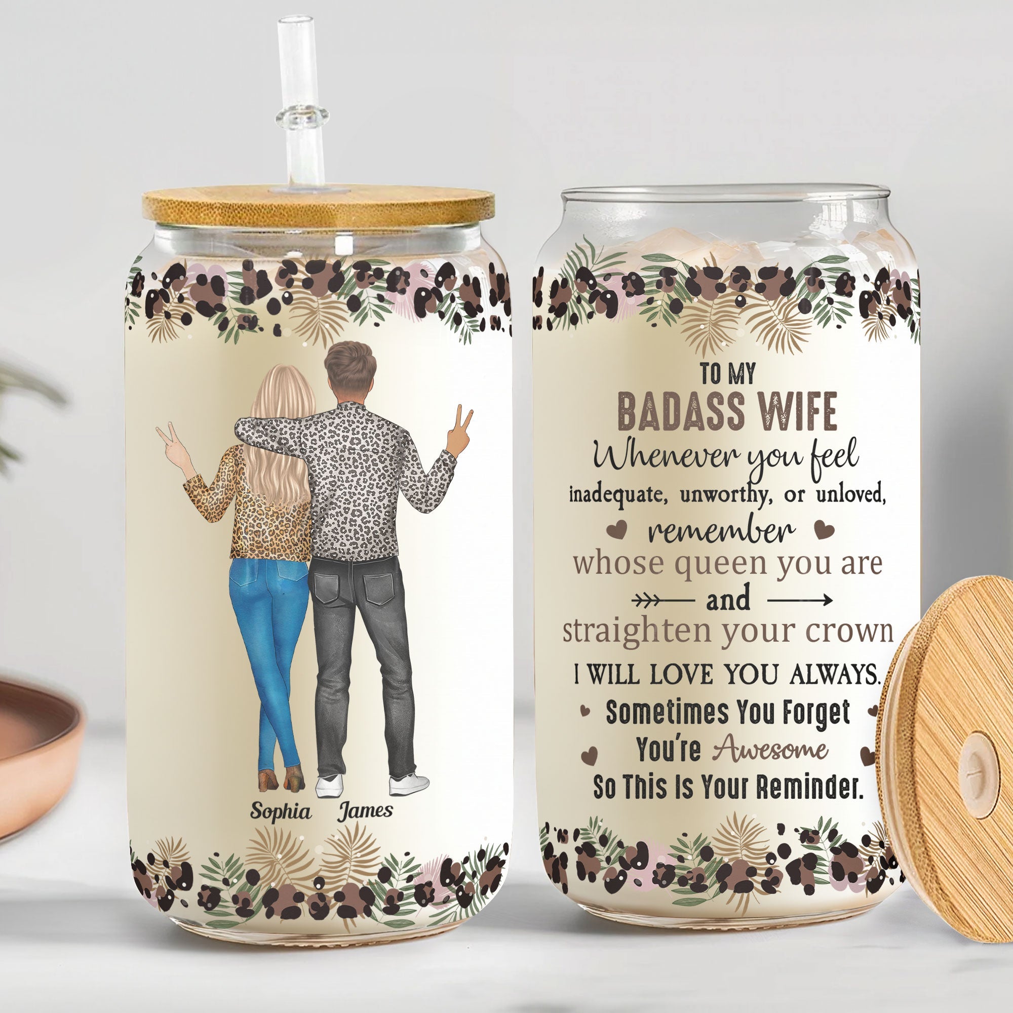 Raise a toast to your badass wife with our Personalized Clear Glass Can. This unique and thoughtful gift is perfect for various occasions, whether it's her birthday, anniversary, Christmas, or Thanksgiving. The clear glass can features a special message, "To My Badass Wife From Husband," expressing your admiration and love for the incredible woman she is.