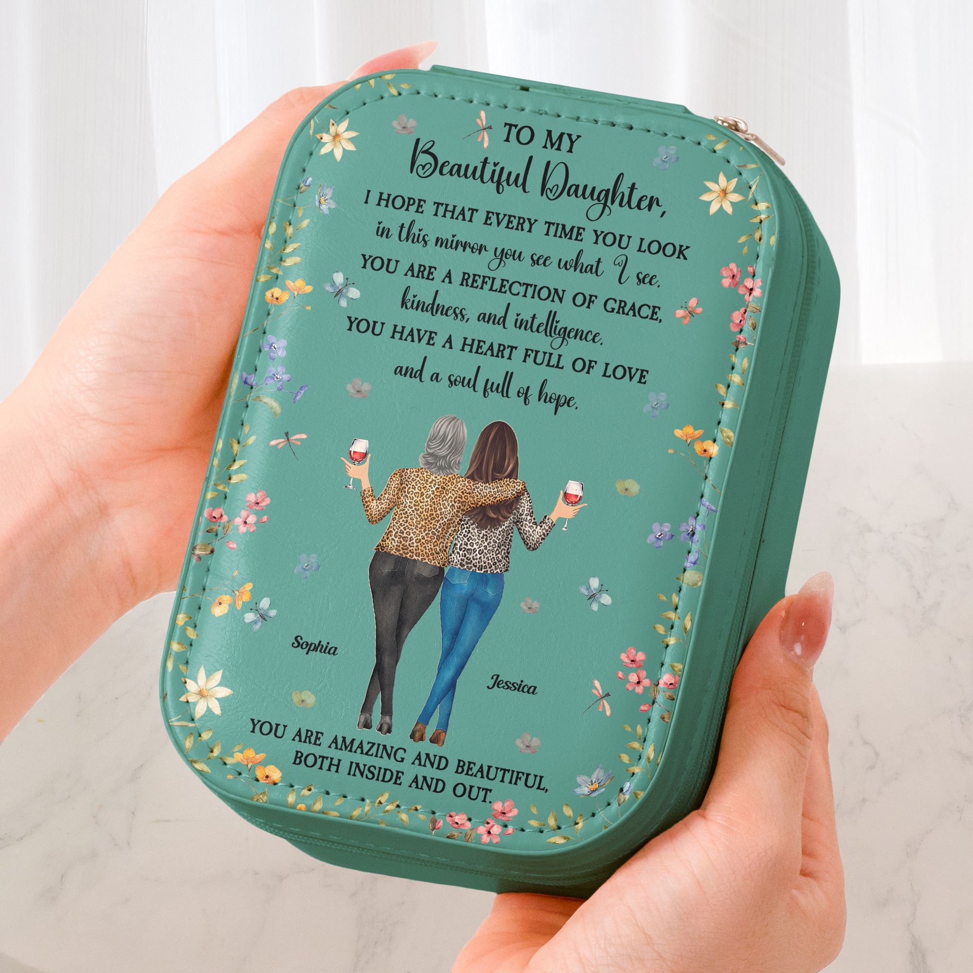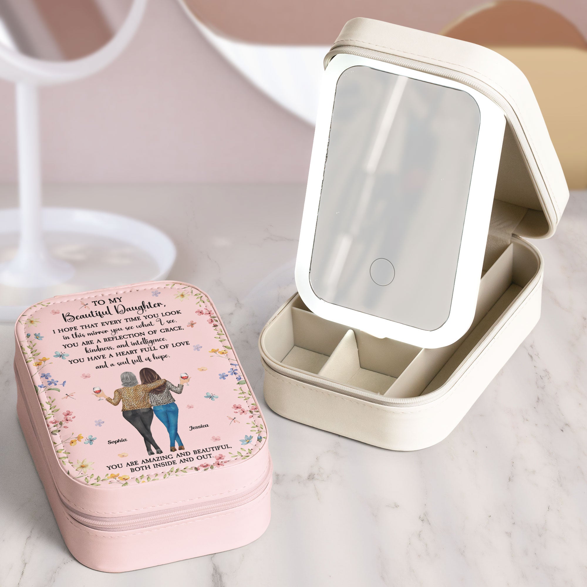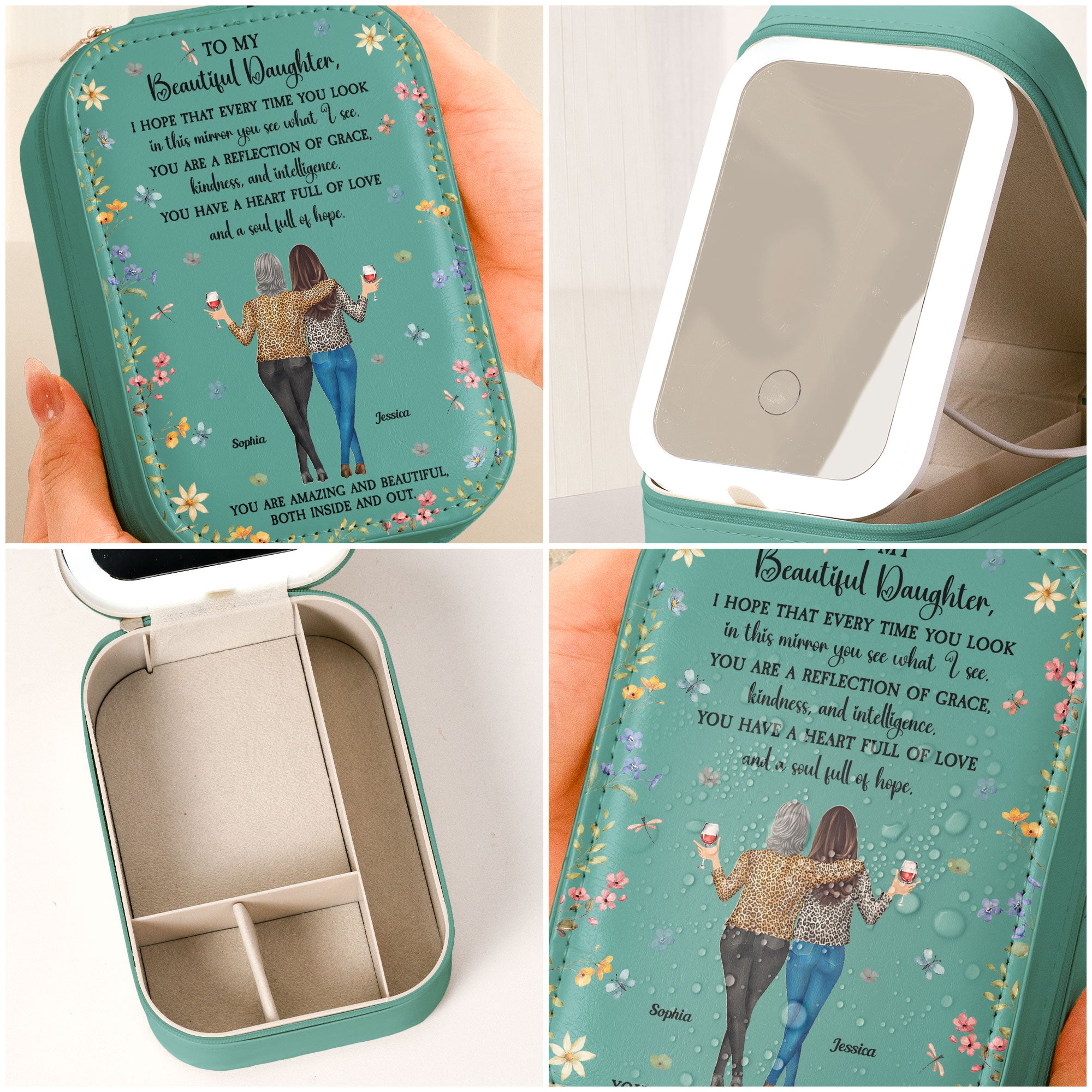 A truly heartfelt gift, this Custom Makeup Box With LED Mirror is a constant reminder of love and encouragement. Perfect for birthdays, Mother’s Day, Valentine’s Day, Christmas, anniversaries, graduations, or just because, this thoughtful gift from mom to daughter, granddaughter, mom, sisters, friends, or any special woman in your life will light up their space and their heart.