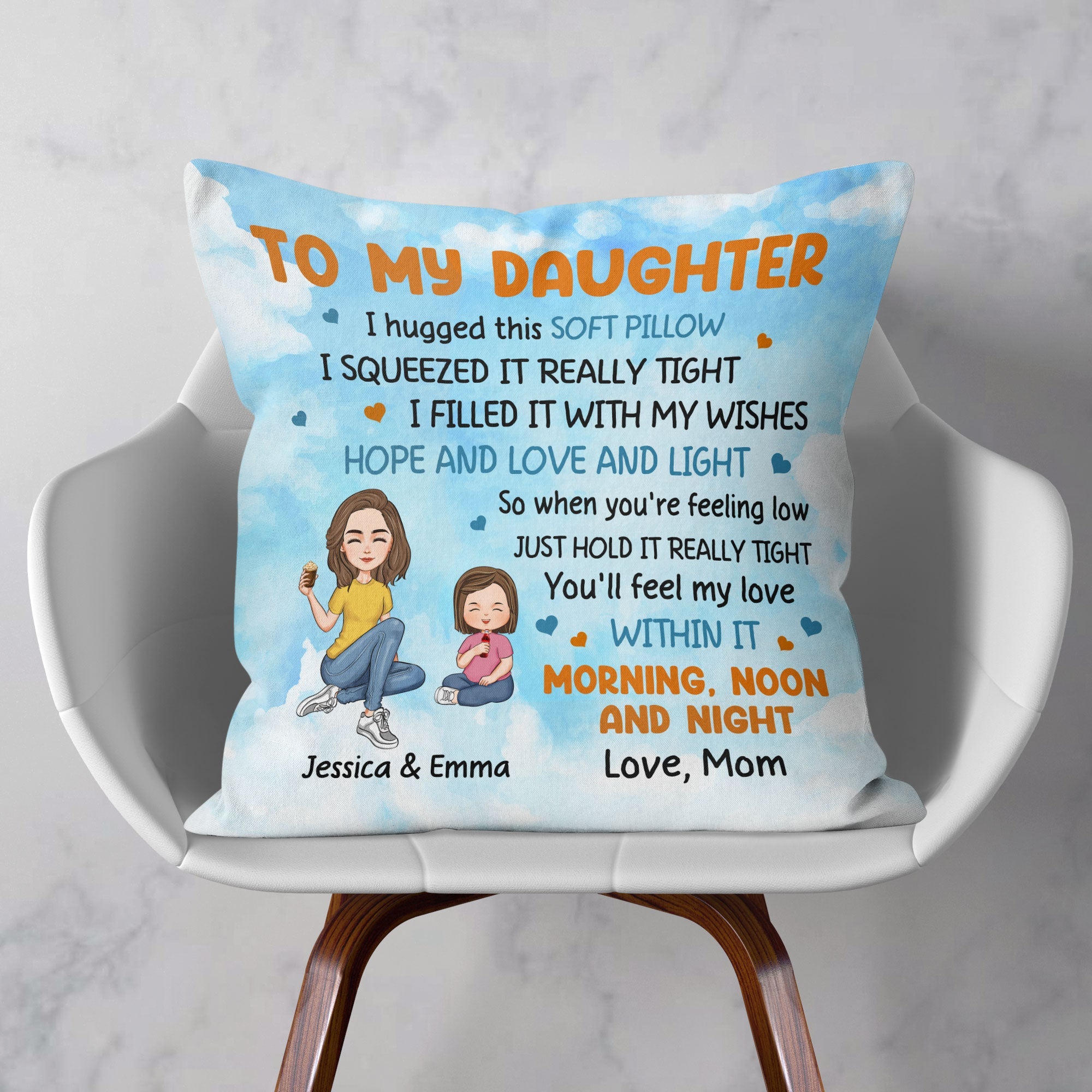 Finding a special present to show your beloved daughter how cherished she is can be difficult. A customized pillow makes a thoughtful, unique gift to celebrate the bond you share. Give this personalized pillow to your dear daughter for her birthday, graduation or just because. Surprise your daughter with this custom pillow as she leaves for college or new adventure to remind her of home. Pair it with her favorite treat or gift card for an extra thoughtful touch. This personalized pillow serves as a daily reminder of your love while giving her the comfort she deserves. It's perfect for cherishing daughters of all ages and personalities. A personalized pillow designed just for your one-of-a-kind daughter. This thoughtful gift celebrates your bond, encourages her dreams and shows appreciation for the wonderful girl she is.