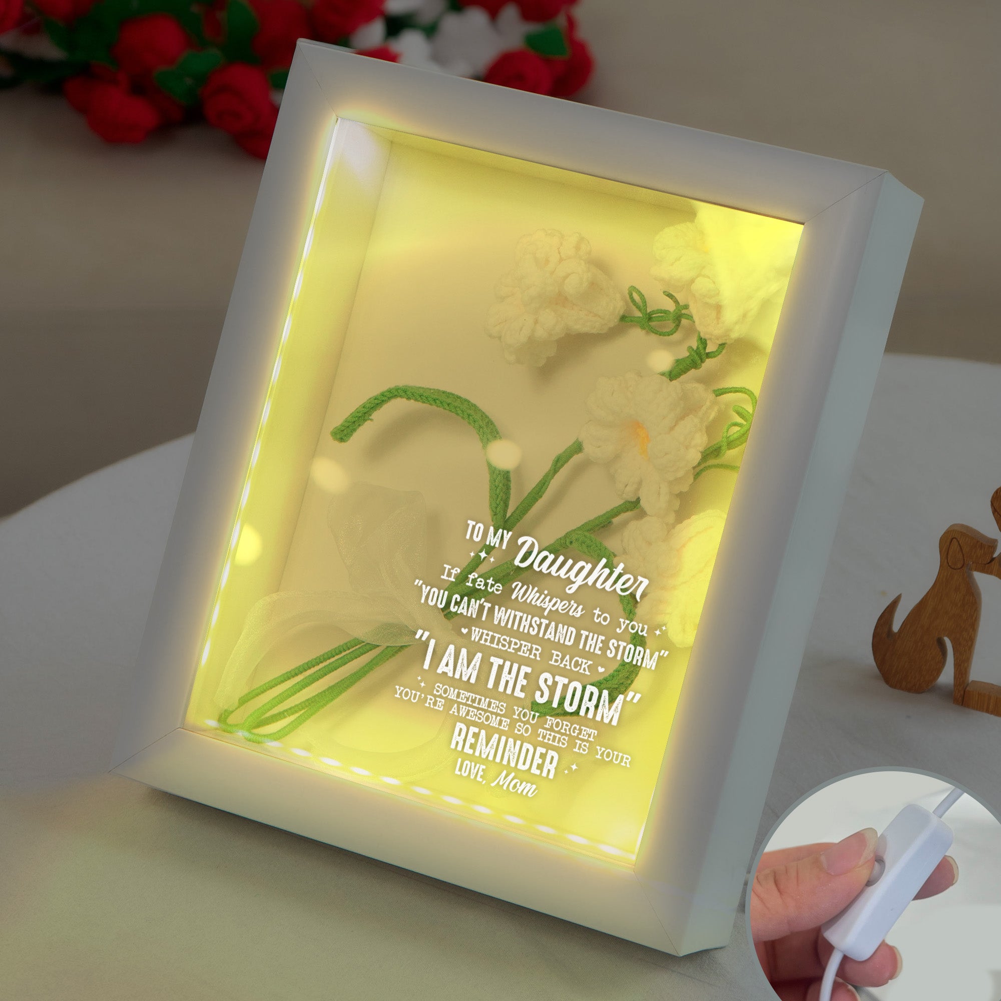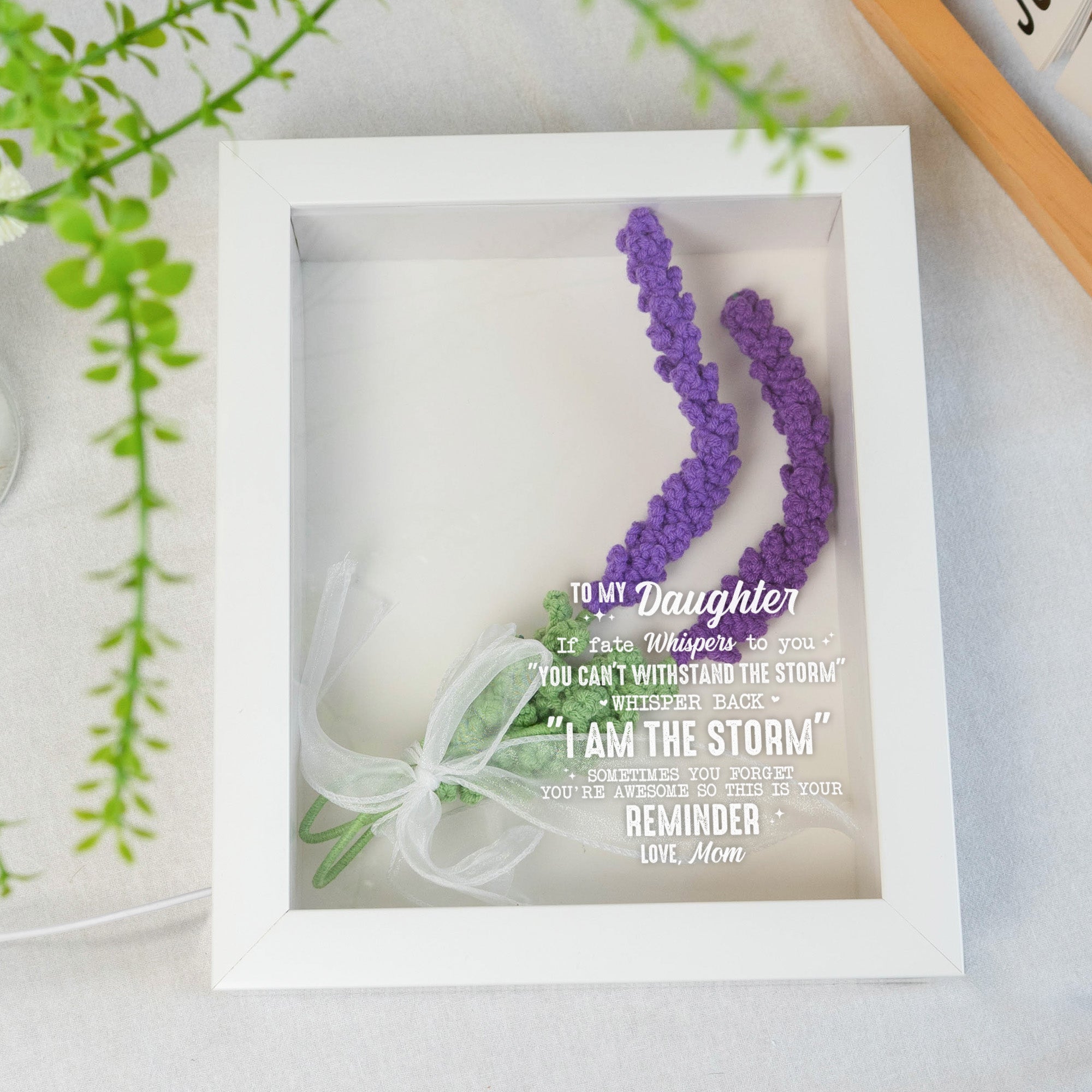 Introducing our To My Daughter, Whisper Back I Am The Storm - Personalized Crochet Flower Shadow Box with LED Light. This unique piece fosters an unbreakable bond between you and your daughter, showcasing a powerful sentiment. Its message stands as a gentle, yet potent daily reminder of your daughter's strength and incredible awesomeness, without directly quoting the original text. This makes an excellent centerpiece in your daughter's room, bathing it in a soft glow from the LED lights, always reminding her how special she is.