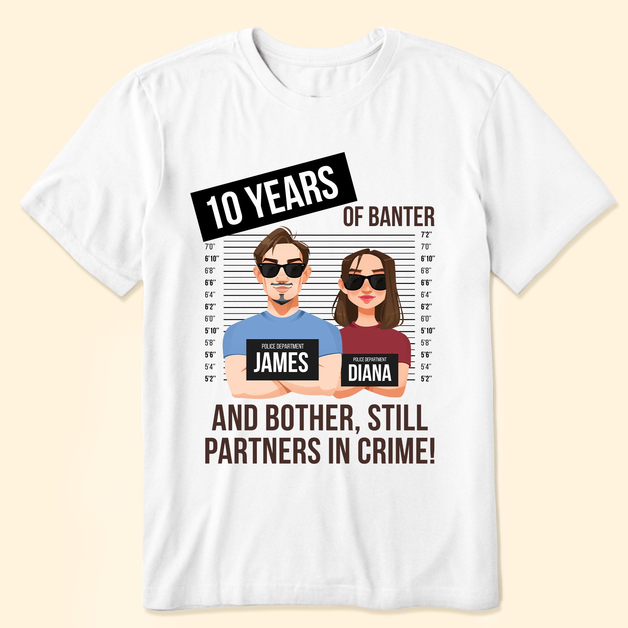 Celebrate your love with a dash of humor and romance with our Personalized Couple Matching Shirts! Perfect for any couple who’s enjoyed “.... years of banter and bother and still partners in crime!” Customize the number of years and add custom characters of you and your partner to make these shirts uniquely yours.