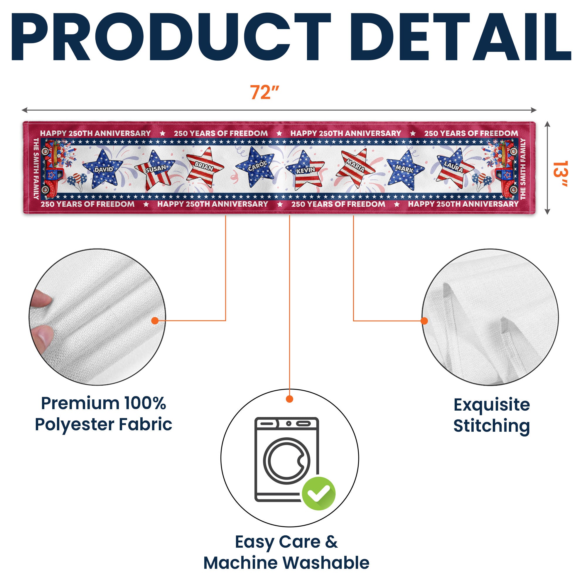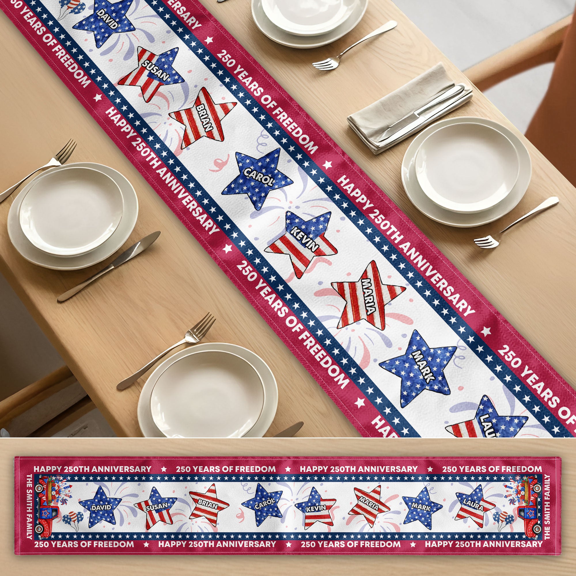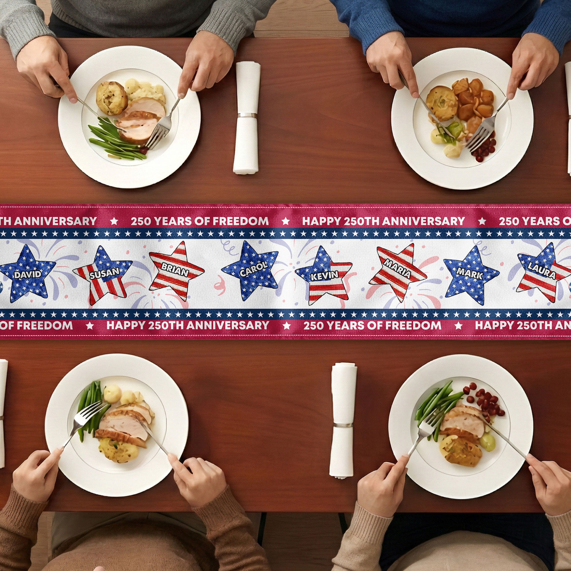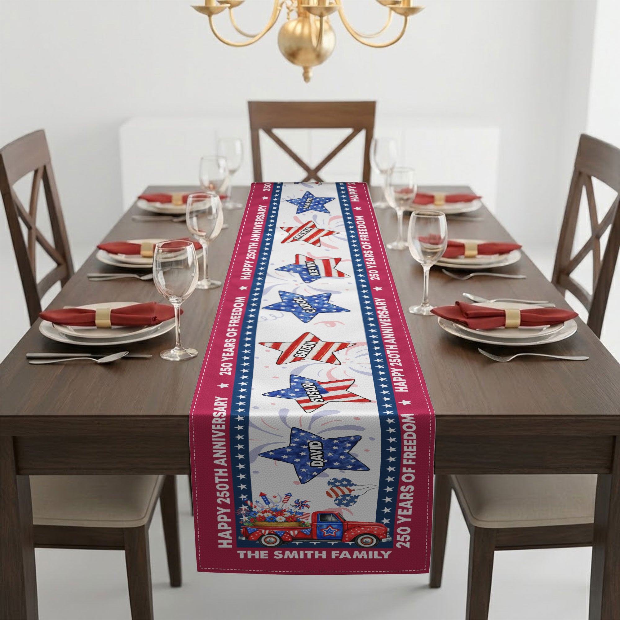 Celebrate America and mark a milestone with our USA 250th Birthday Custom Name Patriotic Star personalized Table Runner. The perfect addition to your family gatherings, it effortlessly embellishes your dining experience while stirring positivity among your loved ones. Imagine their delightful smiles as they gather around a table adorned with this patriotic star. It does more than just setting a festive atmosphere; it nurtures a sense of unity and strengthens family bonds. Whether it's for the daily family dinner or an Independence Day party, it fits all scenarios fluidly.
