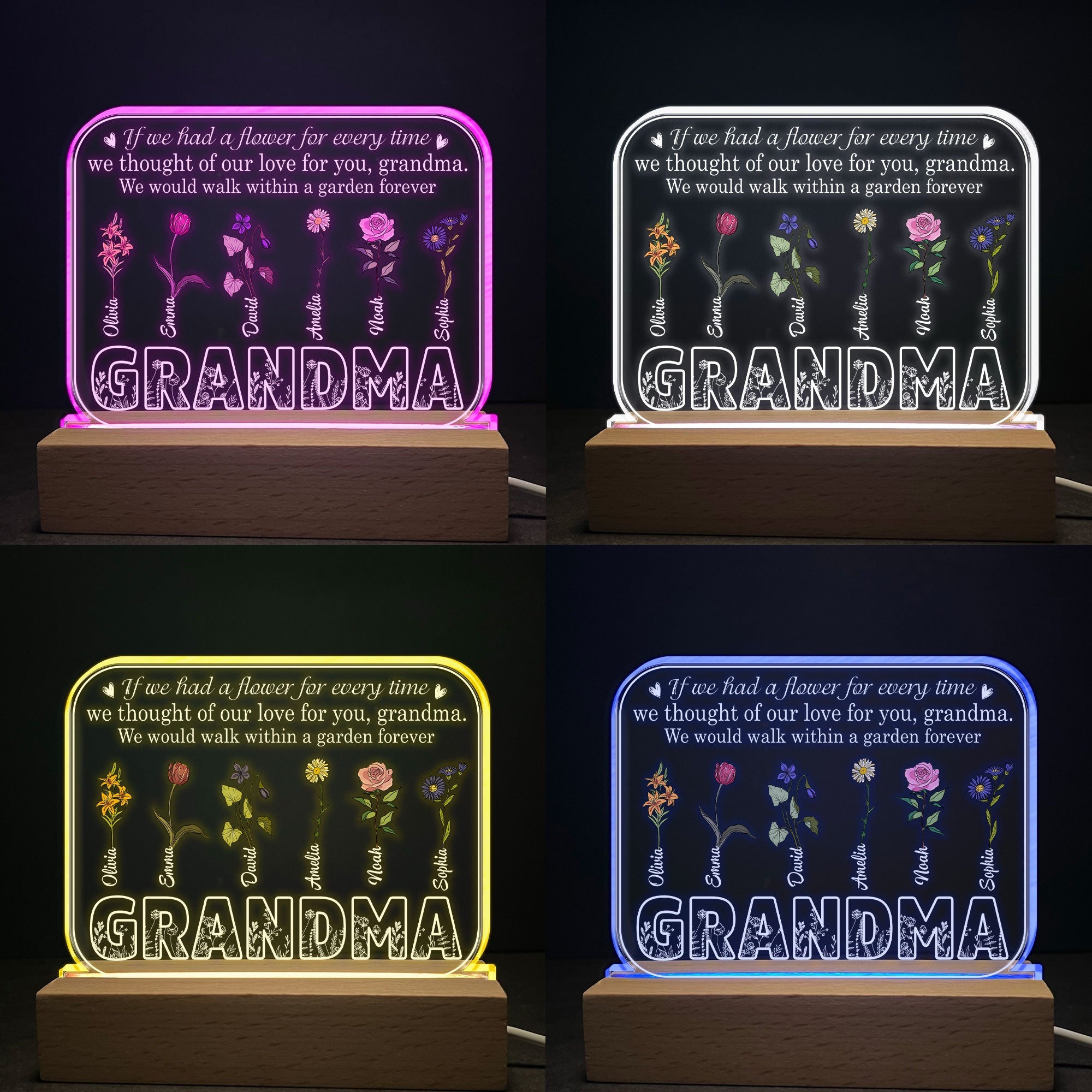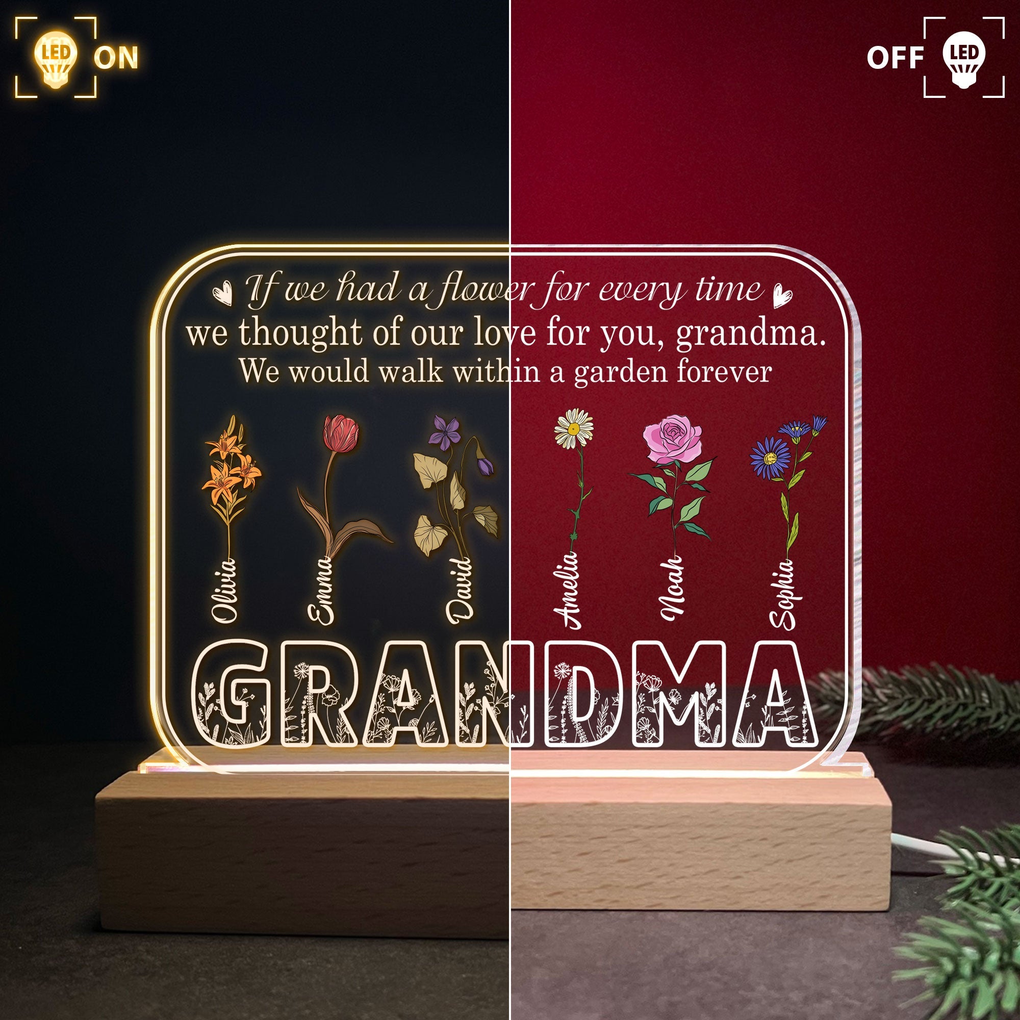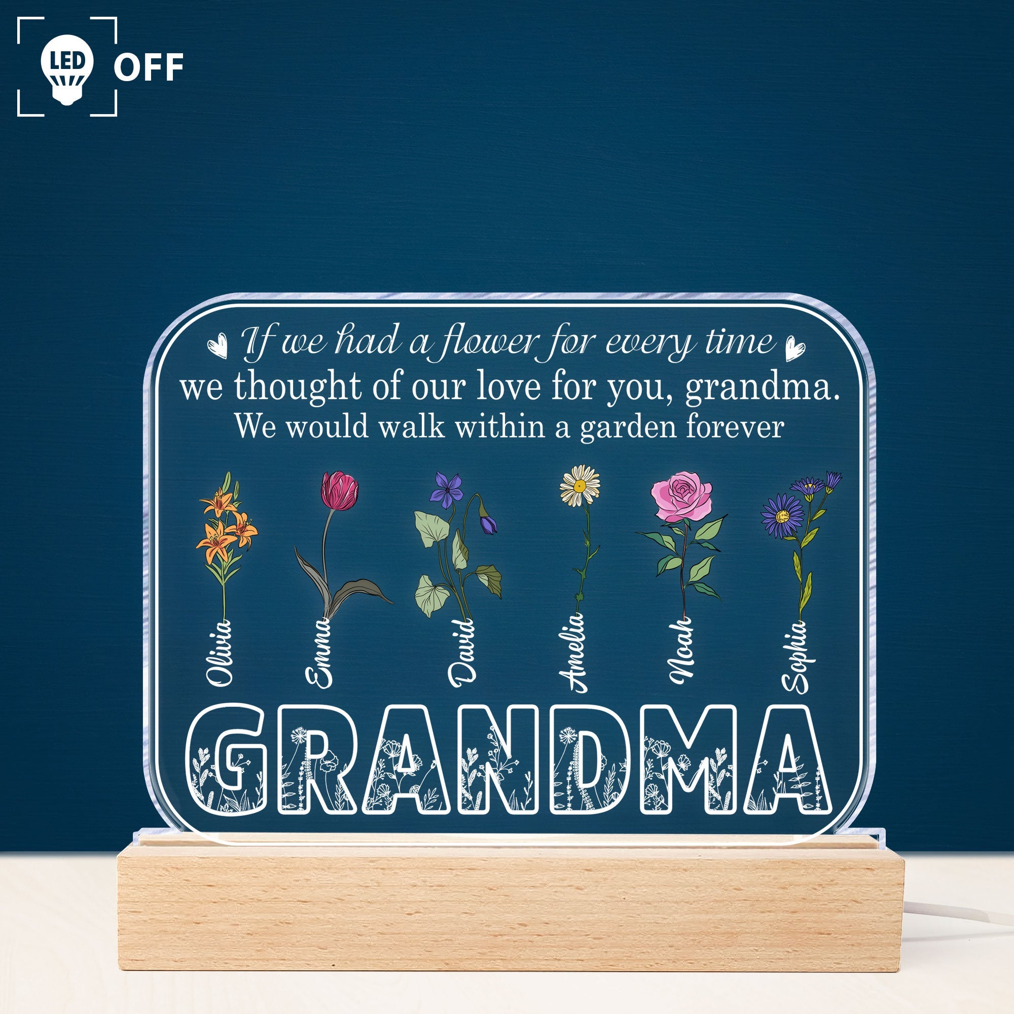 This 3D LED Light Wooden Base is a heartfelt gift for grandma. It has a beautiful heartwarming message and is equipped with LED lights that change colors by a switch. You can personalize with any name and decorative flowers you choose. This makes an ideal gift for Mother's Day, birthdays, holidays, graduations—you name it! It's sure to be treasured by your grandmother for years to come.