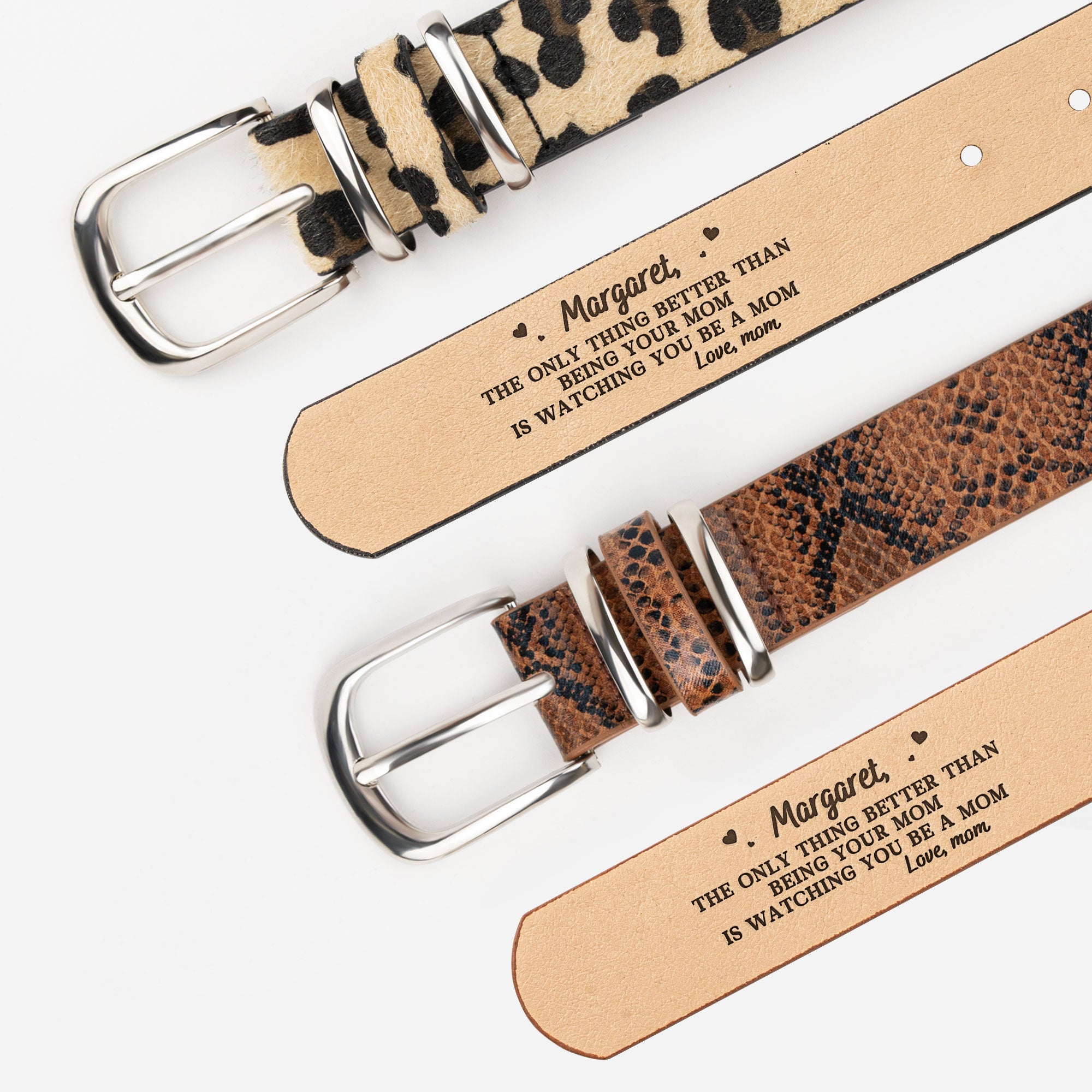 Celebrate your daughter's journey into motherhood with the Watching You Be A Mom personalized animal print leather belt. Thoughtfully designed with love, this unique accessory features custom engraving, making it a heartfelt First Mother's Day gift, new mom gift, or birthday gift for daughters from moms. The meaningful quote, The Only Thing Better Than Being Your Mom Is Watching You Be A Mom, beautifully expresses a mother's pride and joy. Stylish and sentimental, this high-quality belt is both a fashionable statement and a cherished keepsake she’ll treasure forever.