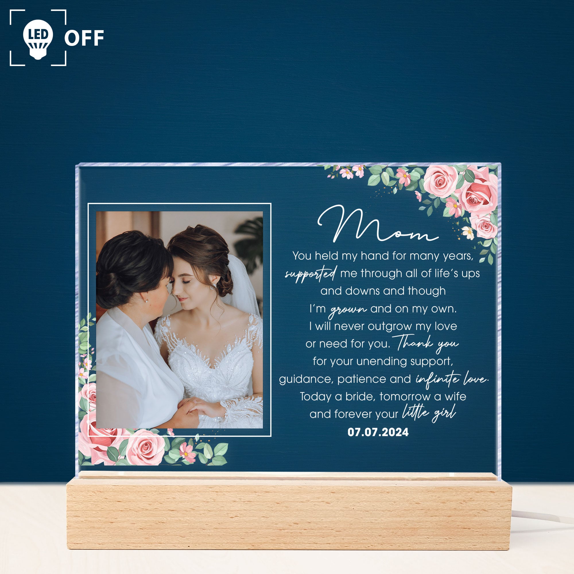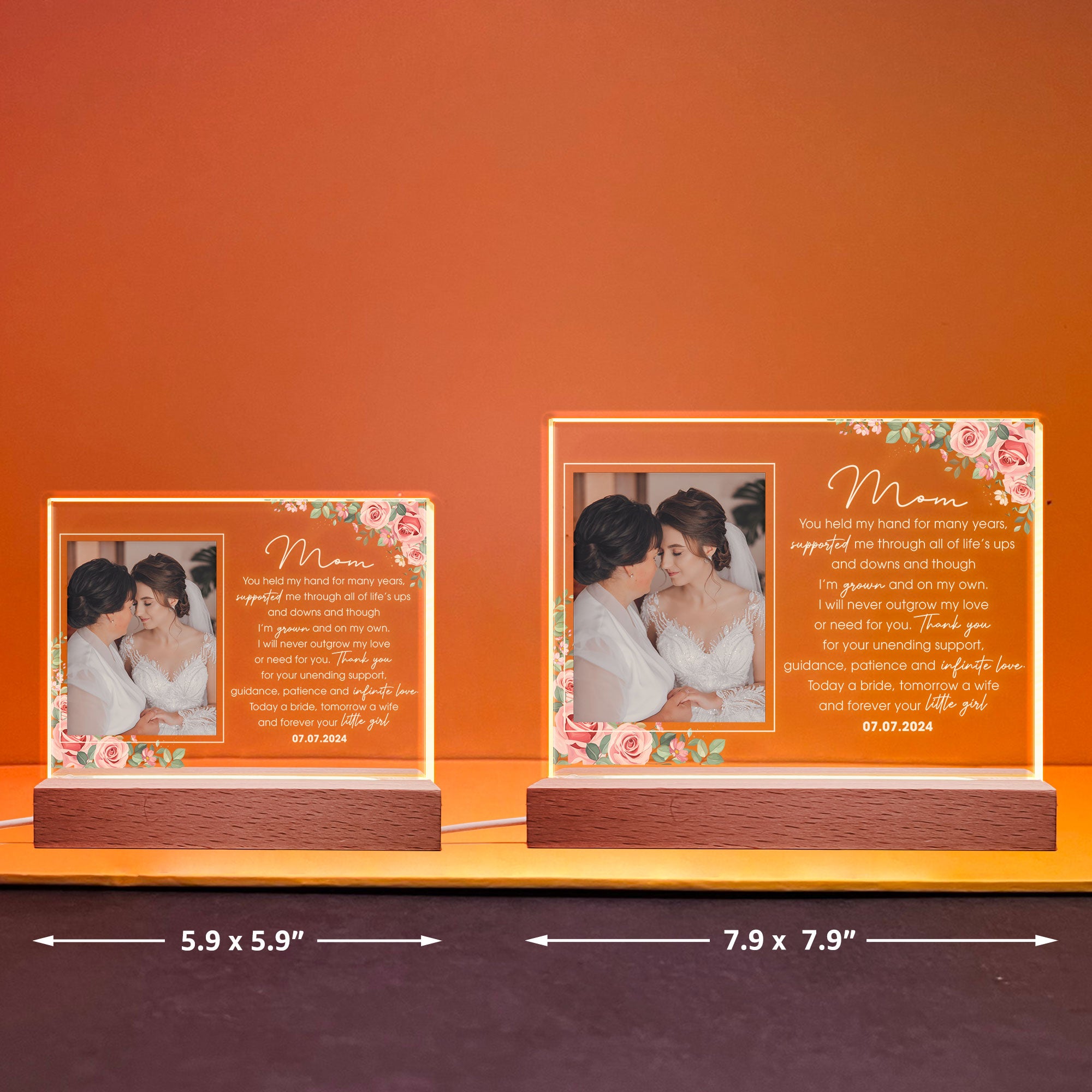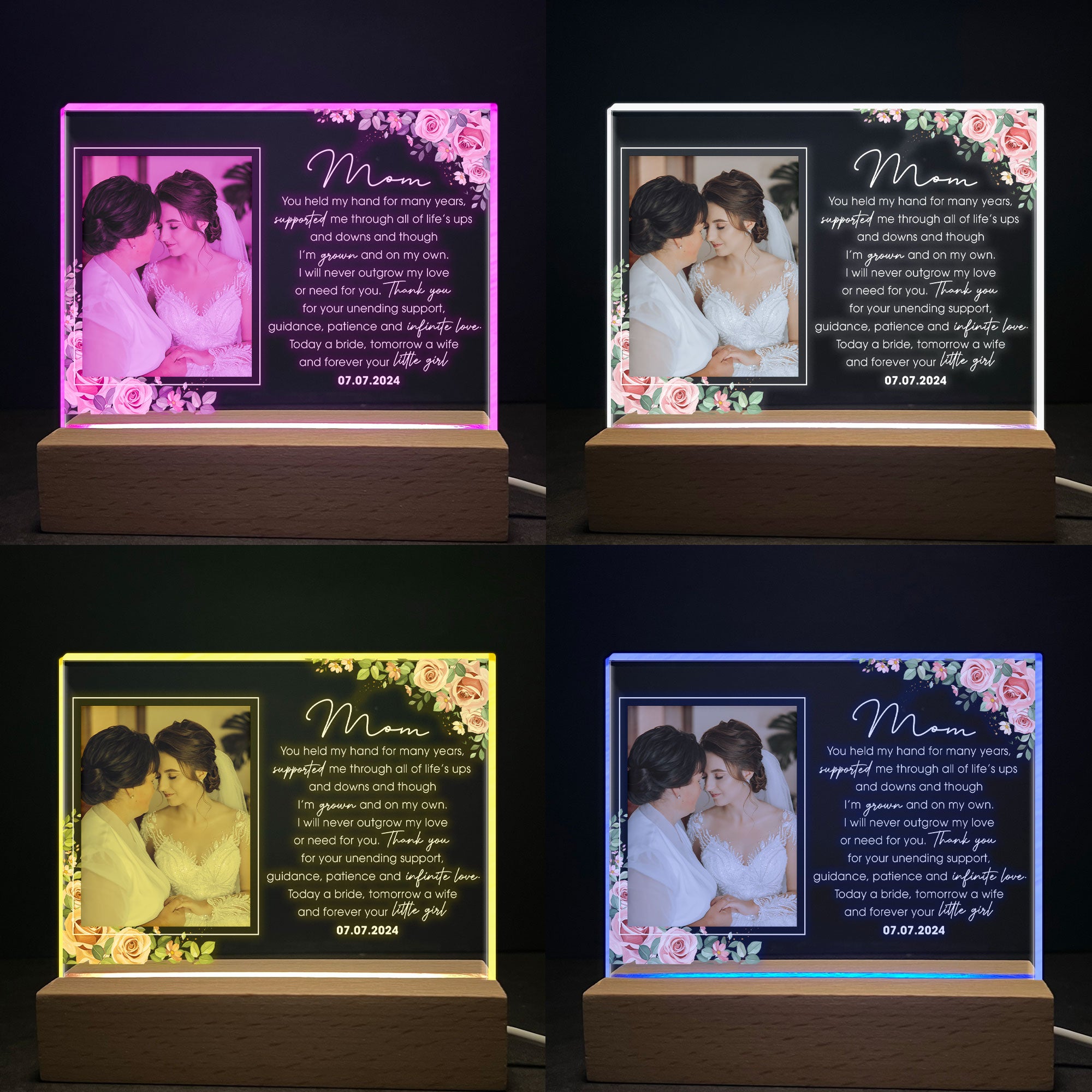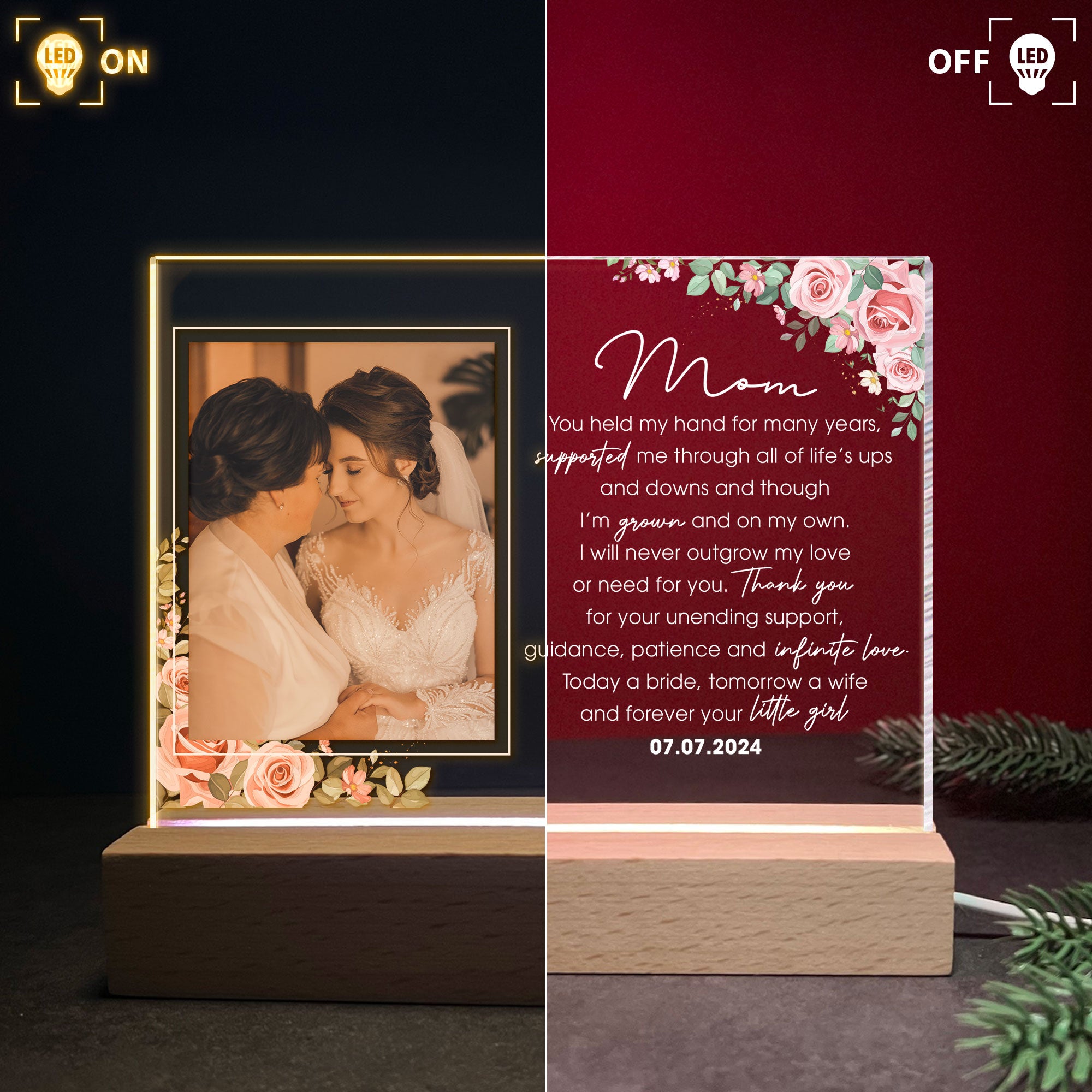 Illuminate your gratitude and love with our Personalized Photo LED Light, a touching gift from the bride to her mother on her wedding day. This beautifully crafted light captures a treasured photo and heartfelt message, making it a lasting keepsake that honors the special bond you share. Whether placed on a bedside table, in the living room, or in a cherished spot, this Personalized Photo LED Light will always remind your mom of the love and gratitude you hold for her. Order now to create a stunning and meaningful gift that she will treasure forever.