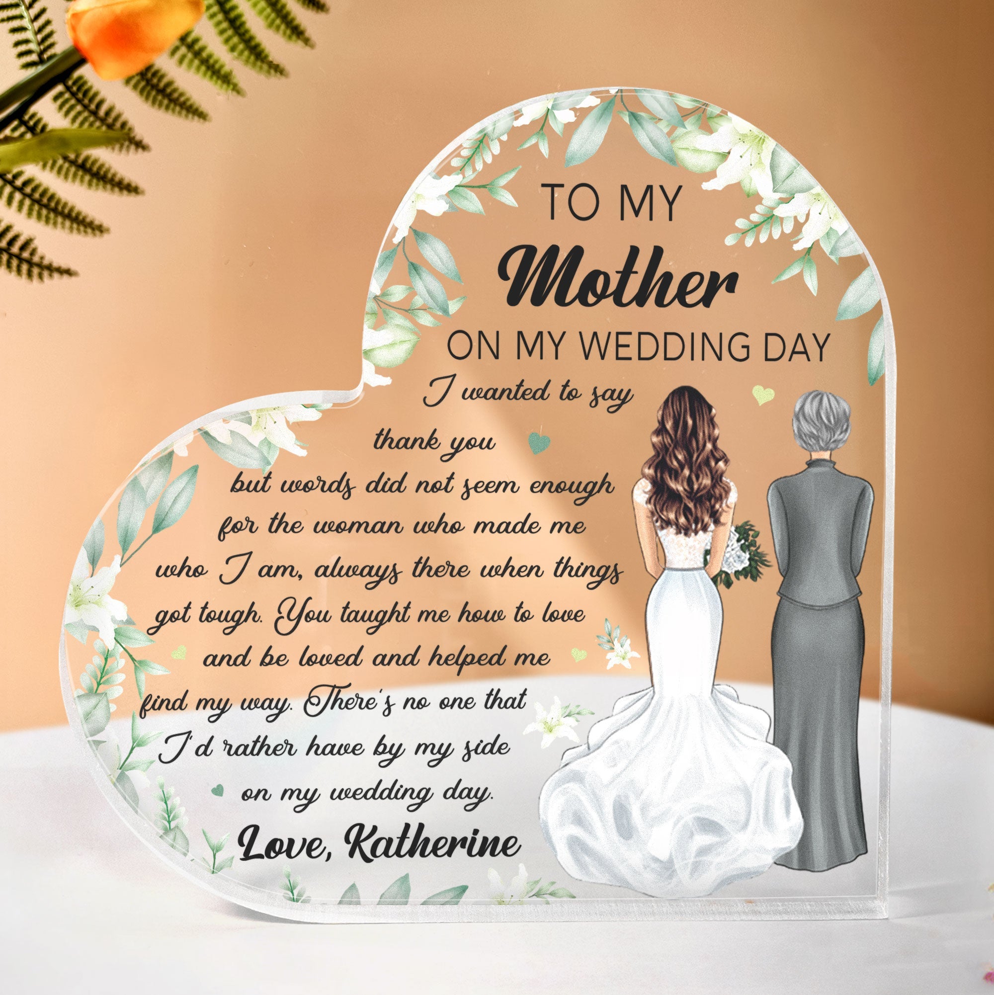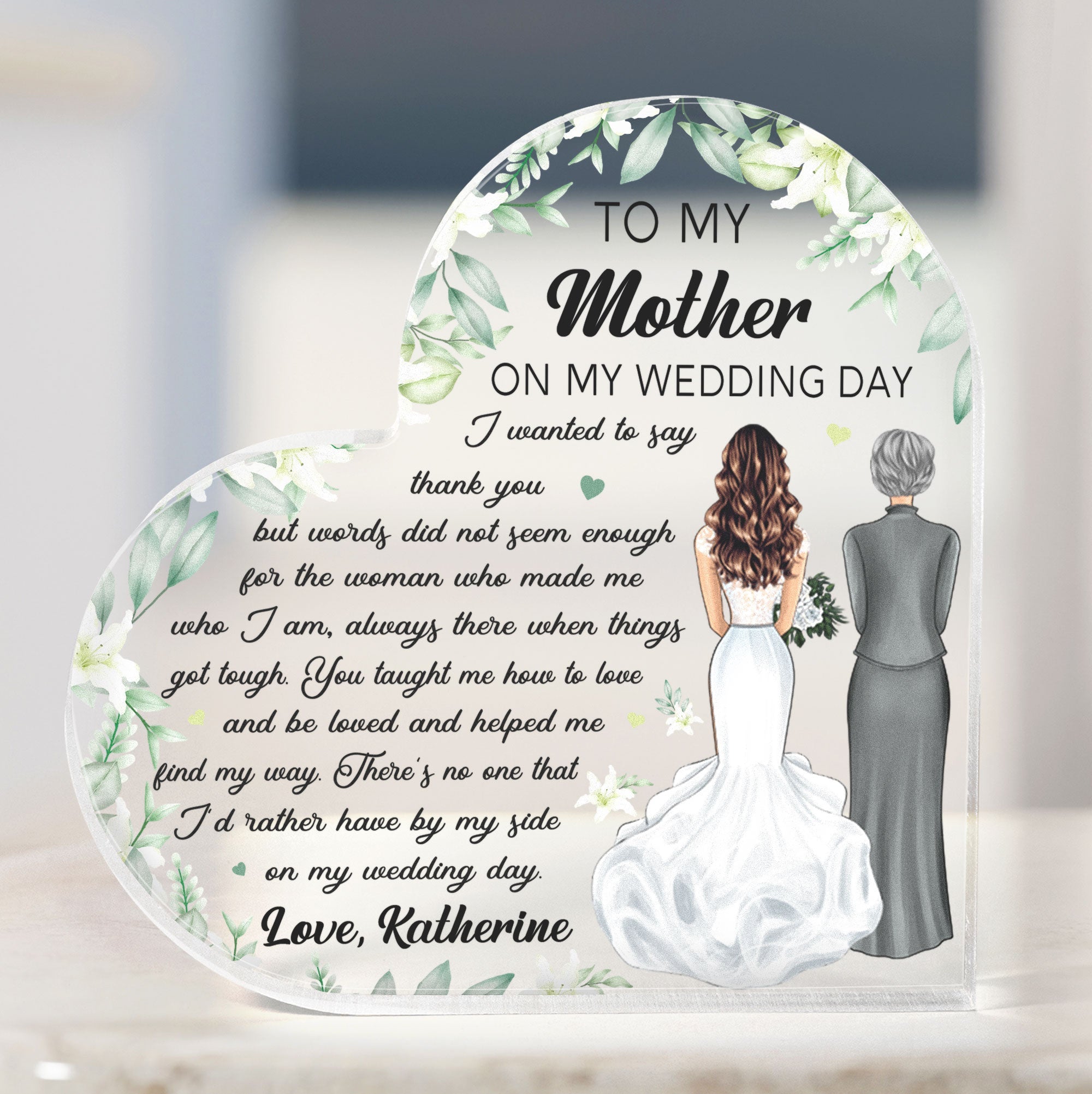 Personalized Heart-Shaped Acrylic Plaque - Wedding Gift for Mom from Daughter. Show your mom how much she means to you with our Personalized Heart-Shaped Acrylic Plaque, a beautiful and heartfelt gift from daughter to mom on her wedding day. This elegant plaque is a touching way to express your gratitude and love, making it a cherished keepsake that she’ll treasure forever.