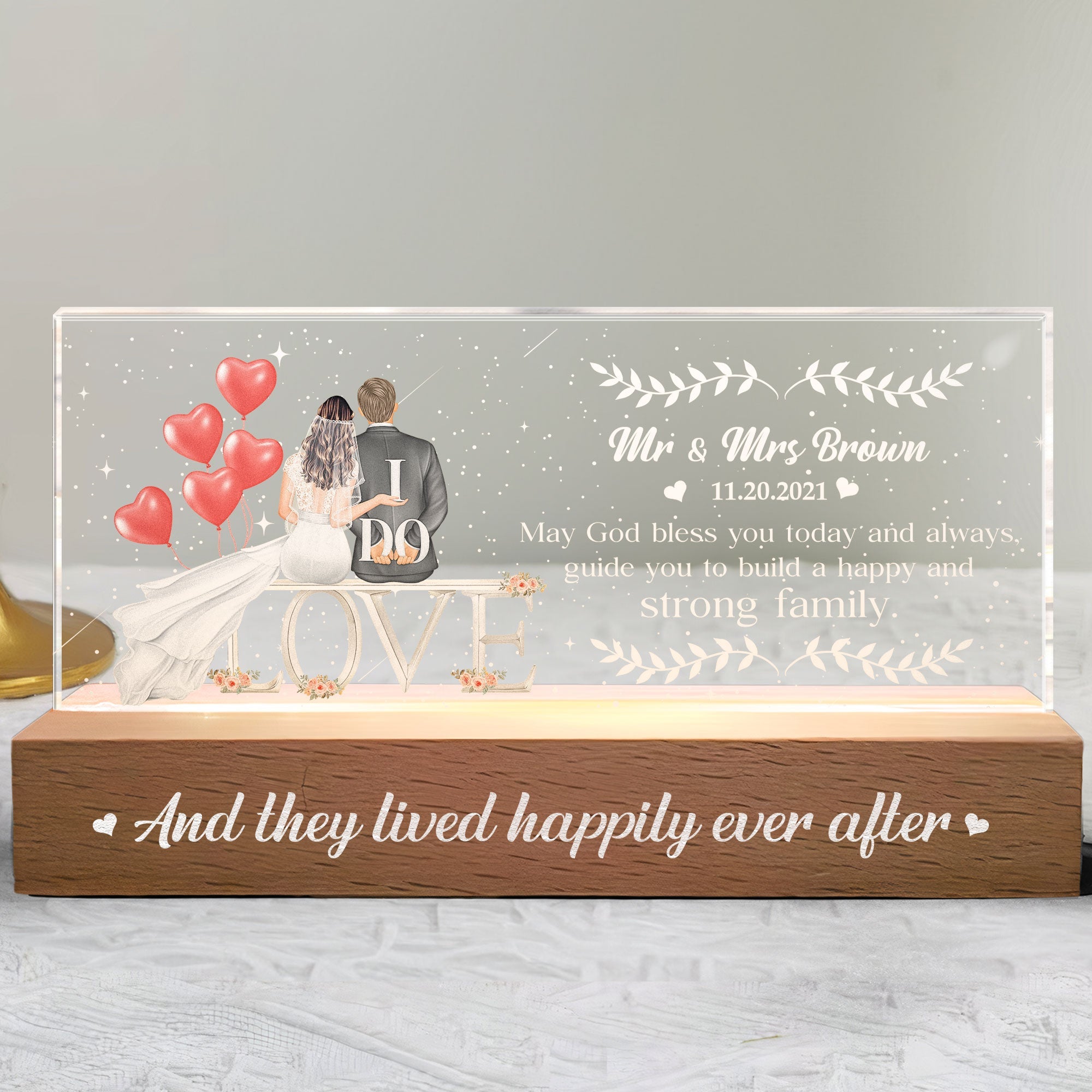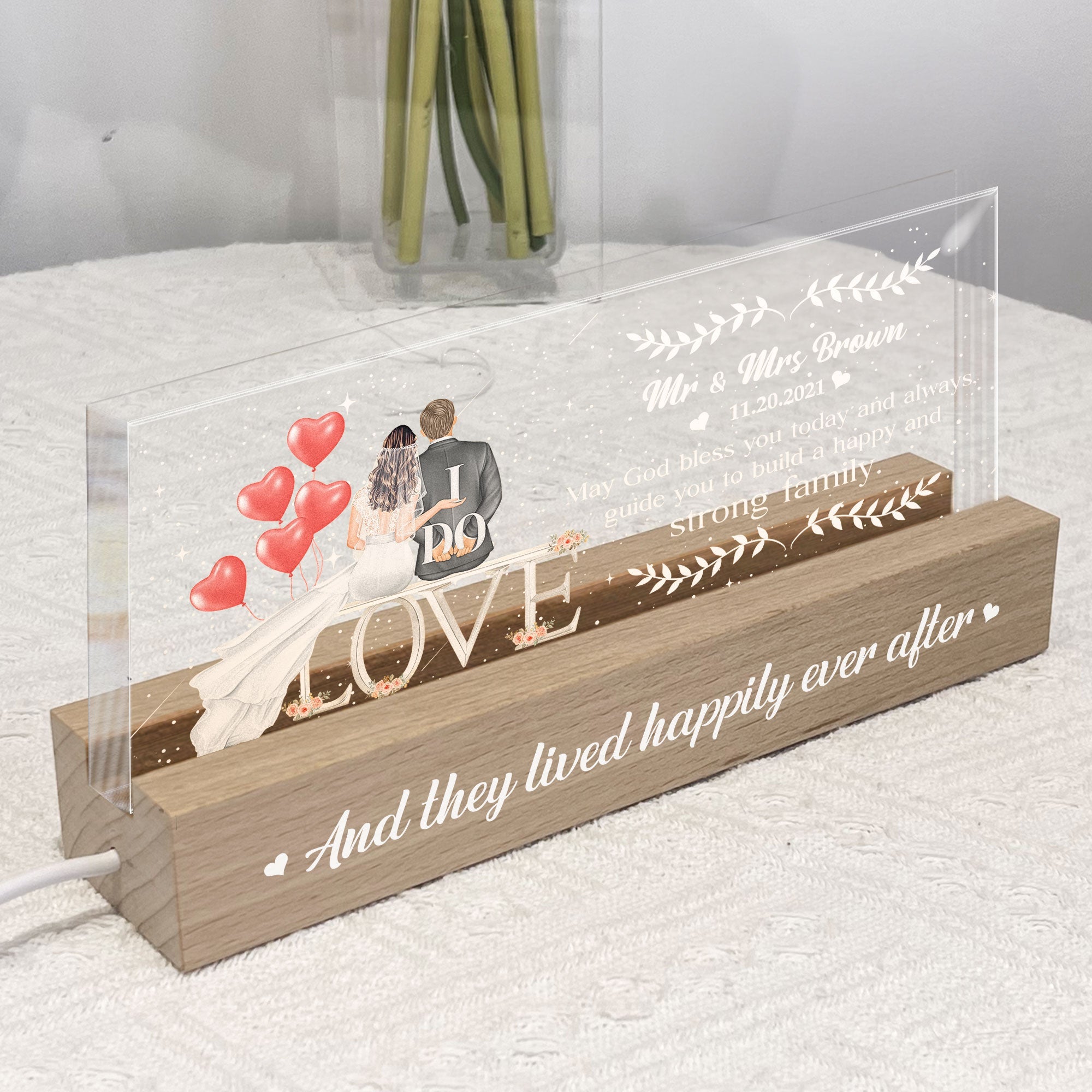 Personalize the night light with the couple's names and their wedding date, making it a unique and treasured keepsake. The custom details add a personal touch that celebrates their commitment and the special day they vowed to spend their lives together.