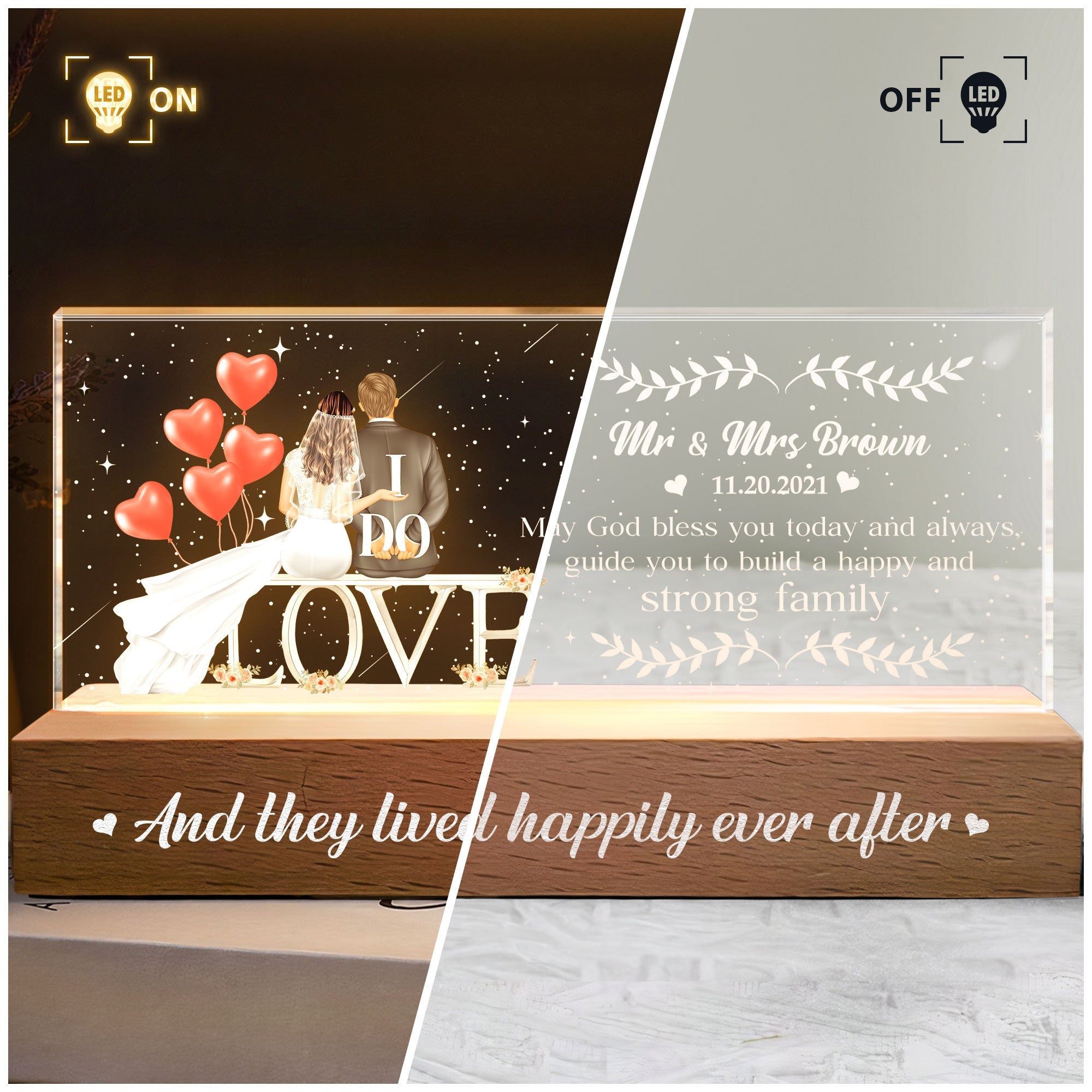 Celebrate the union of a special couple with our Personalized LED Night Light, a beautiful and meaningful gift that illuminates their love and faith. Perfect for commemorating their wedding, this elegant night light features a heartfelt blessing and a timeless message of happiness and strength. The printing features the blessing: "May God bless you today and always, guide you to build a happy and strong family. And they lived happily ever after." This heartfelt message conveys your best wishes for their journey together, offering both spiritual guidance and a promise of enduring love.
