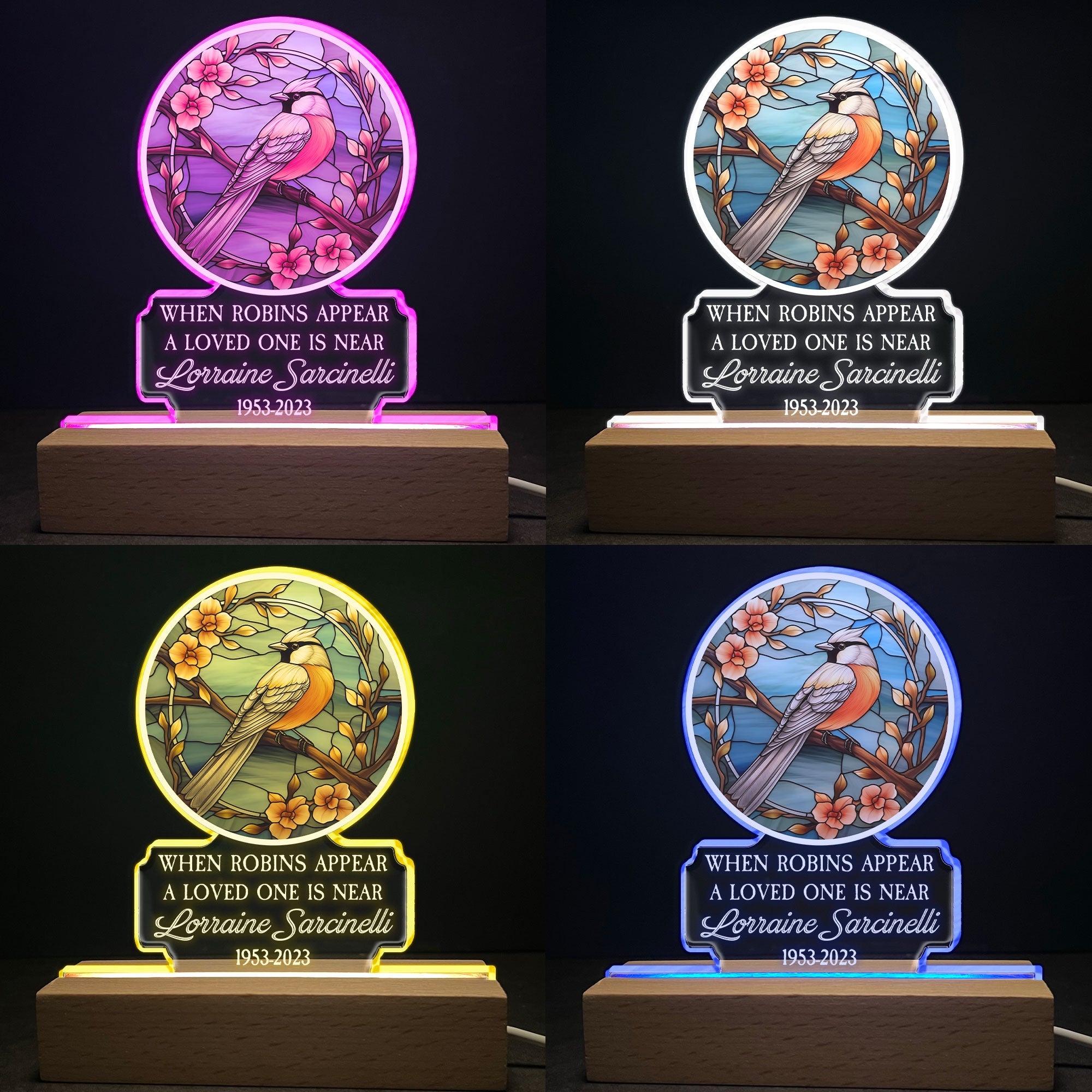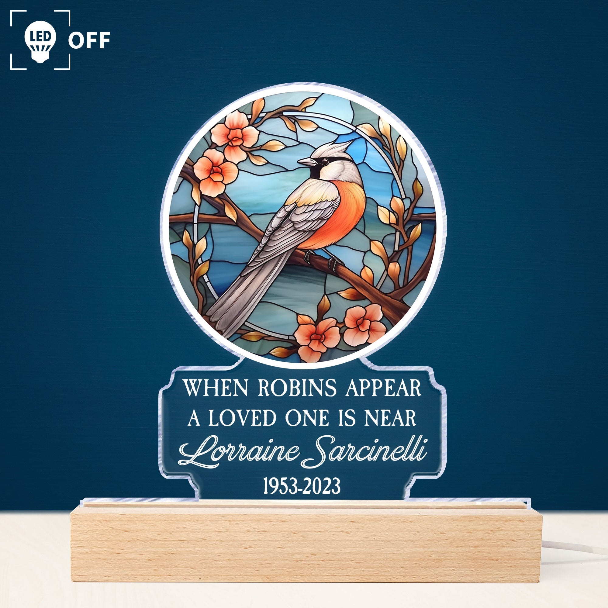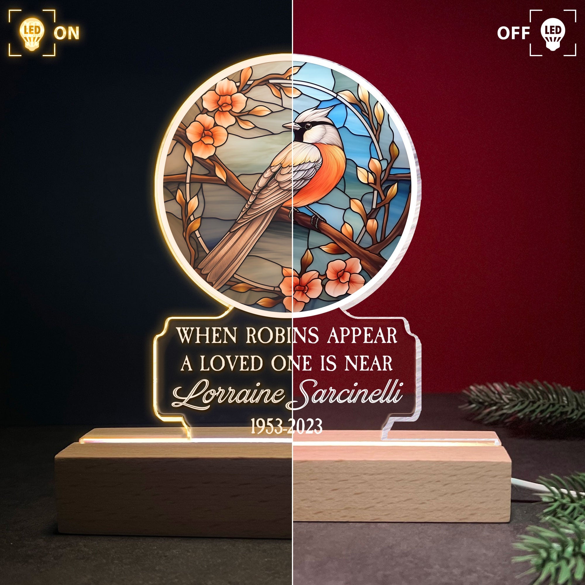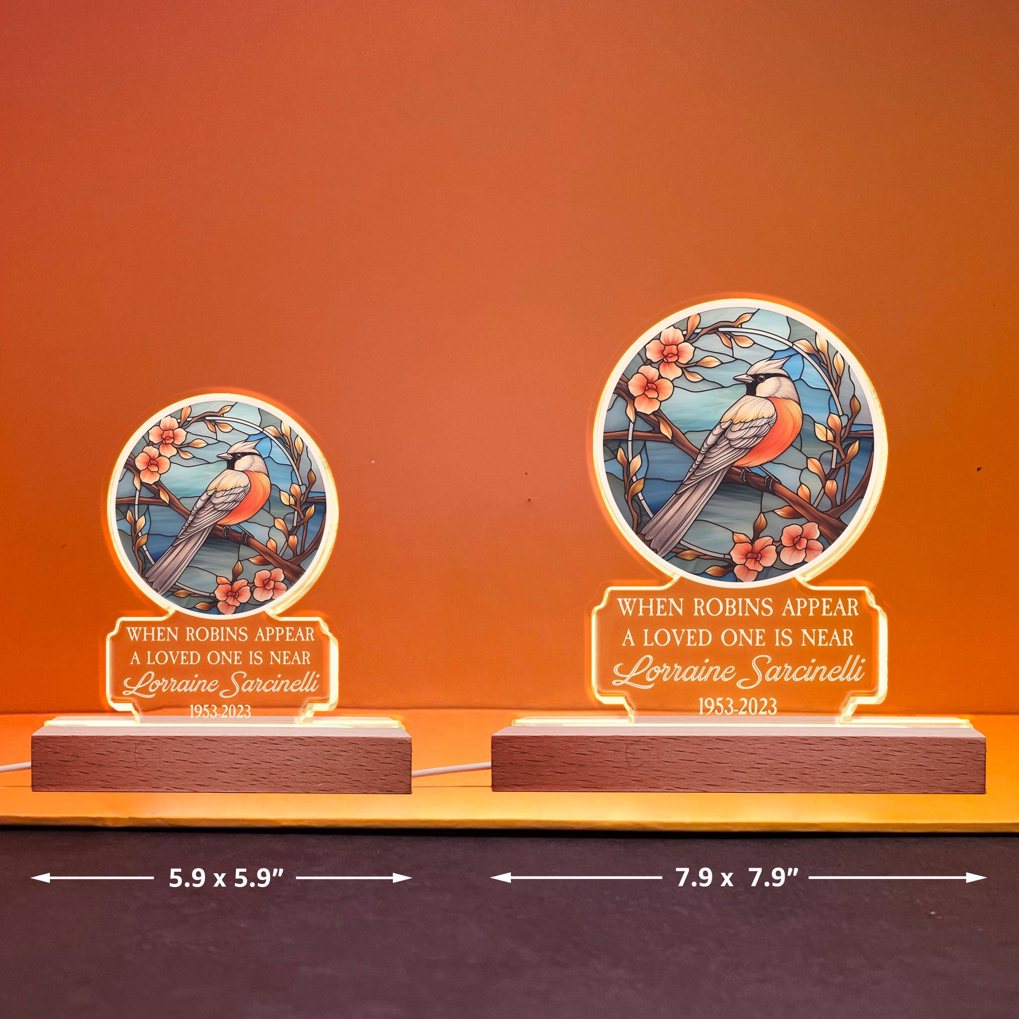 This lamp comes personalised a perfect way to keep the light burning of a loved one. Made from high-quality acrylic, this light serves as a beautiful and lasting tribute, expressing the sentiment of "When Robins Appear A Loved One Is Near"