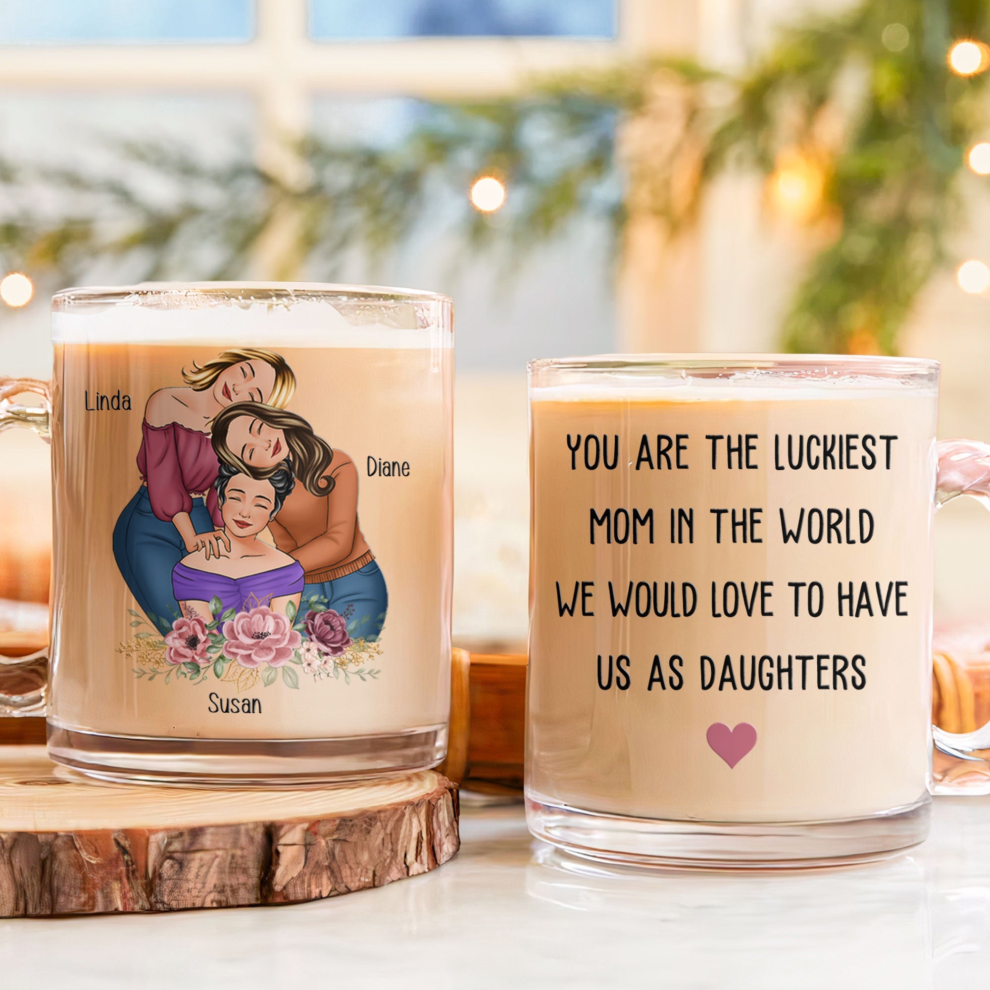 Order now and surprise your mom with this unique and heartfelt personalized glass mug. It's the perfect way to make her morning coffee or tea even more special and remind her of the wonderful daughters she has!