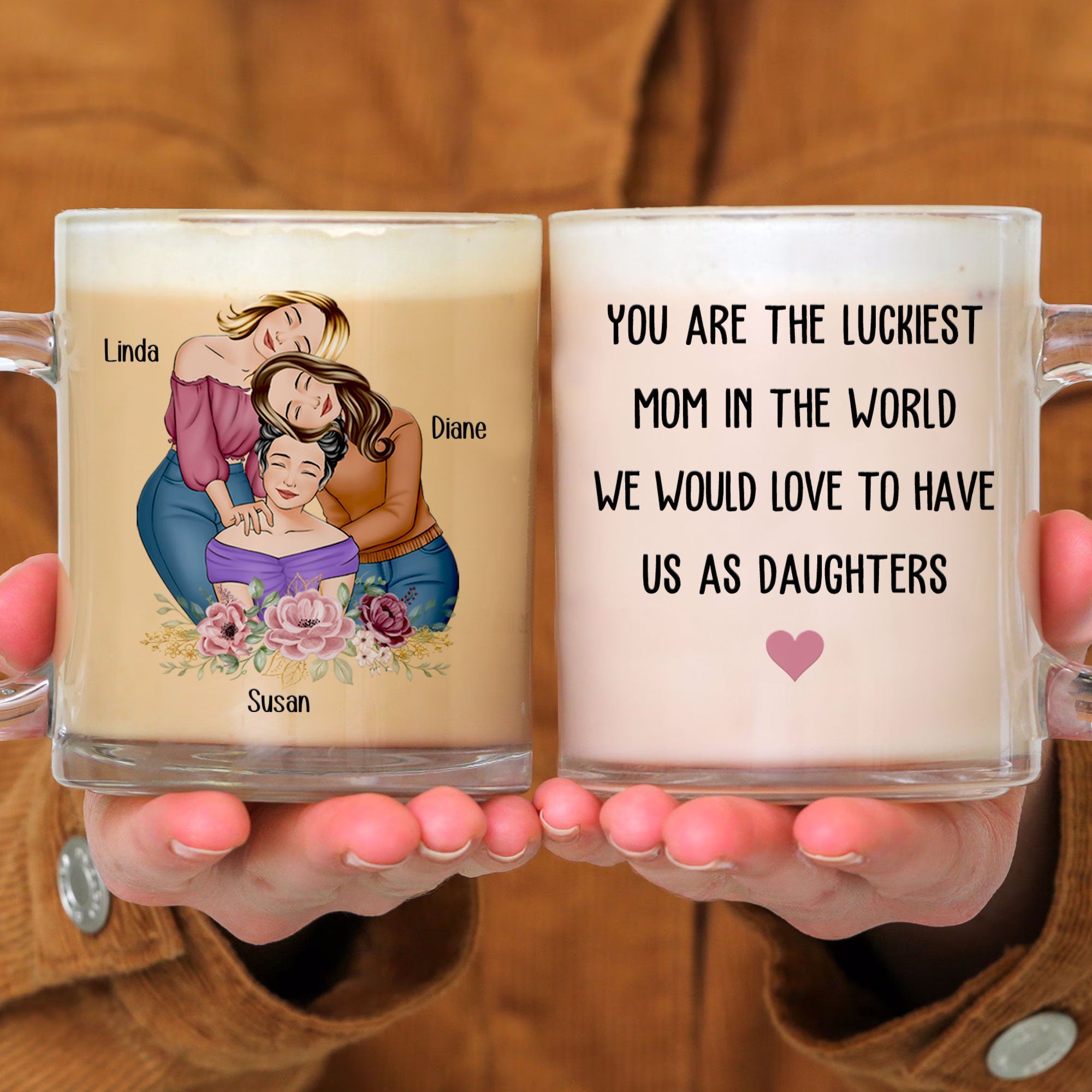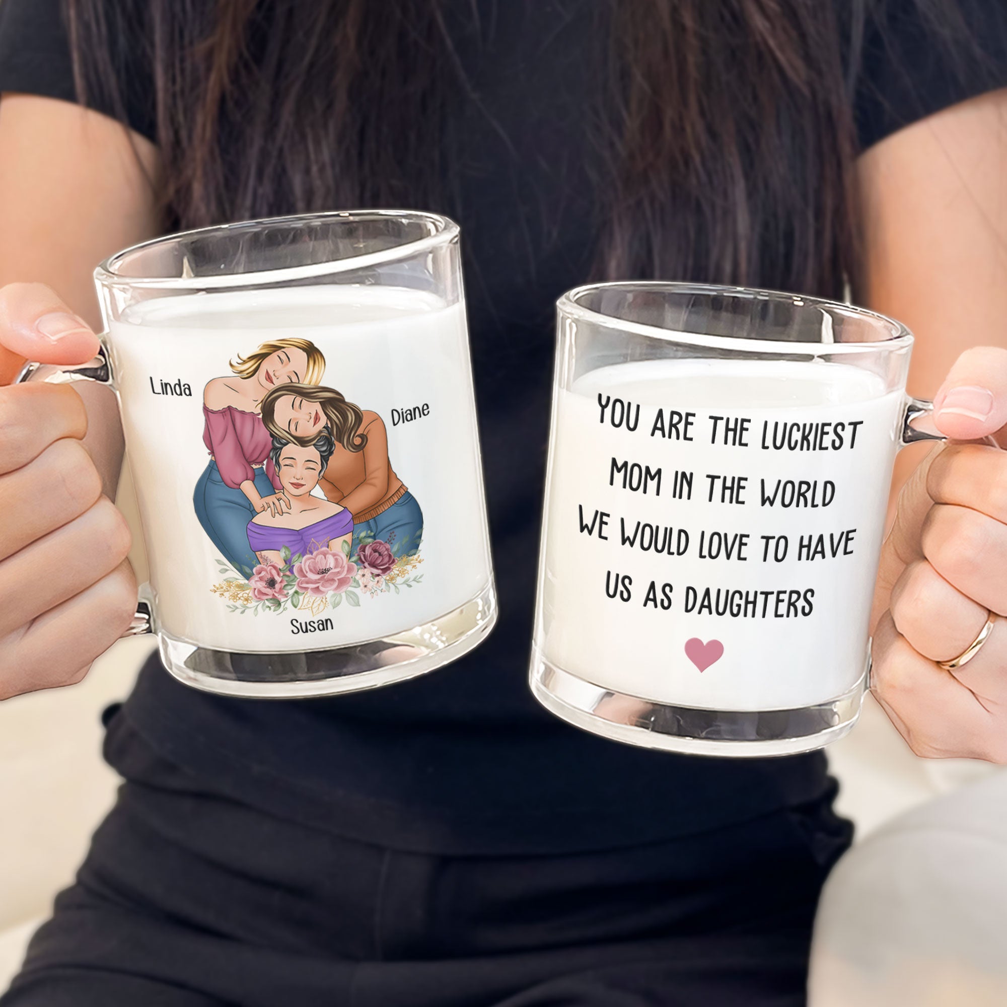 Show your mom just how special she is with our 'You Are The Luckiest Mom In The World I Would Love To Have Us As Daughters' Personalized Glass Mug. This meaningful glass mug is the perfect gift for Mother's Day, birthdays, or any occasion to show your love and appreciation for Mom.