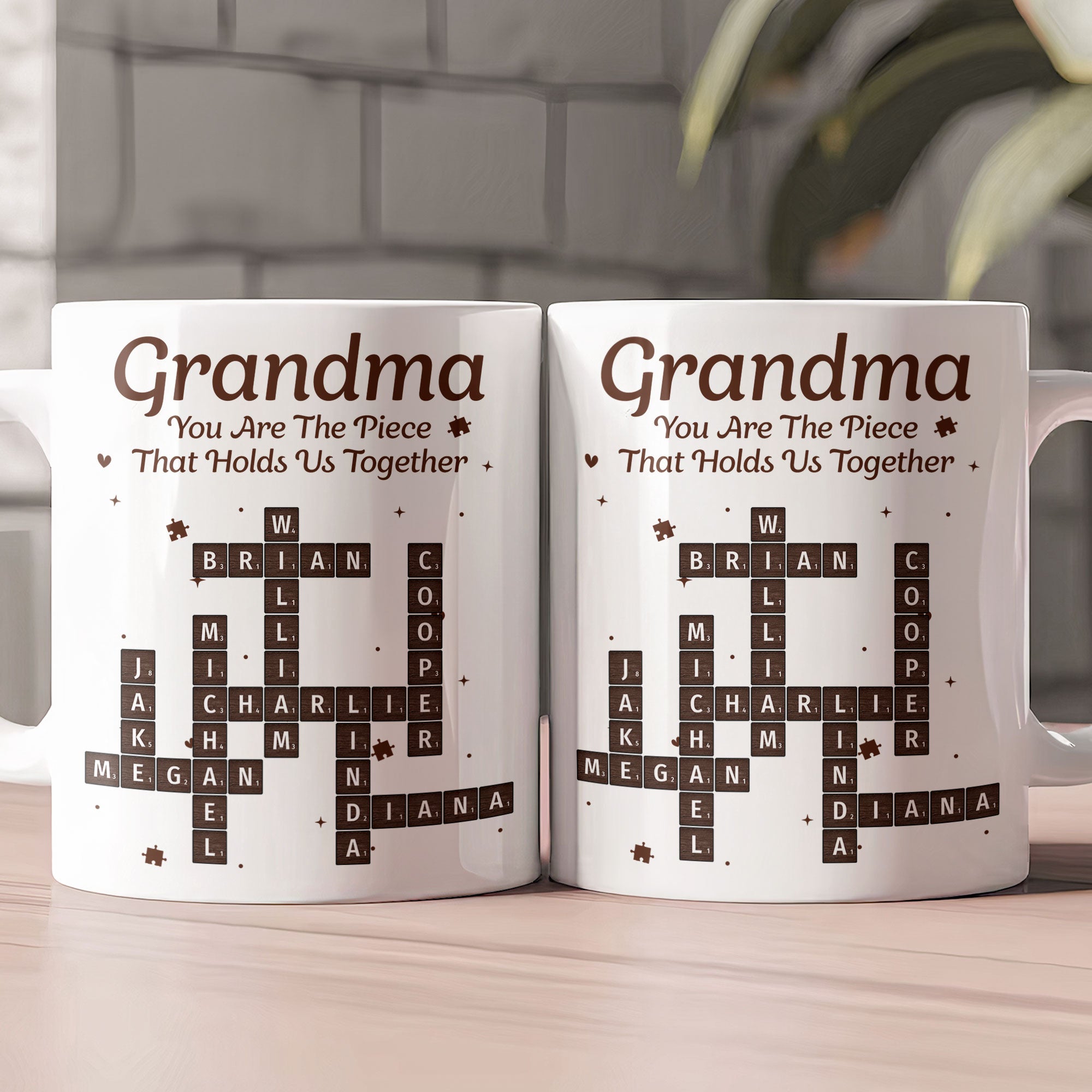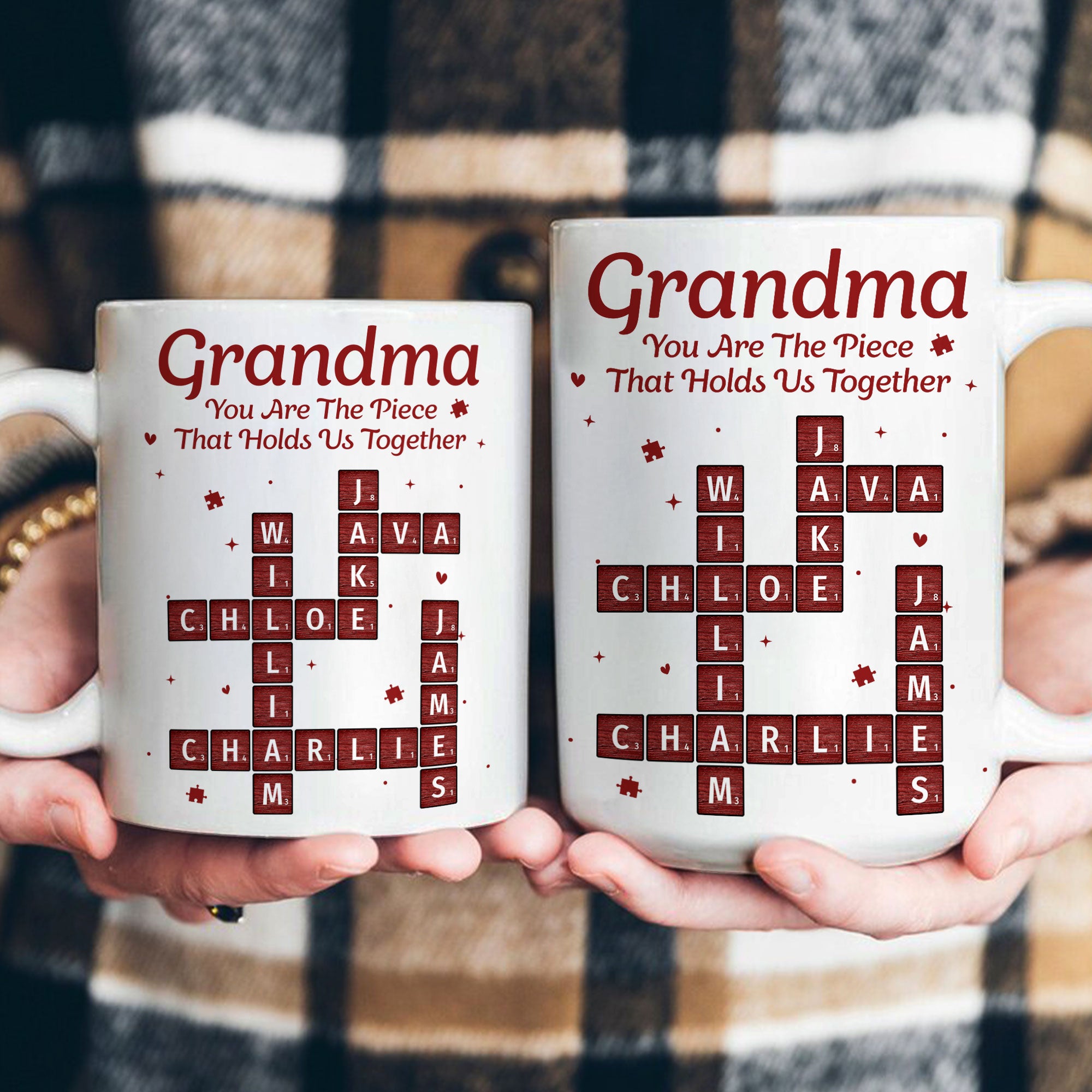 Introducing our stunning Personalized Mug, aptly titled "You Are The Piece That Holds Us Together". It embodies the bond and resemblance that holds an entire family together, creating a unique gift for those special to your heart. Our charming mug specifically pays homage to the extraordinary Grandmas out there, recognizing the pivotal role they play in holding the family together. This distinctive piece is not only a heartwarming everyday reminder over coffee but makes an exquisite present suitable for various productive occasions like Christmas, birthday or any event marking family union.
