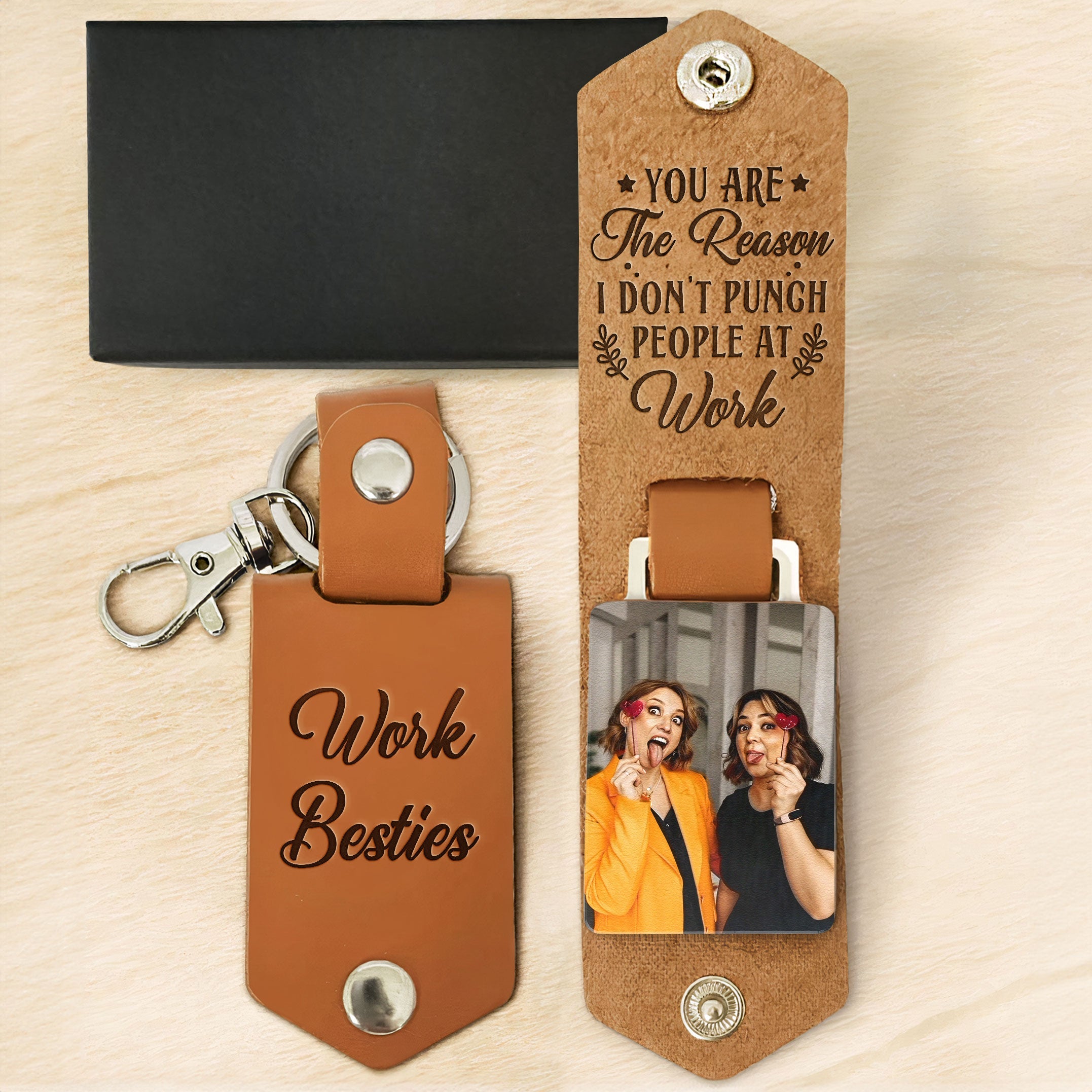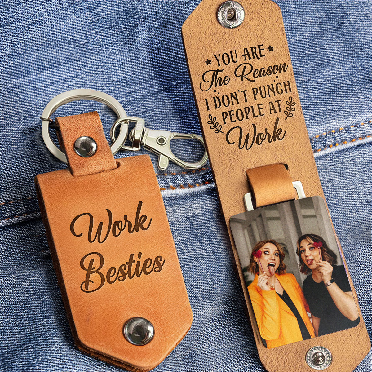 Express your appreciation humorously with the "You Are The Reason I Don't Punch People At Work" Personalized Leather Photo Keychain. This lighthearted keychain serves as a unique way to thank your coworkers. Personalize it for a special touch, making it a memorable and amusing token of gratitude. Whether it's for employee appreciation, coworker gifts, or just a fun way to acknowledge someone's role in maintaining workplace harmony, this keychain is a delightful choice. Show your thanks with a touch of humor, letting them know they are the reason for your workplace tranquility.