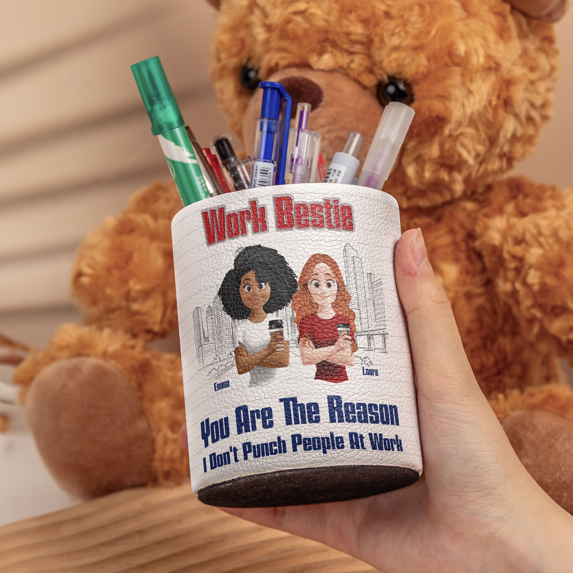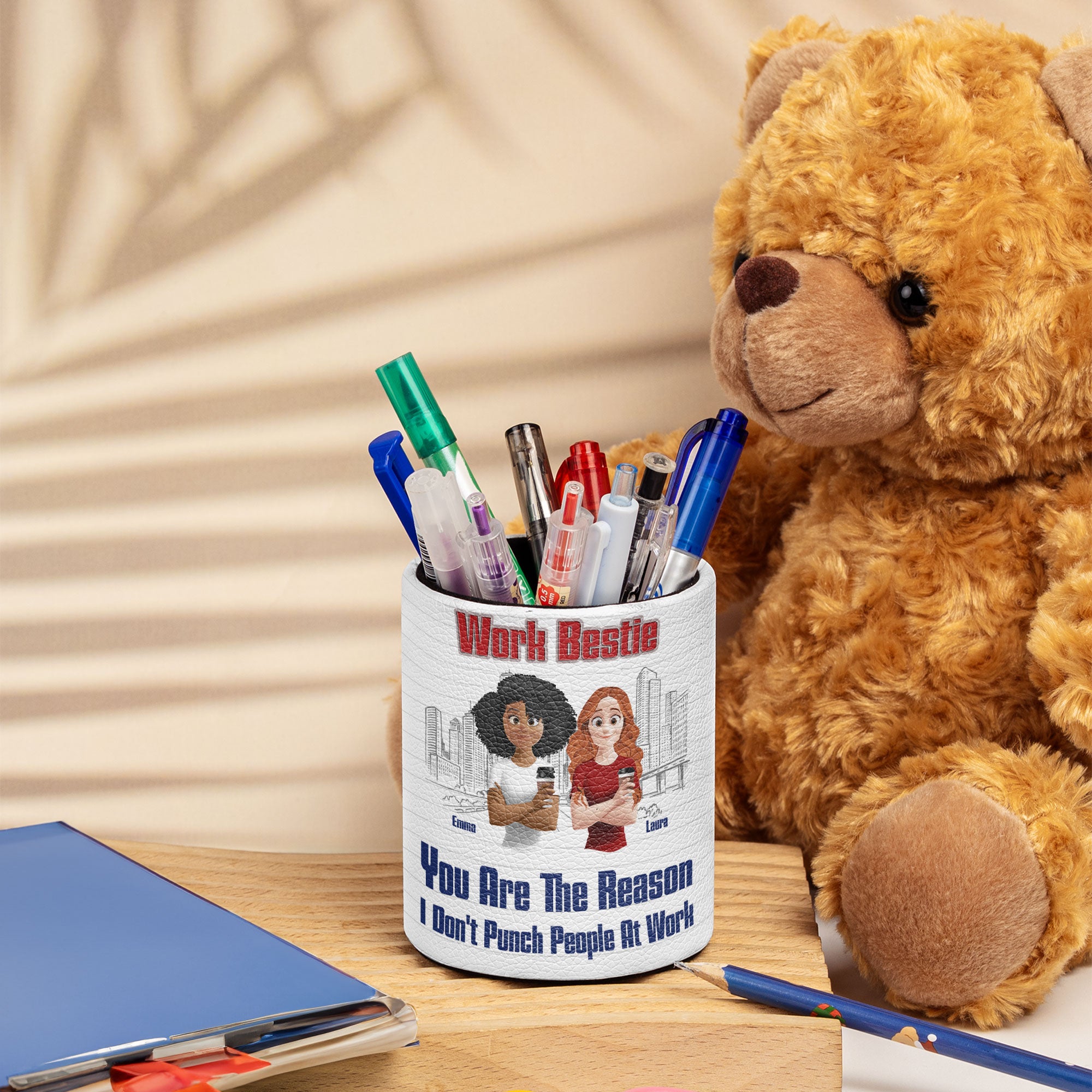Add a touch of humor to any workspace with the You Are The Reason I Don't Punch People At Work personalized pen holder. Perfect for keeping desks organized while delivering a daily dose of laughter, this sturdy and functional holder can be customized with a name, making it an ideal gift for coworkers, bosses, employees, teachers, or anyone who could use a little workplace motivation. A great choice for birthday gifts, appreciation gifts, office desk decor, Christmas gifts, or funny coworker gifts, it’s the perfect way to show gratitude while keeping things lighthearted!