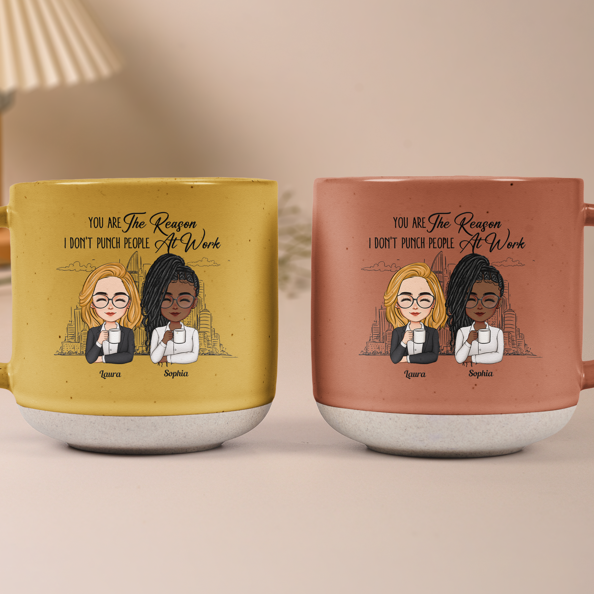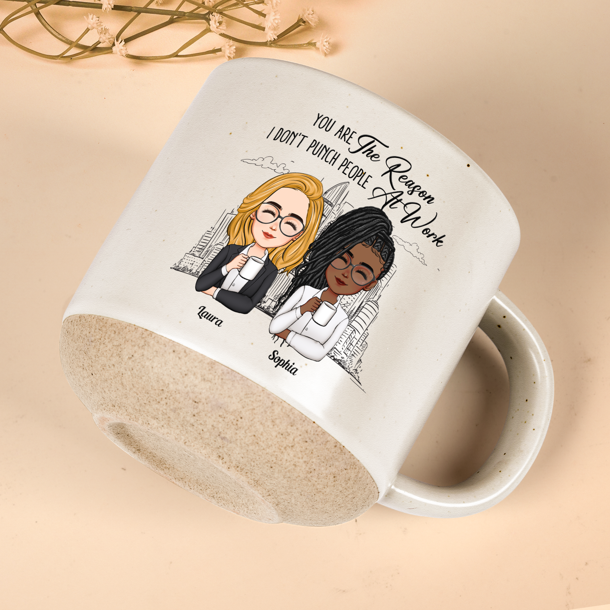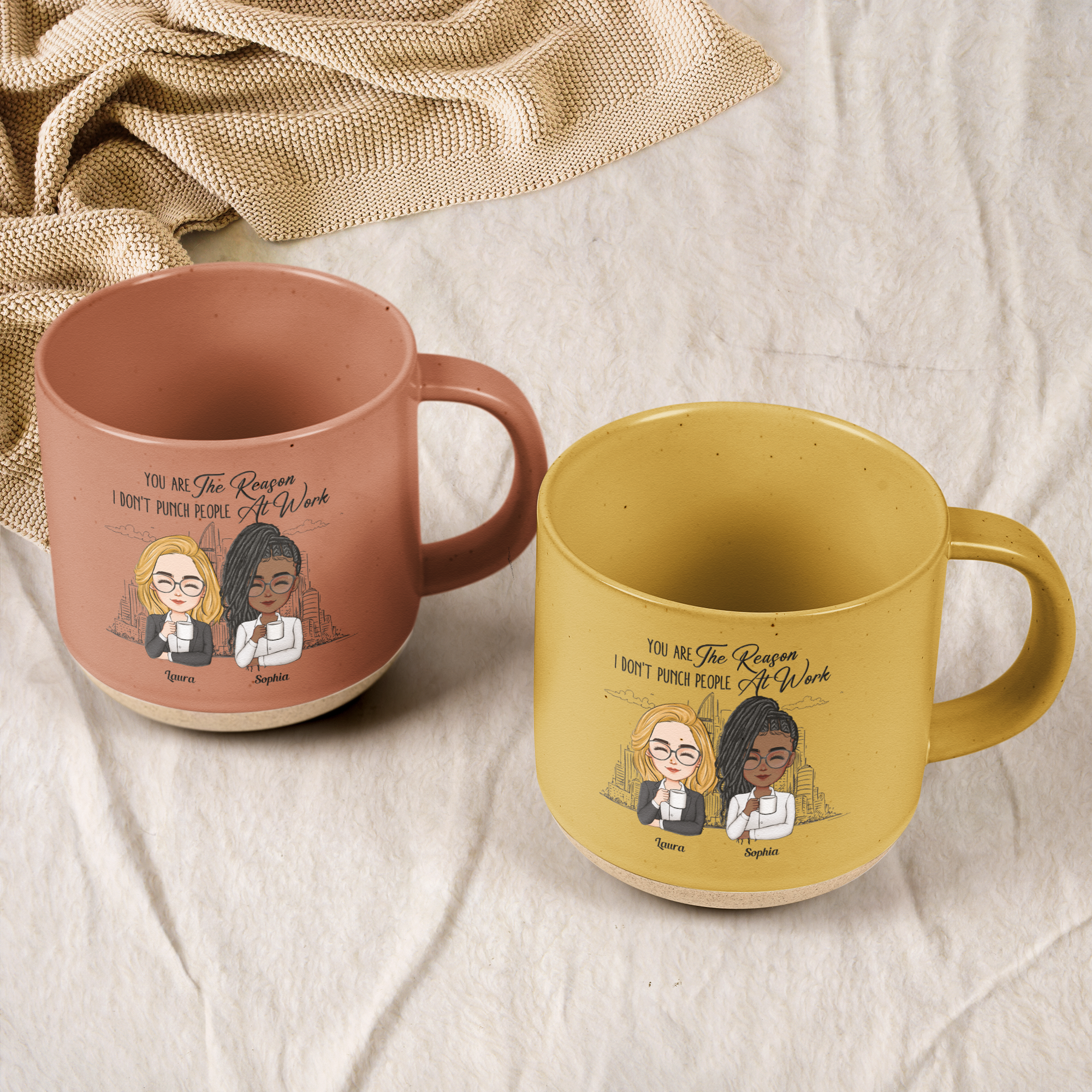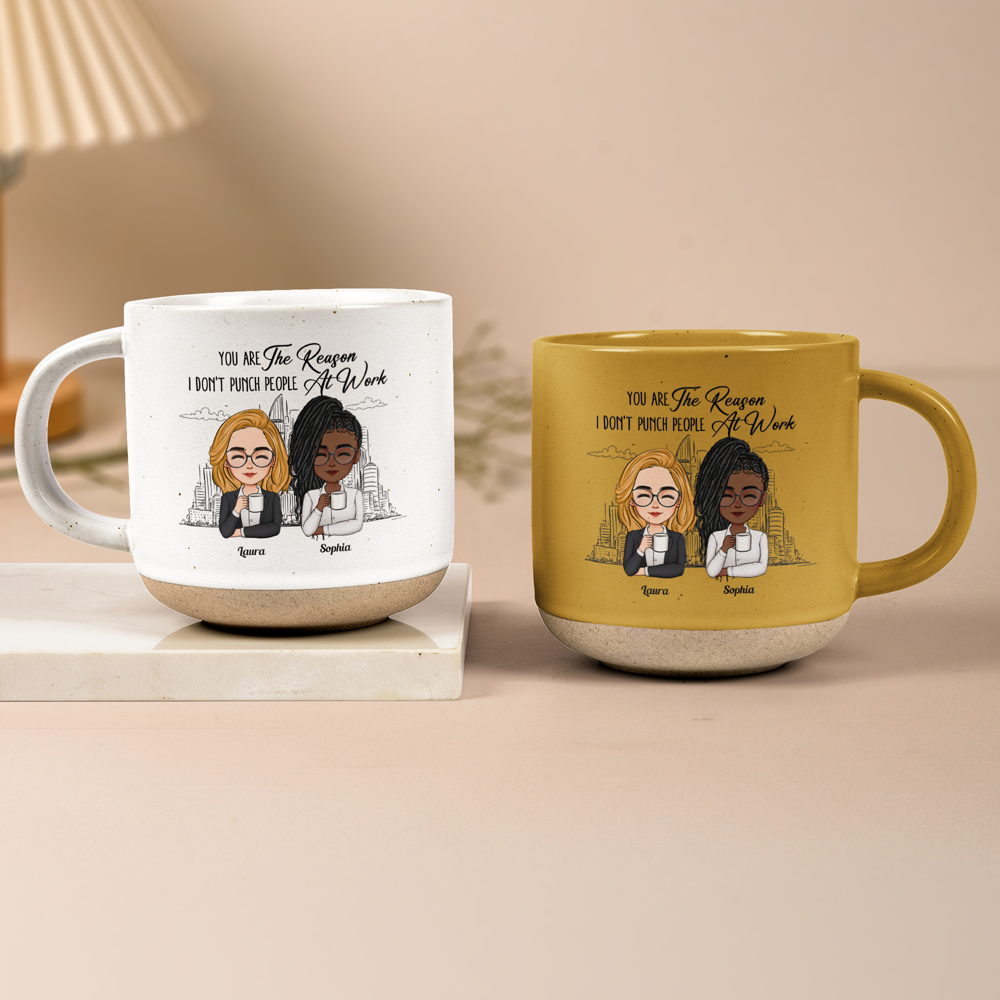 The You Are The Reason I Don't Punch People At Work - Personalized Pottery Mug is a humorous and light-hearted gift, perfect for brightening up your coworker’s or work friend’s day. This customized pottery mug can feature their name, adding a personal touch to this funny sentiment.