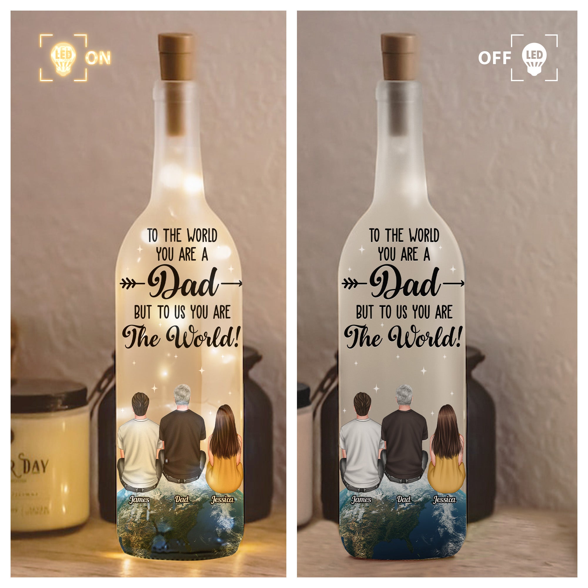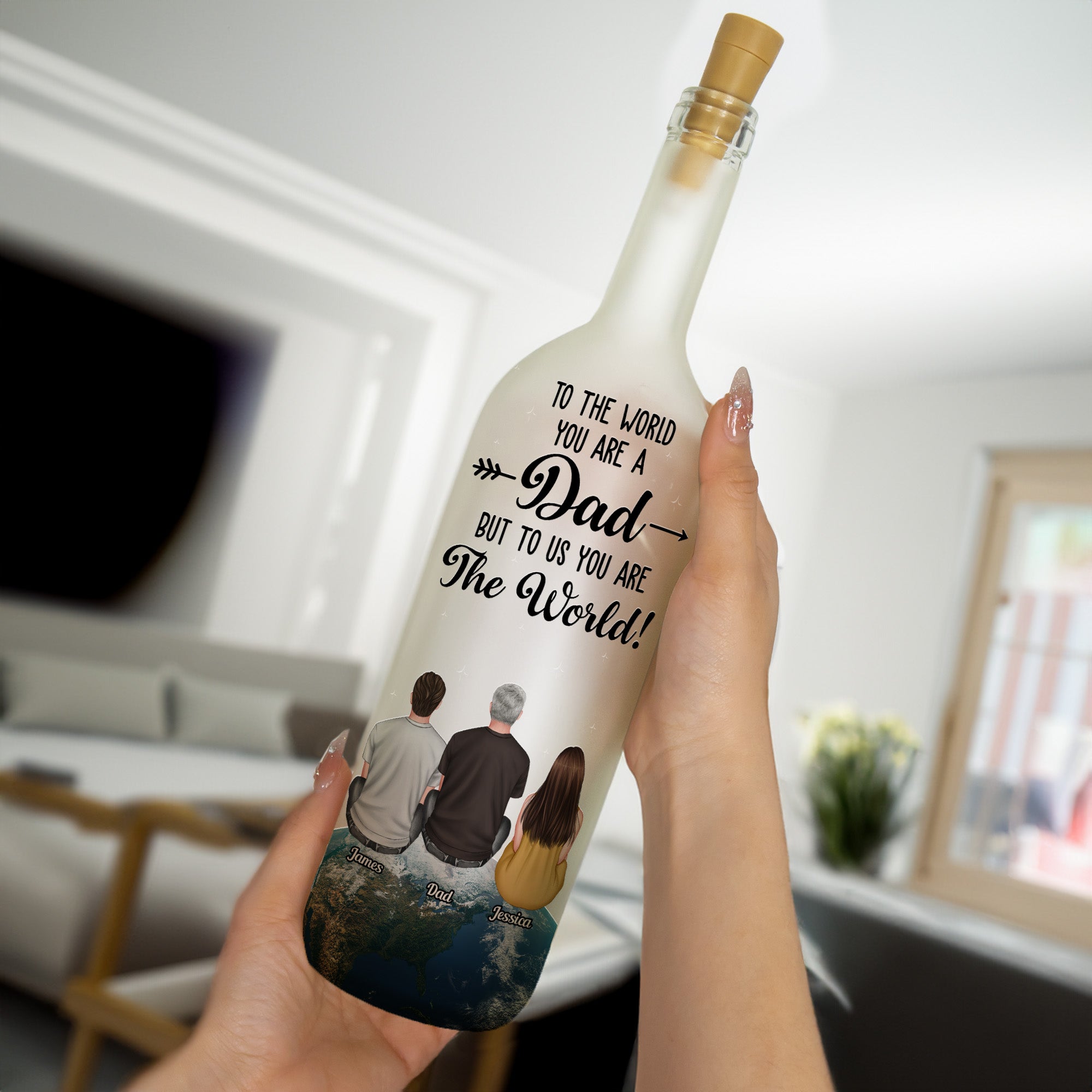 Illuminate your father's love with our Personalized Bottle Lamp for Father's Day. The significance of the bond between a dad and his family is beautifully conveyed, emphasizing the paramount role a father plays - not just as a dad, but as the world to you. The strong resemblance in love and connection is expertly encapsulated in this carefully crafted lamp. It's an ideal present for a dad from his family, heartwarmingly personalized for Father's Day or even birthdays.