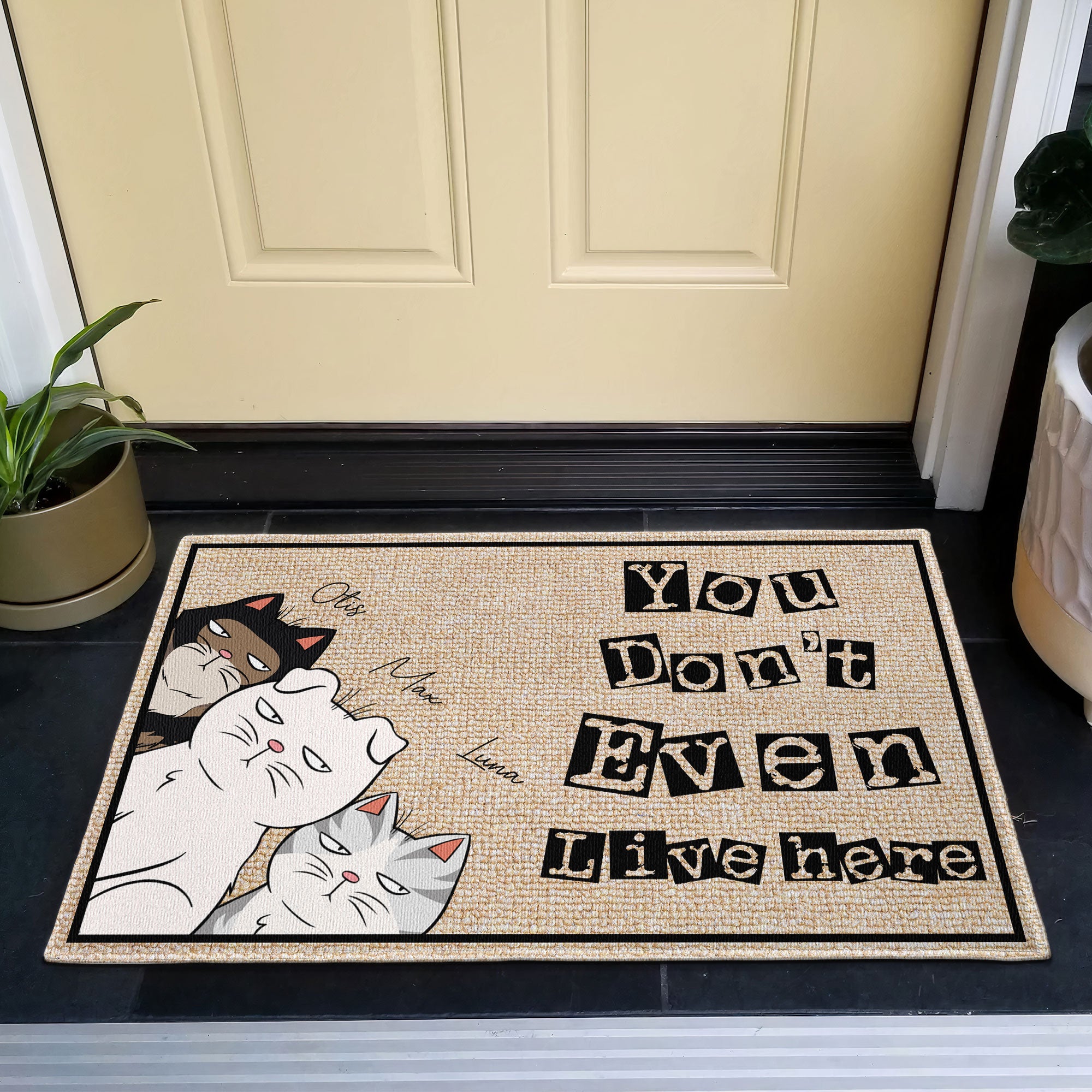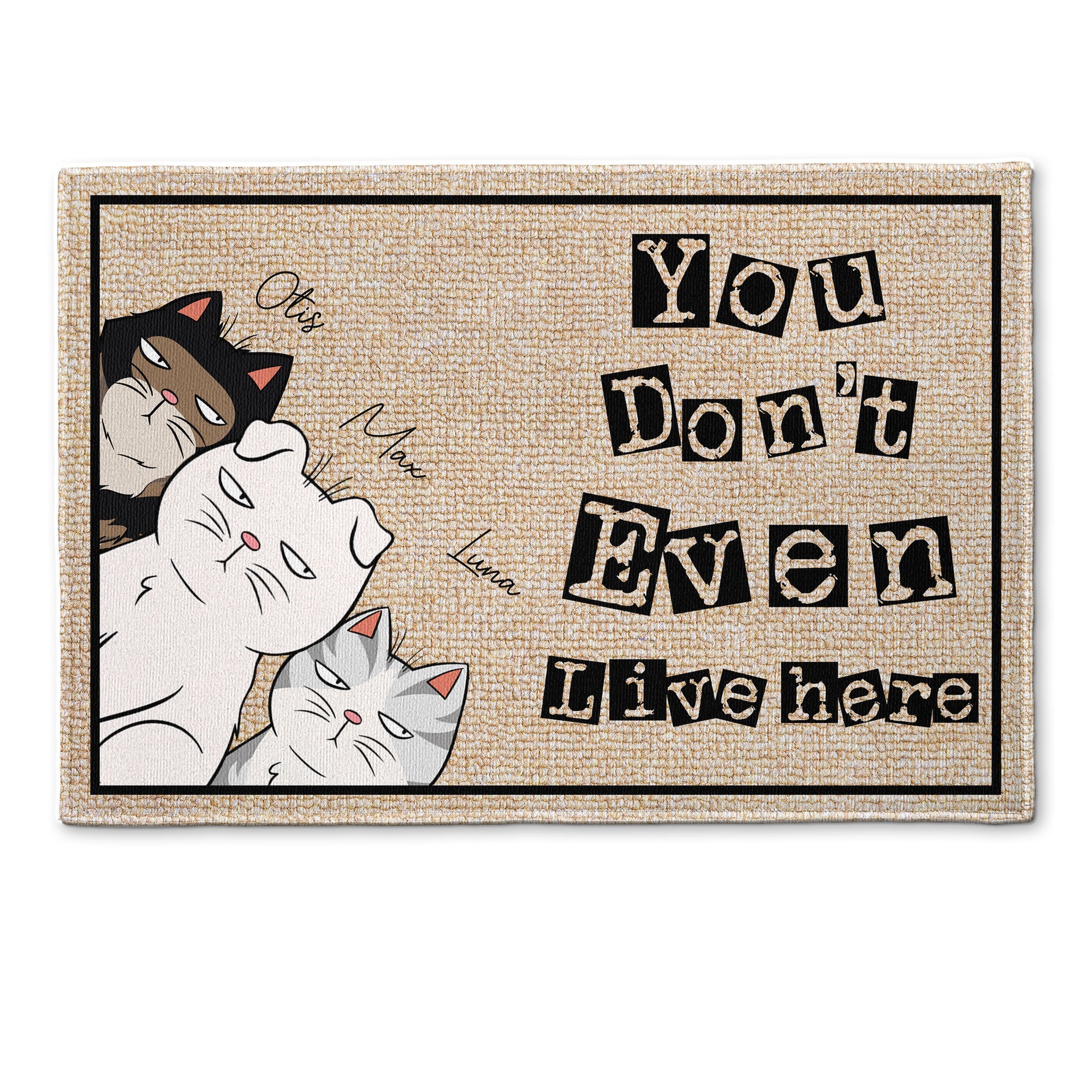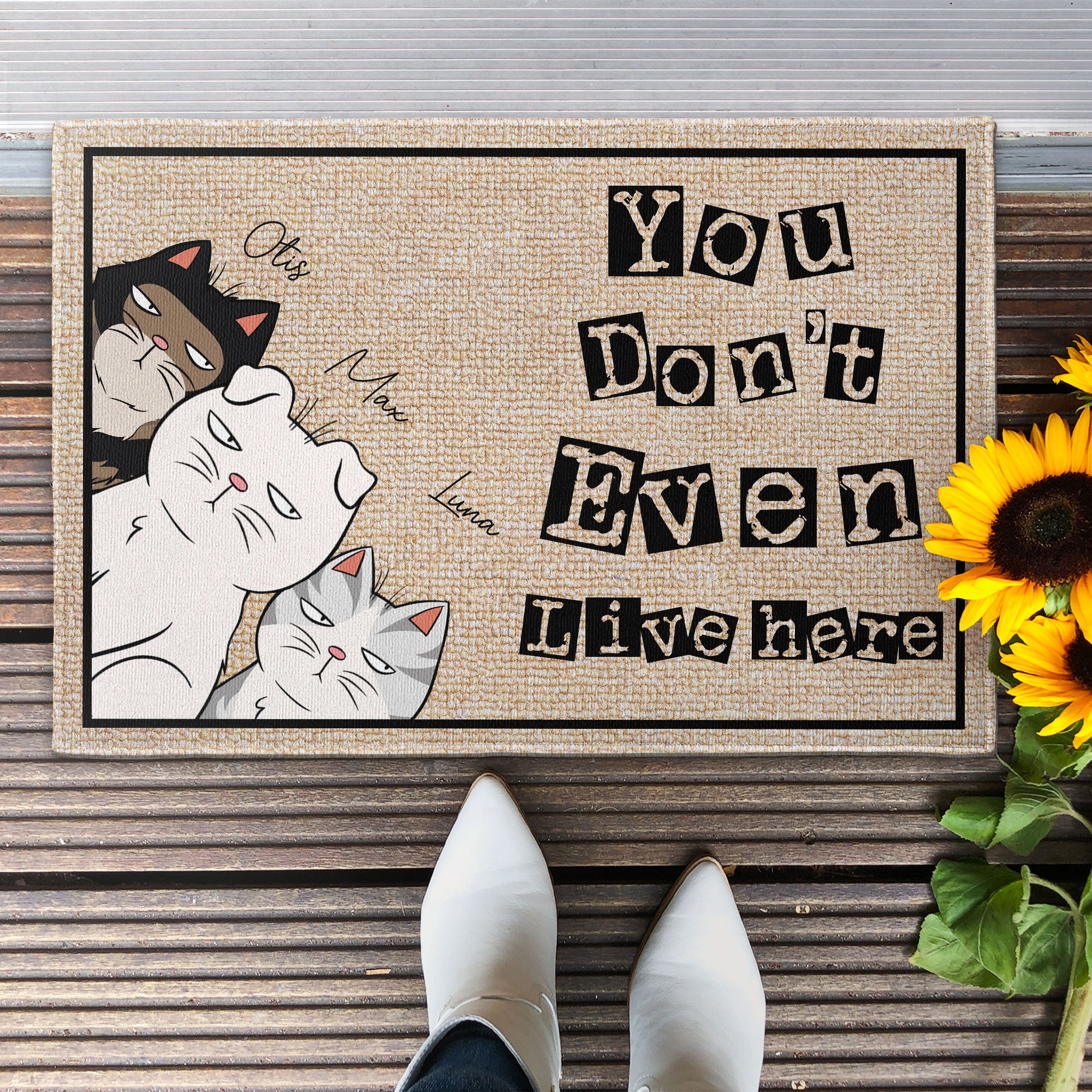 MESSAGE: Welcome guests with a smile using the "You Don't Even Live Here" personalized doormat, the purr-fect home decor for cat lovers.