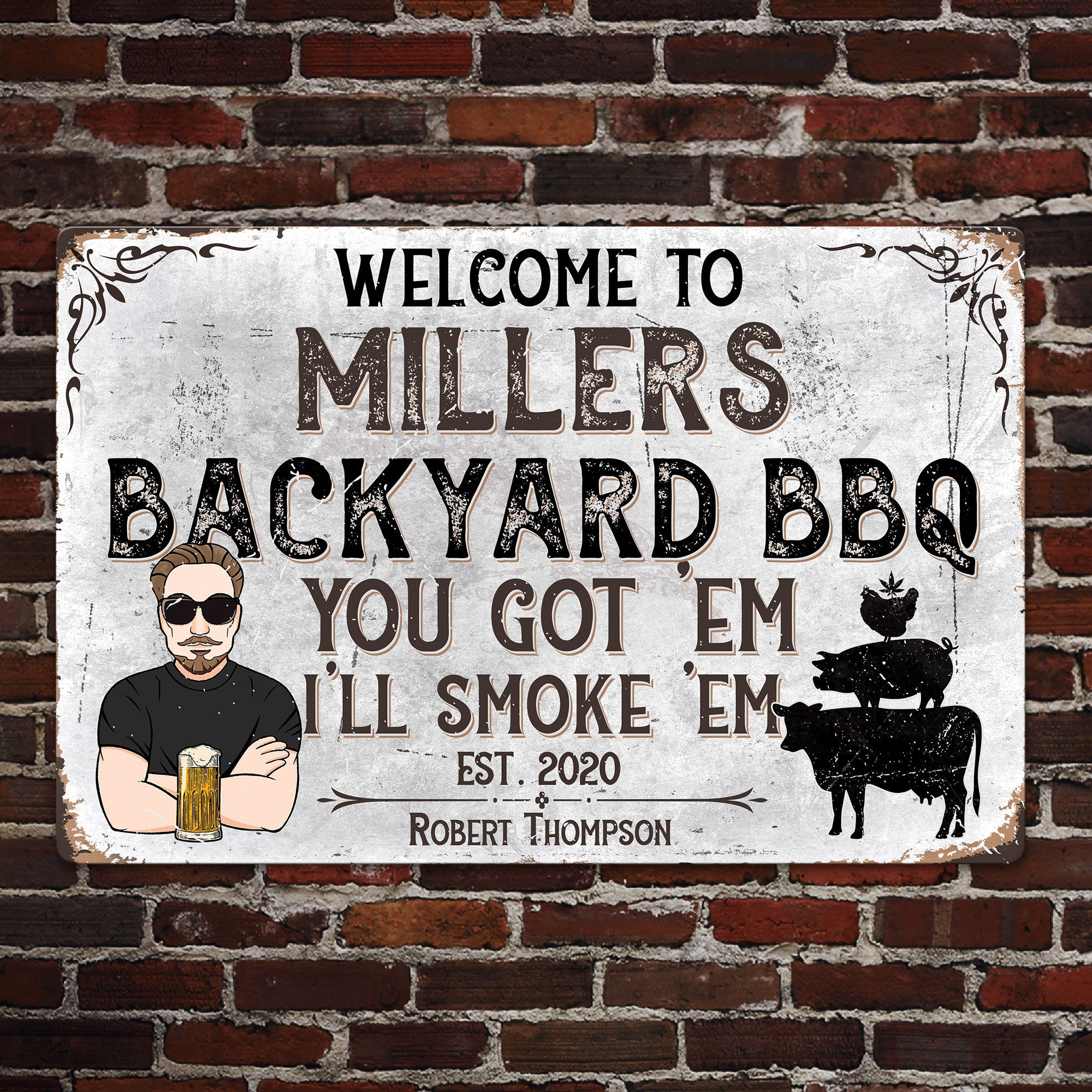 For the grilling enthusiast who lives for perfectly seared steaks, a custom metal sign makes a sizzling personalized BBQ gift. This meaty sign will get them pumped for the next backyard cookout. They'll crave tasty barbecue seeing their grilling passion proudly on display. Give as a Father's Day, birthday, housewarming or wedding gift to feed their BBQ obsession. It's a thoughtful way to recognize their mastery of smoked, grilled and sauced meats. With its sleek metal design and custom barbecue details, this sign celebrates the sacred summer pastime. For the barbecue buff who slathers their meats in sauce, a custom metal sign devoted to their smoky passion is perfectly on point. Any grill lover will appreciate this unique BBQ-themed wall art.