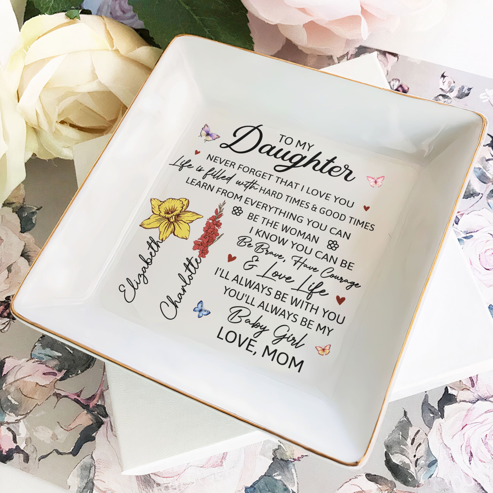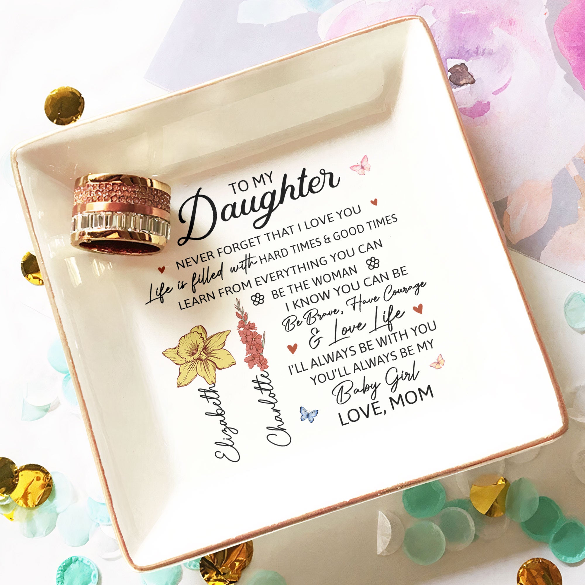 "You'll Always Be My Baby Girl" Personalized Jewelry Dish is a heartfelt gift for daughters from moms. This custom jewelry dish makes an ideal present for birthdays, graduations, or any special occasion. Whether you're celebrating Christmas, a birthday, or simply want to remind her of your love, this beautiful jewelry dish is a meaningful keepsake. Perfect for holding rings, necklaces, and small treasures, it's a gift that combines both practicality and sentiment.
