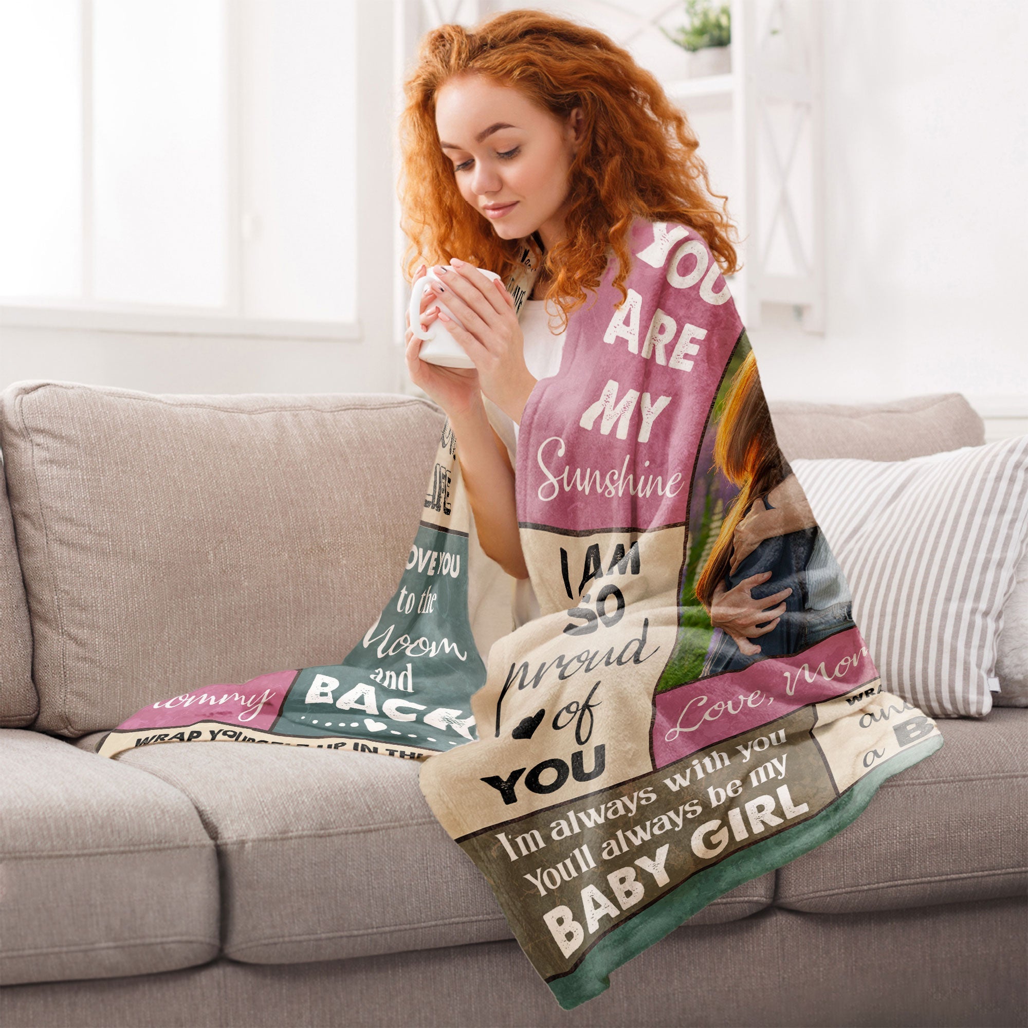 Let's wrap up in this Personalized Photo Blanket. This cozy and custom blanket features positive affirmations, fostering a nurturing environment for your son, daughter, baby girl, or baby boy.