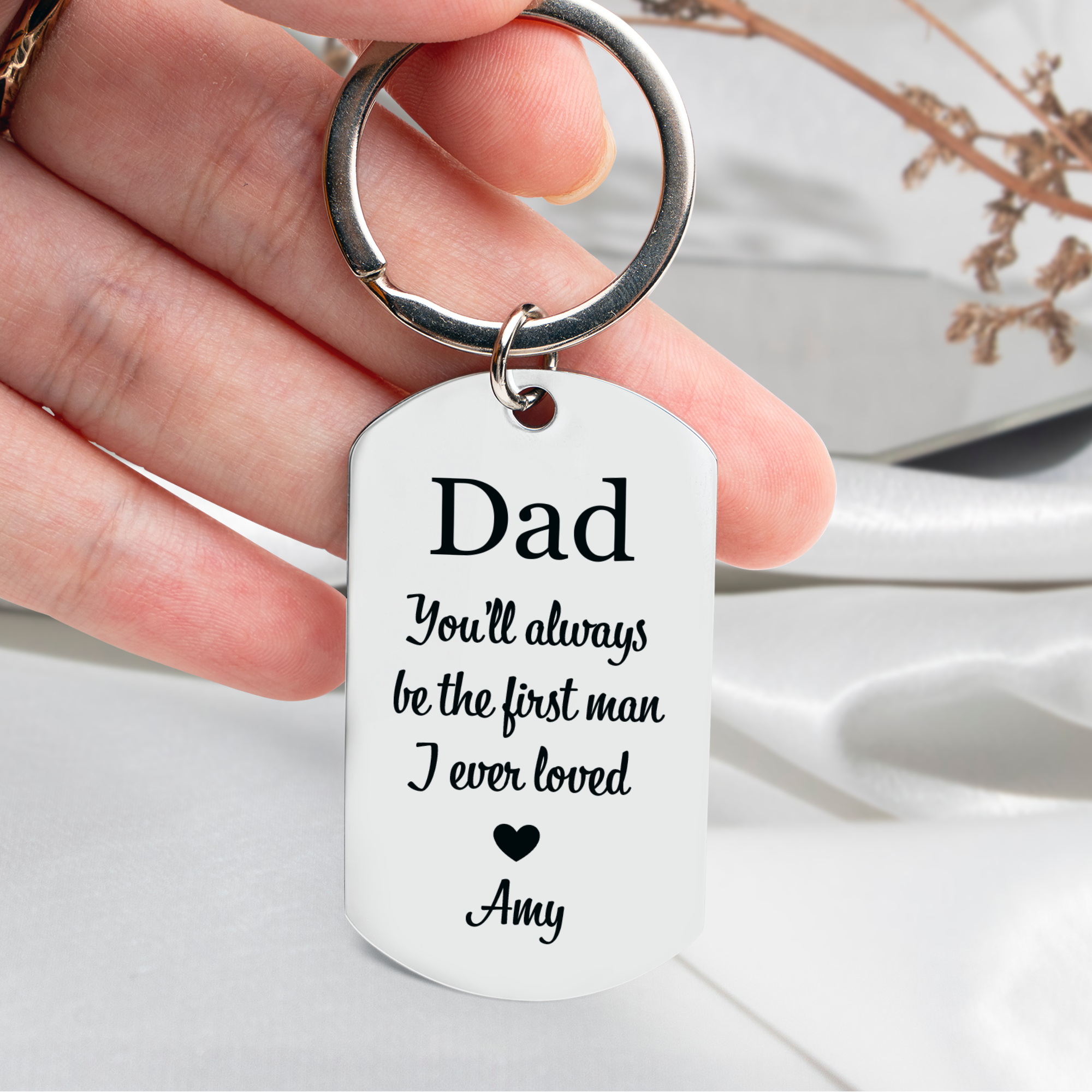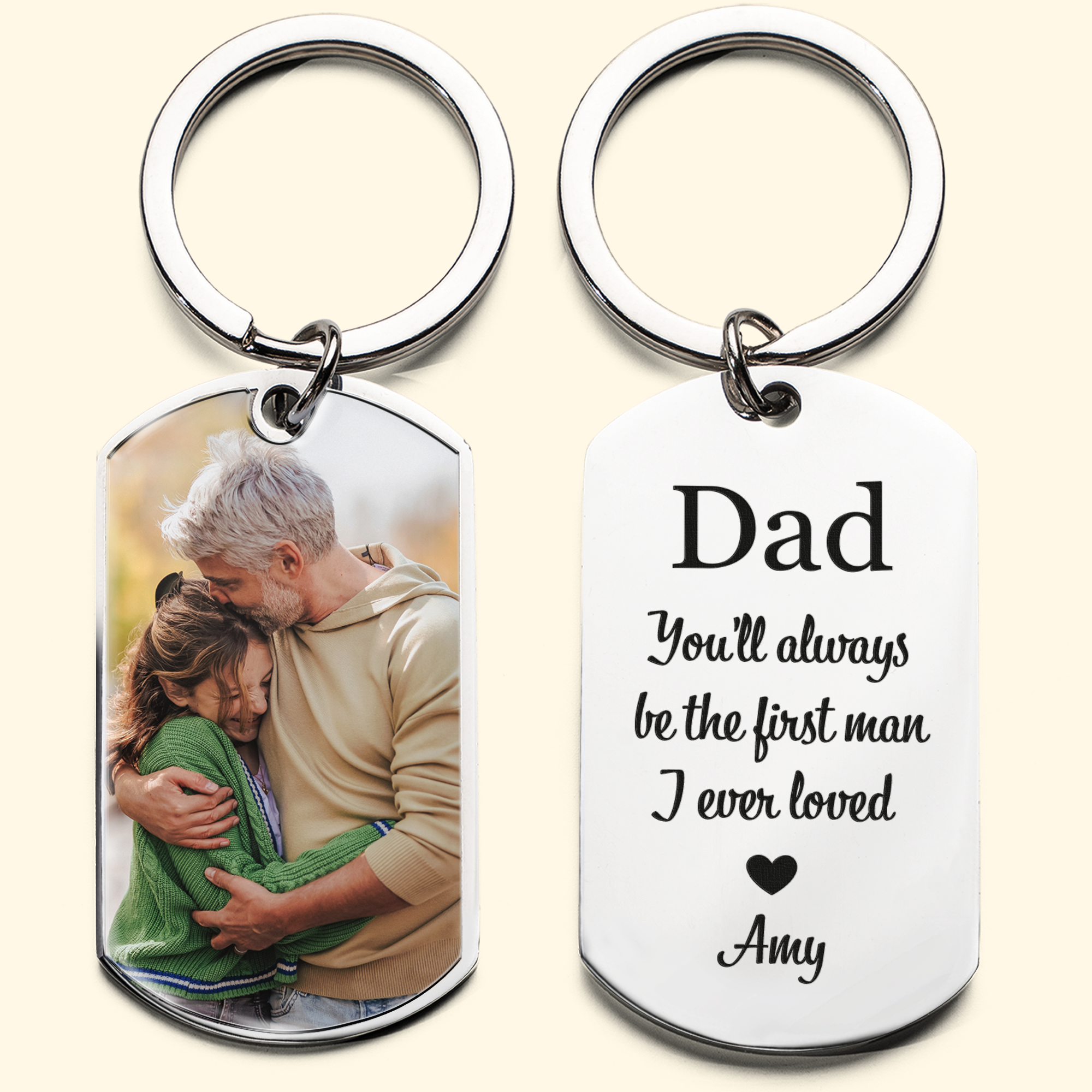 Introducing our "You'll Always Be The First Man I Loved" Personalized Stainless Steel Photo Keychain – a timeless and sentimental accessory crafted for the special men in your life. Customize it with your favorite photo and their names, creating a truly personal keepsake. Crafted with high-quality stainless steel, this keychain is not just a practical item but a heartfelt reminder of love and cherished memories. The option to customize your own text adds a personal touch, making it the perfect gift for daddy, grandpa, or any cherished family member or friend. Carry your most treasured moments wherever you go with this durable and meaningful personalized keychain.