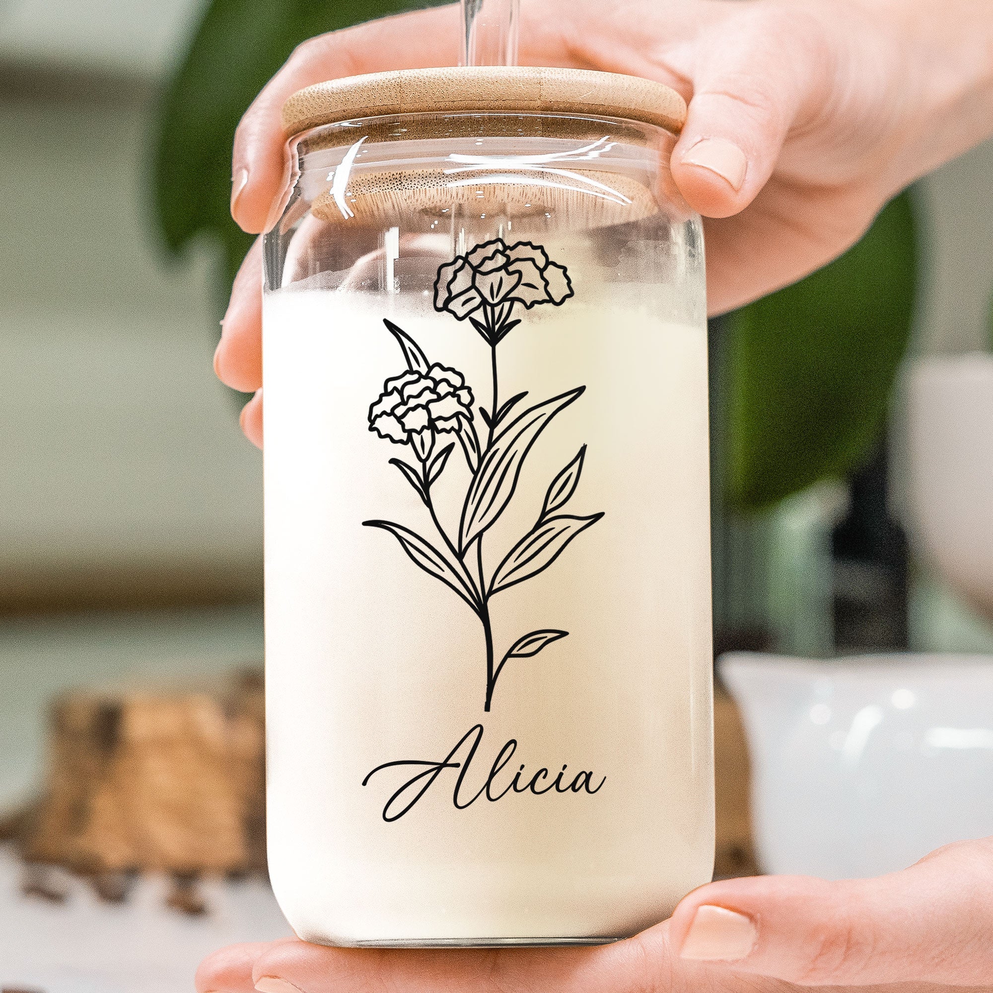 Introducing our Mom Glass Can, a heartwarming fusion of botanical beauty and personalized affection. This elegant glass can is adorned with the delicate charm of your mom's birth flower, creating a visual symphony of nature's grace. Customize it further with her name, transforming this vessel into a truly unique and sentimental gift.
