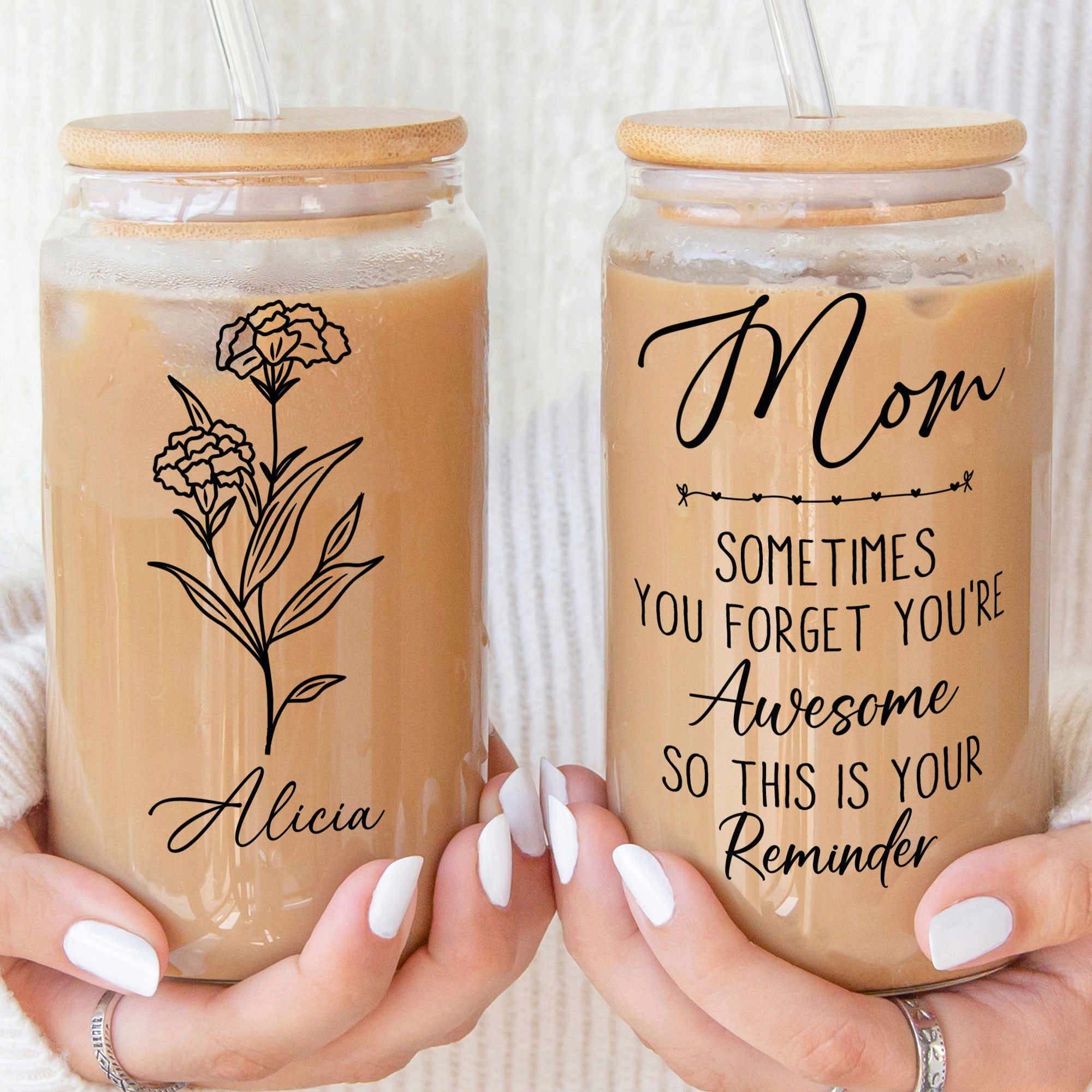 Embrace the essence of motherhood with the empowering quote, "Sometimes you forget you're awesome so this is your reminder," print onto the glass. Ideal for Mother's Day or as a special gift for grandmothers, this personalized glass can is more than just a container; it's a daily affirmation of her remarkable presence. Celebrate the extraordinary women in your life with this personalized and inspiring gift, a token of appreciation that beautifully combines botanical elegance with words of encouragement.