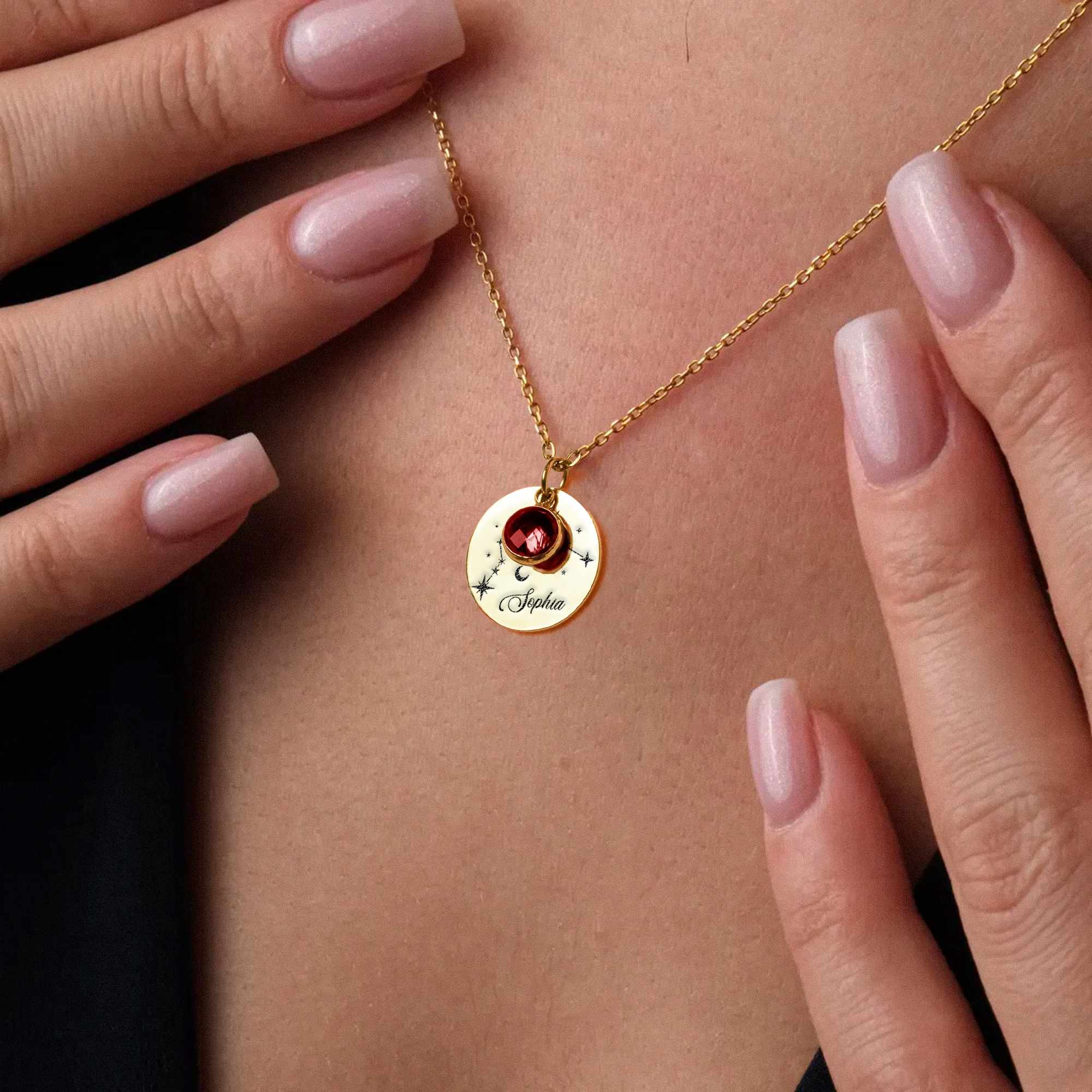 The Personalized Birthstone Necklace with a custom birthstone, zodiac sign, and name is the perfect gift to celebrate the special women in your life—whether it’s for friends, a bestie, sisters, or mom. This thoughtful piece elegantly combines her unique astrological symbol and birthstone, reflecting her individuality in a beautiful way. With her name engraved, this necklace becomes a one-of-a-kind keepsake she'll cherish.