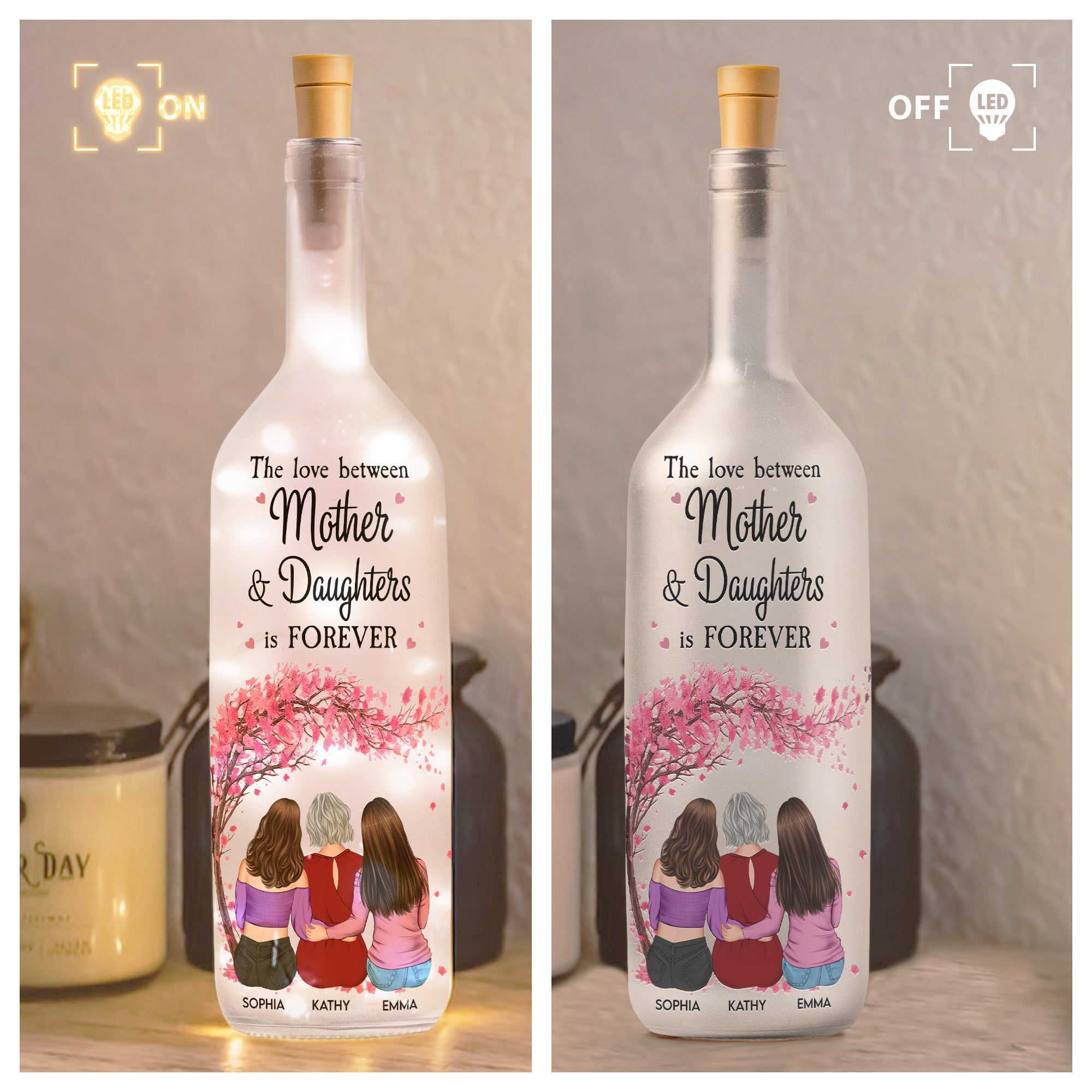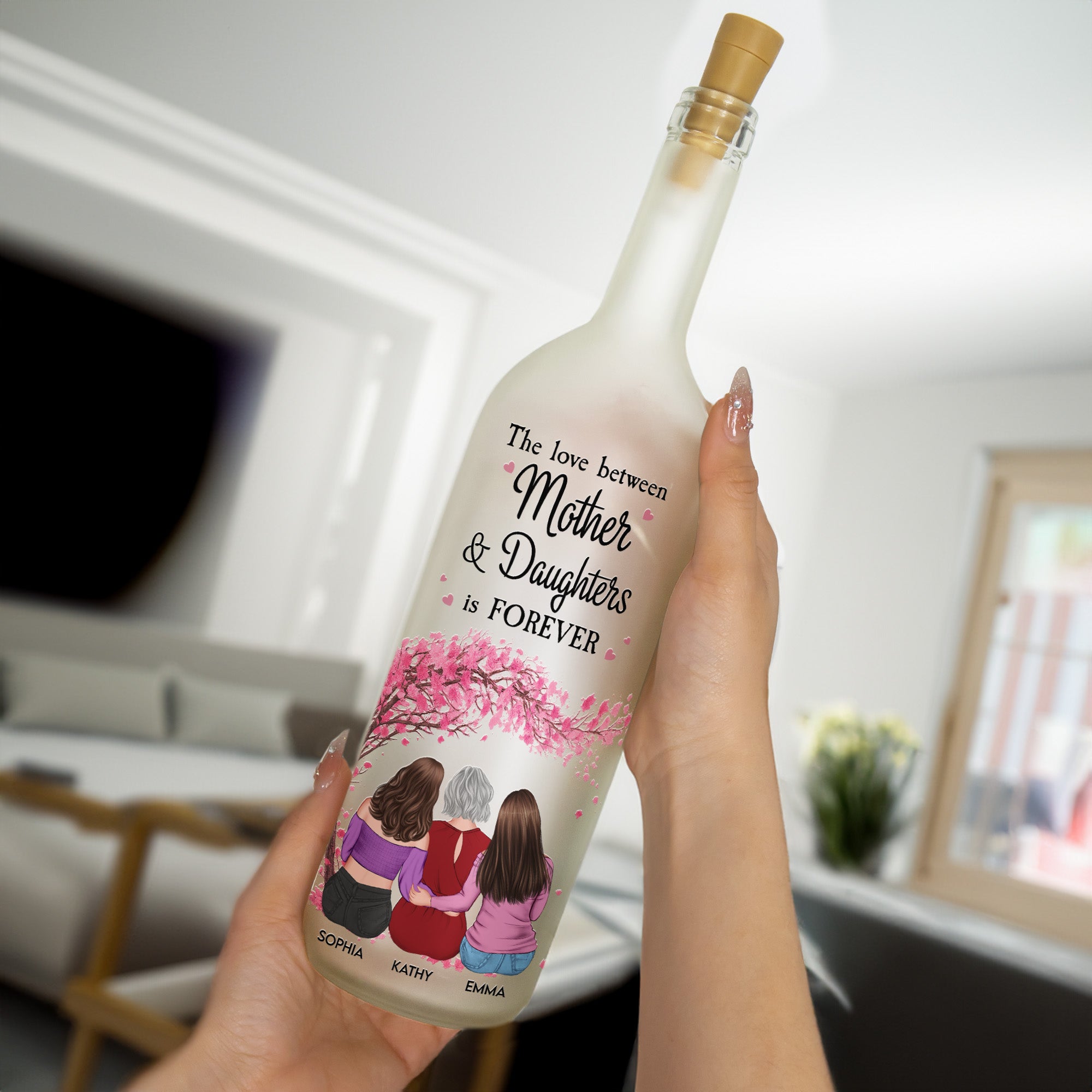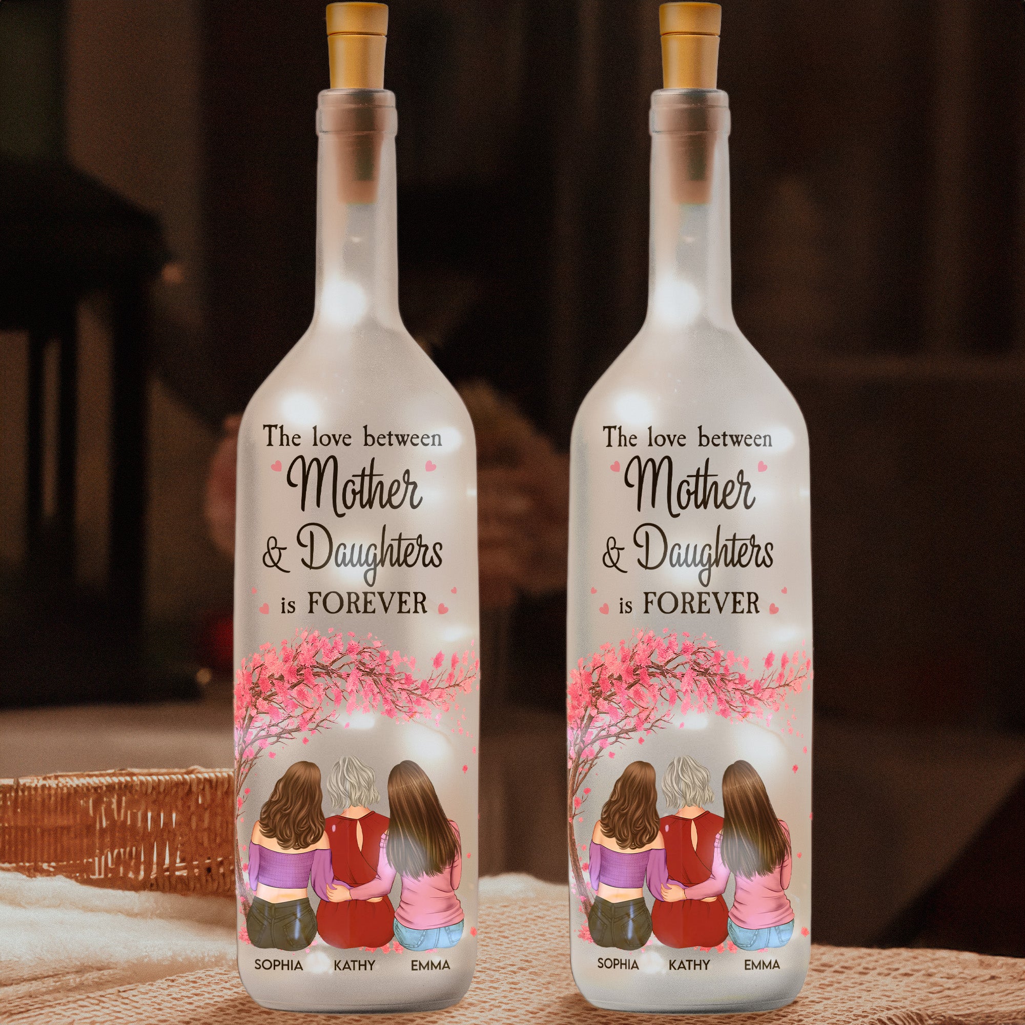 Presenting the Personalized Bottle Lamp titled "The Love Between Mother & Daughters Is Forever," designed specifically to attest to the everlasting bond shared in a family. It's a beautiful Bottle Lamp that communicates the infinite love a mother shares with her children wonderfully. Ideal for occasions like Mother's Day, it would also fit joyous celebrations such as birthdays, Christmas, anniversaries, or really any occasion. It's perfect for expressing your sentiments while broadening the gift appeal.