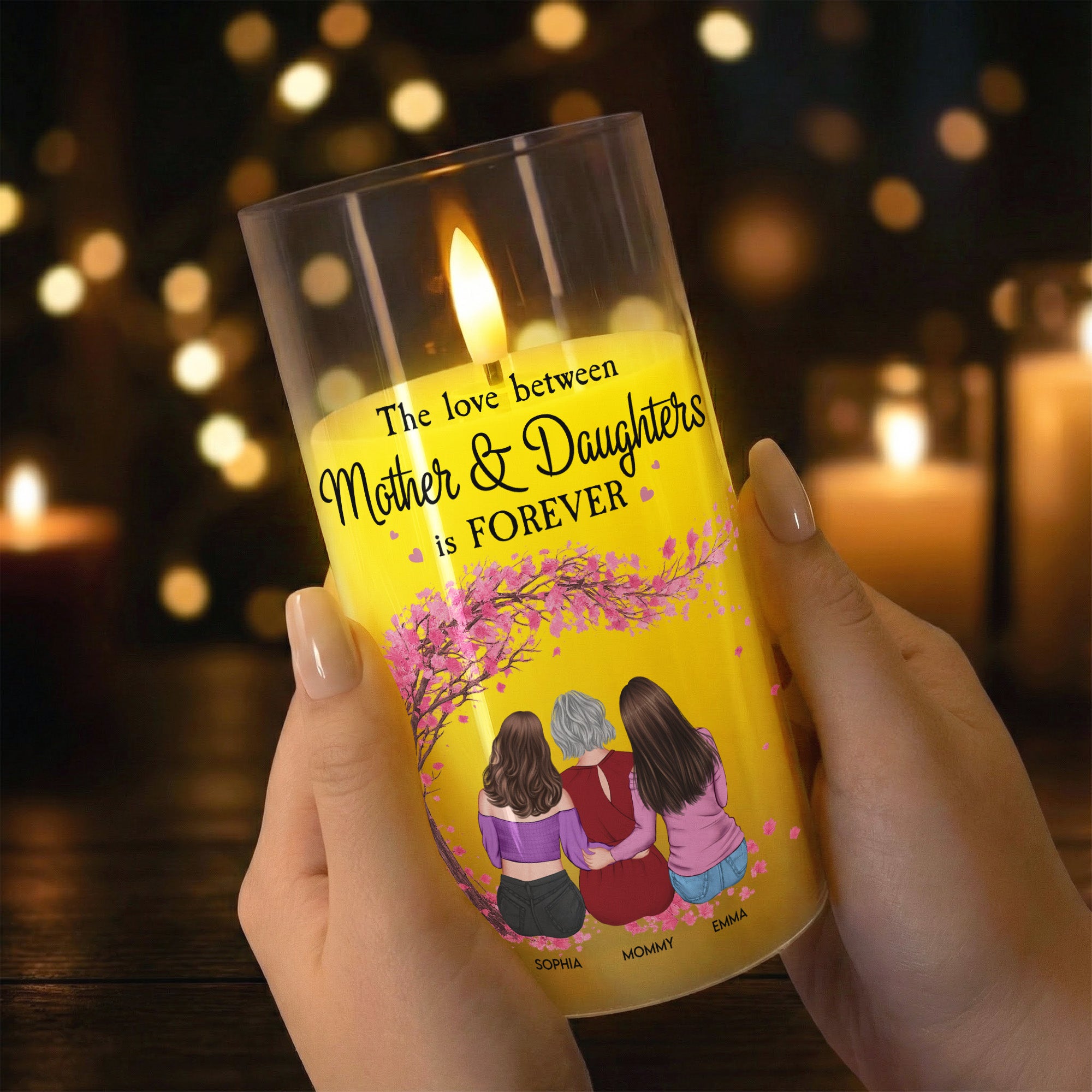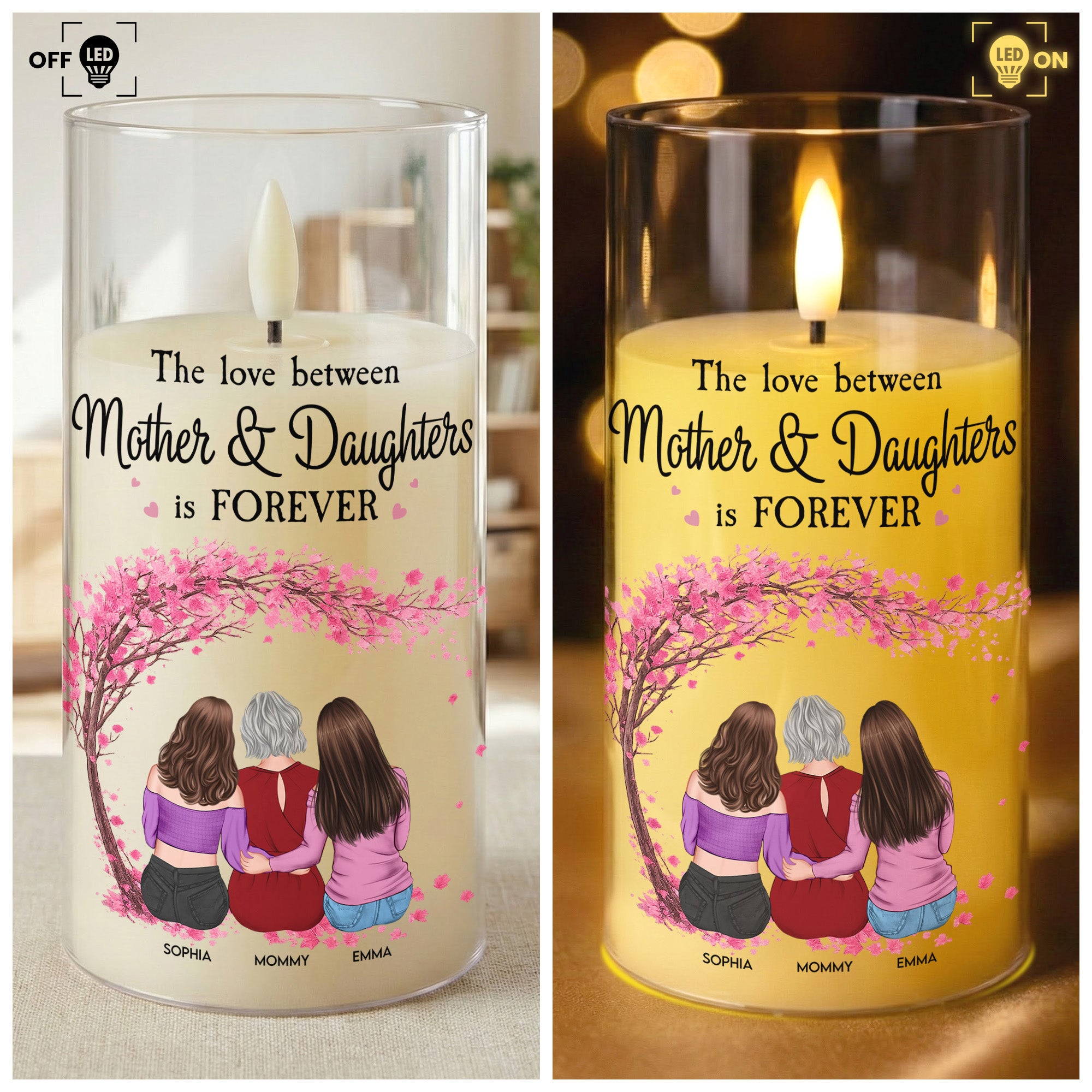Perfect for Mother's Day, birthdays, Christmas, anniversaries or any occasion when you want to express your affection and admiration. Reflecting the strong and eternal familial attachment, it articulates the love between Mothers and their children, making it an exquisite emblem of this precious bond. Flicker your love through this astonishing LED Candle Light and let it ignite a glow in your loved one's heart. Hurry and add this unique gift to your cart for your next joyous occasion, because the love between Mother and Daughters is forever.